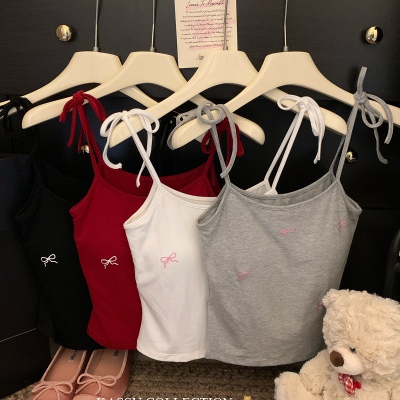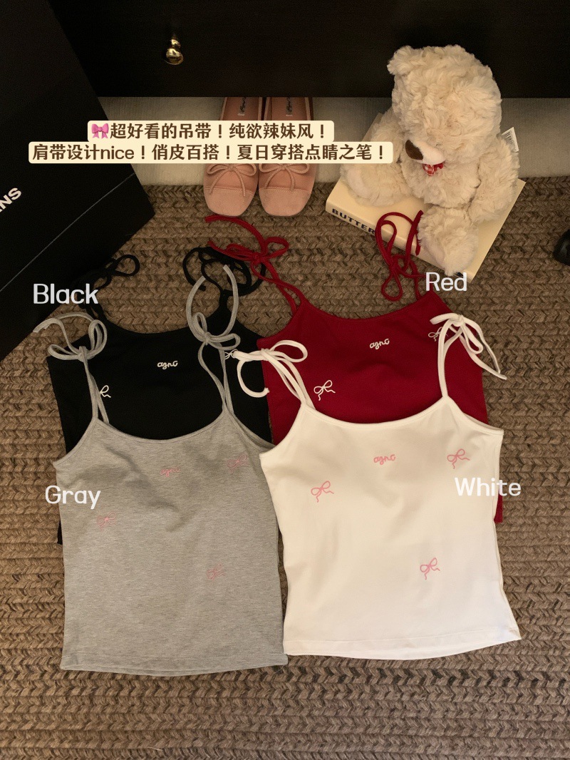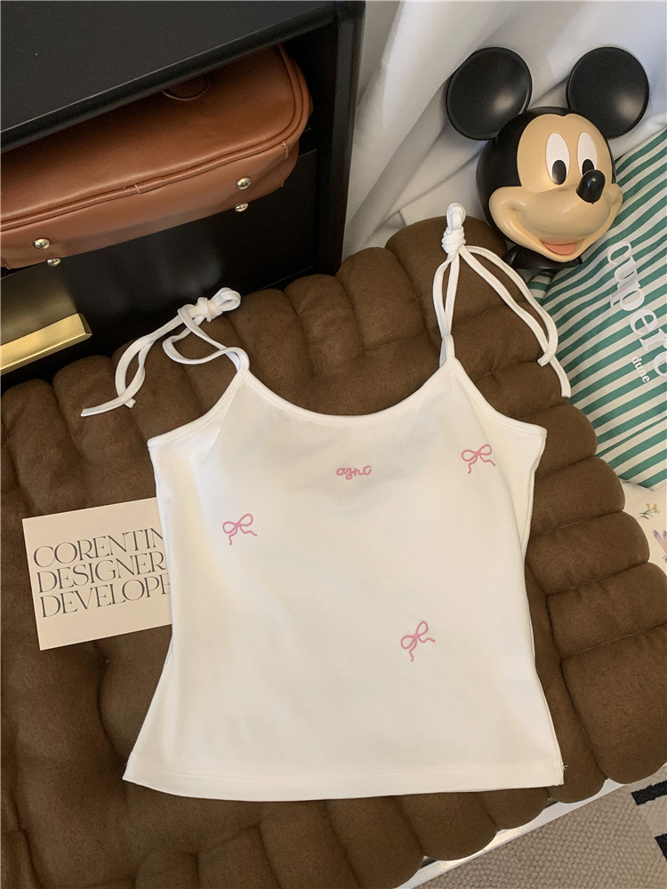 纯欲辣妹露肩蝴蝶结刺绣系带吊带背心带胸垫修身外穿内搭上衣