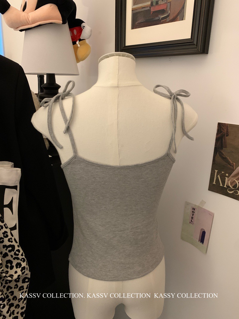 主面料成分: 棉 产品类别: 吊带背心 产地: 汕头 货号: 6896# 颜色: 白色,黑色,灰色,红色 尺码: 均码 是否跨境出口专供货源: 否 款式细节: 蝴蝶结,棉垫 款式: 吊带 风格: 性感 重量: 0.1 kg/件