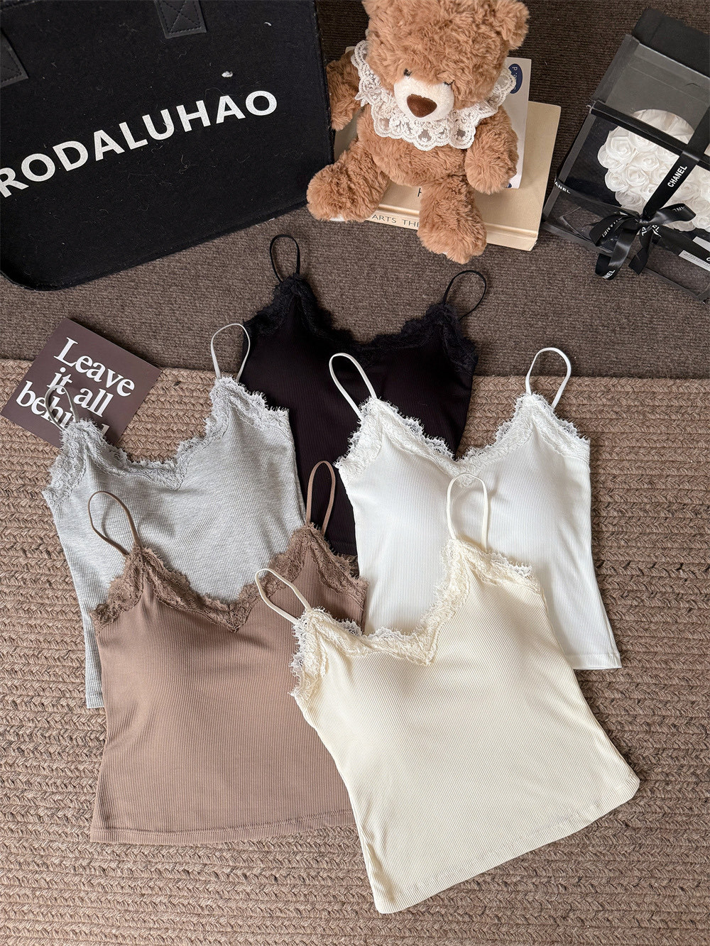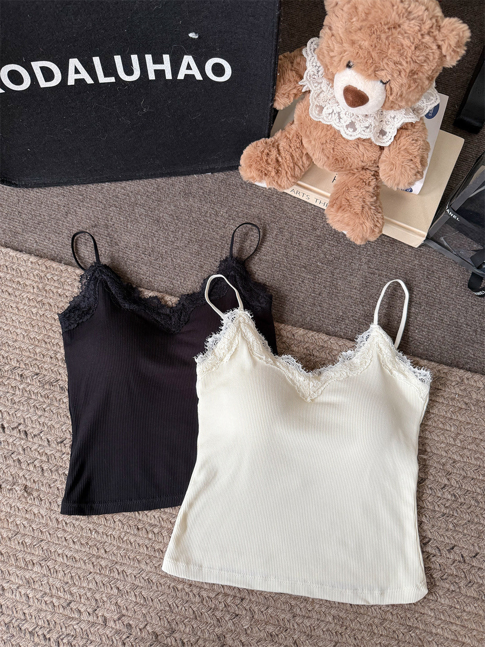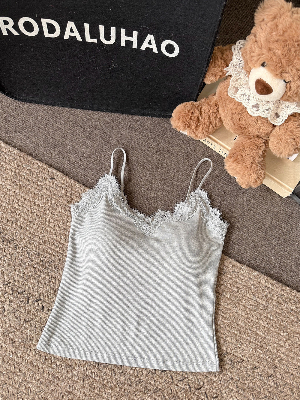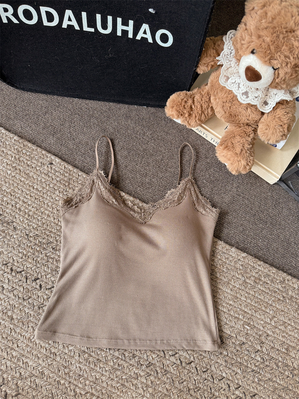 主面料成分: 人棉 产品类别: 吊带背心 产地: 汕头 货号: 6971 颜色: 白色,杏色,灰色,咖色,黑色 尺码: 均码 款式细节: 海绵垫,蕾丝花边 款式: 吊带 风格: 甜美 领型: V领 重量: 0.1 kg/件