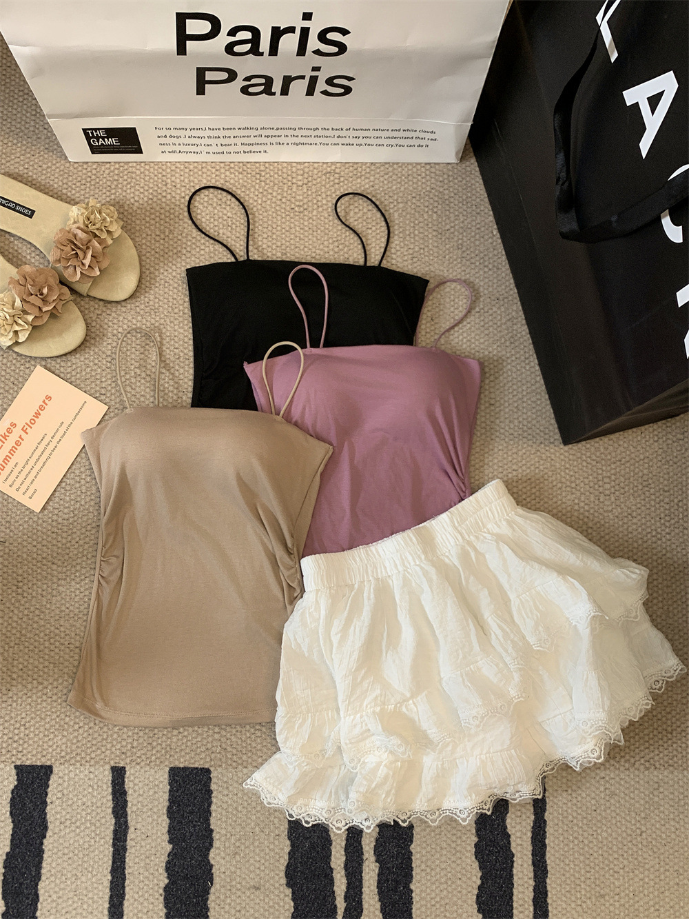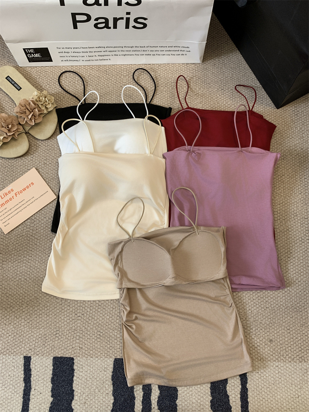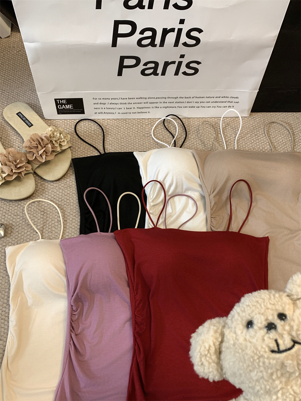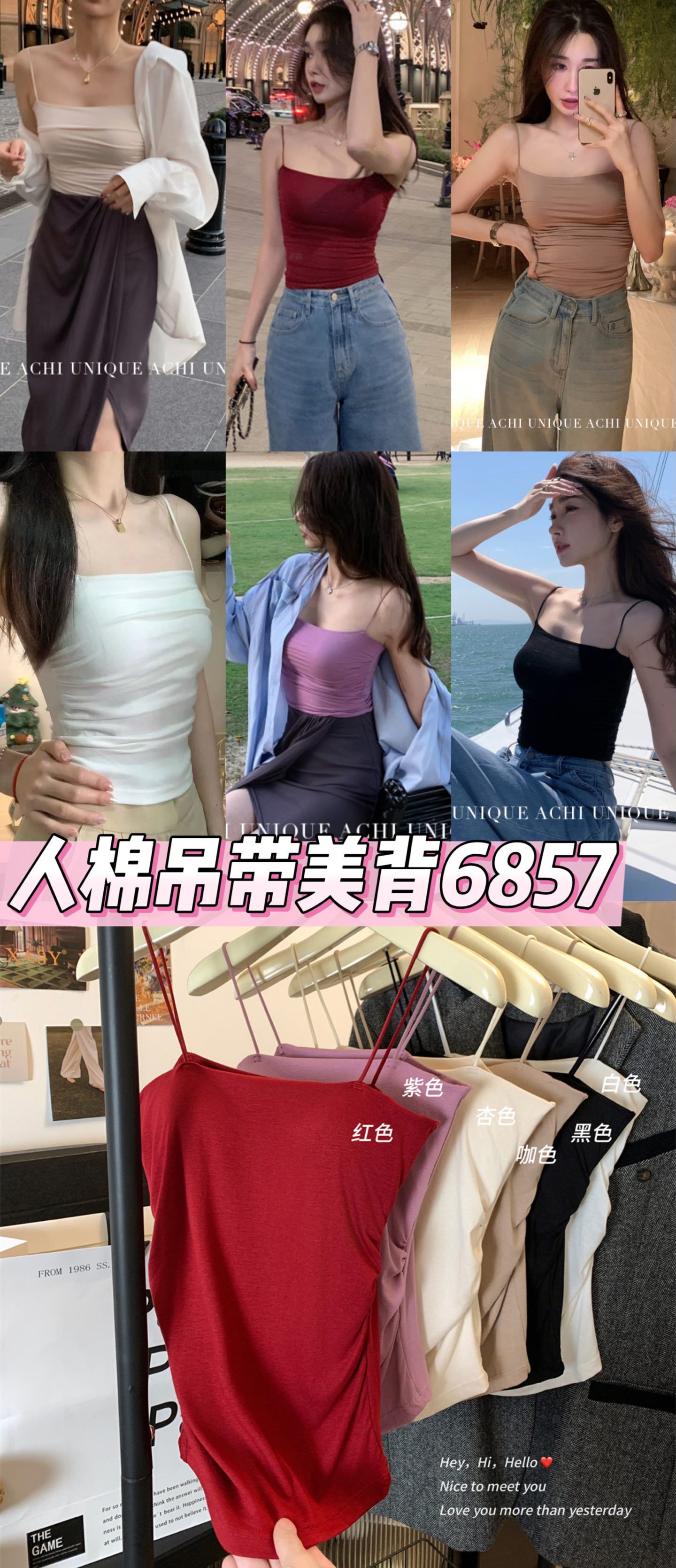 主面料成分: 人棉 产品类别: 吊带背心 产地: 汕头 货号: 6857 颜色: 白色,黑色,红色,紫色,杏色,咖色 尺码: 均码 款式细节: 棉垫 款式: 吊带 风格: 性感 领型: 一字领 重量: 0.1 kg/件