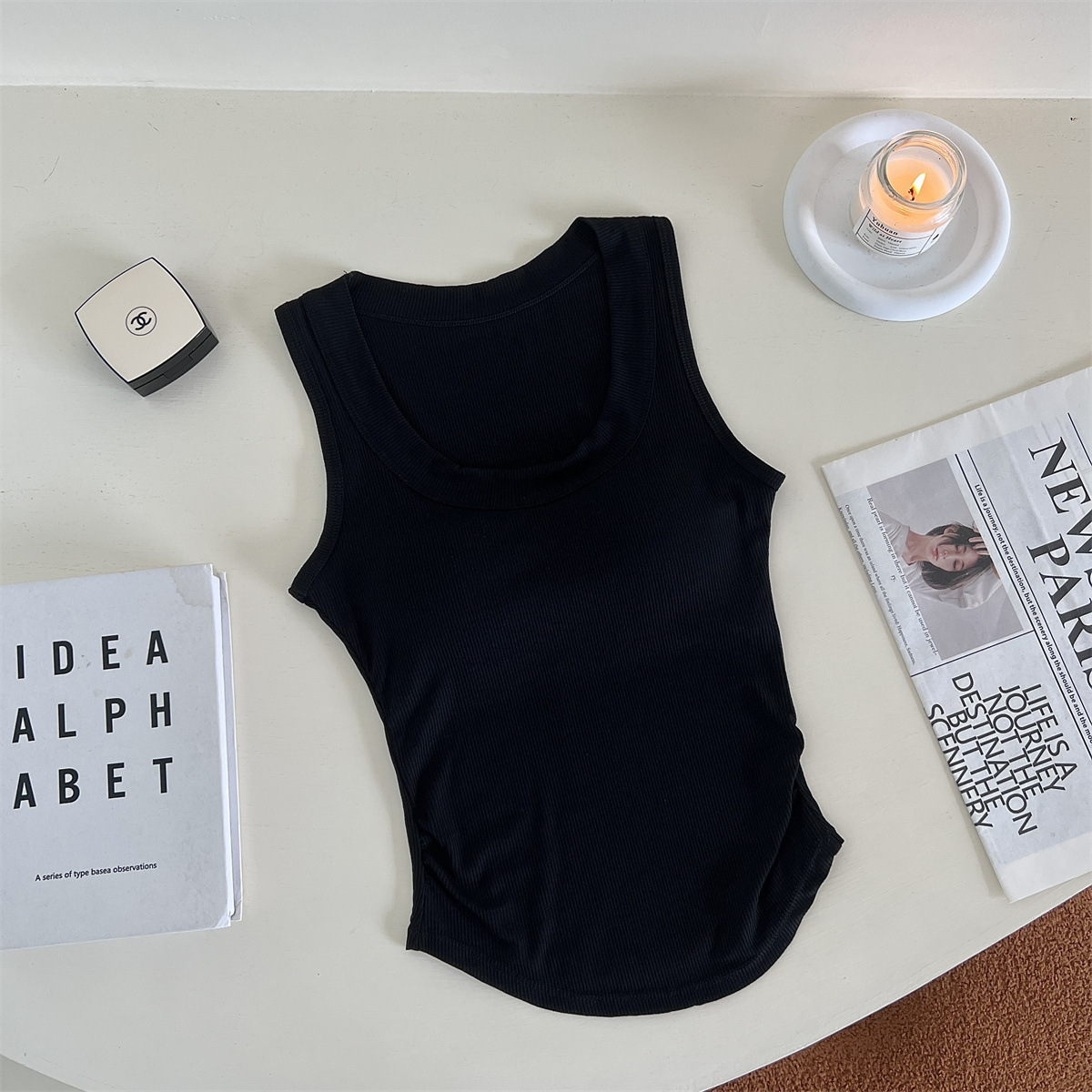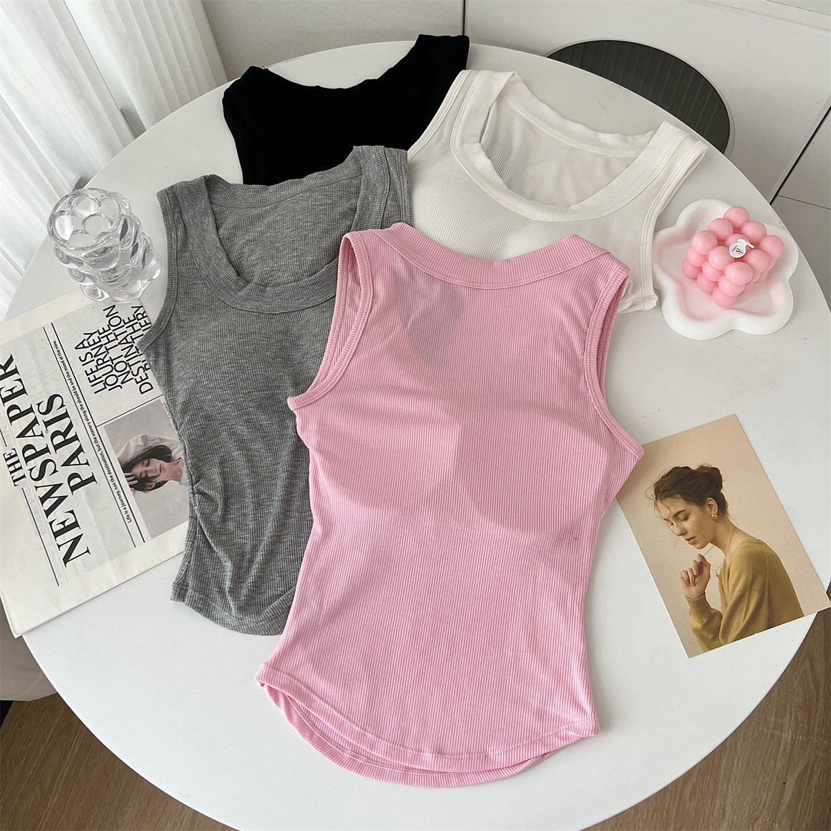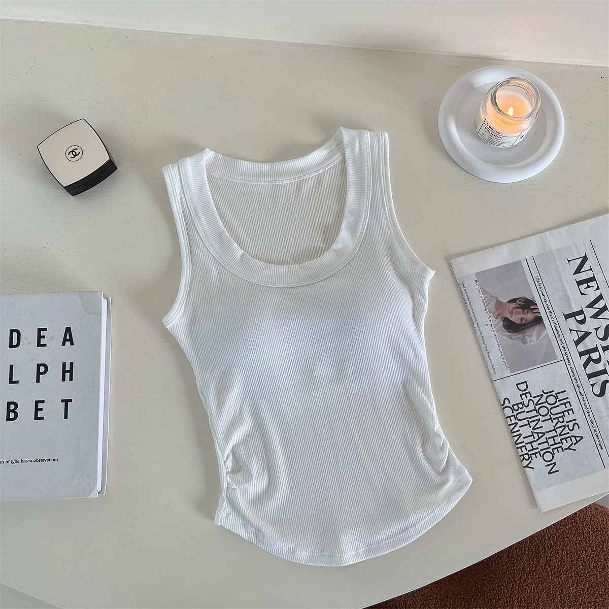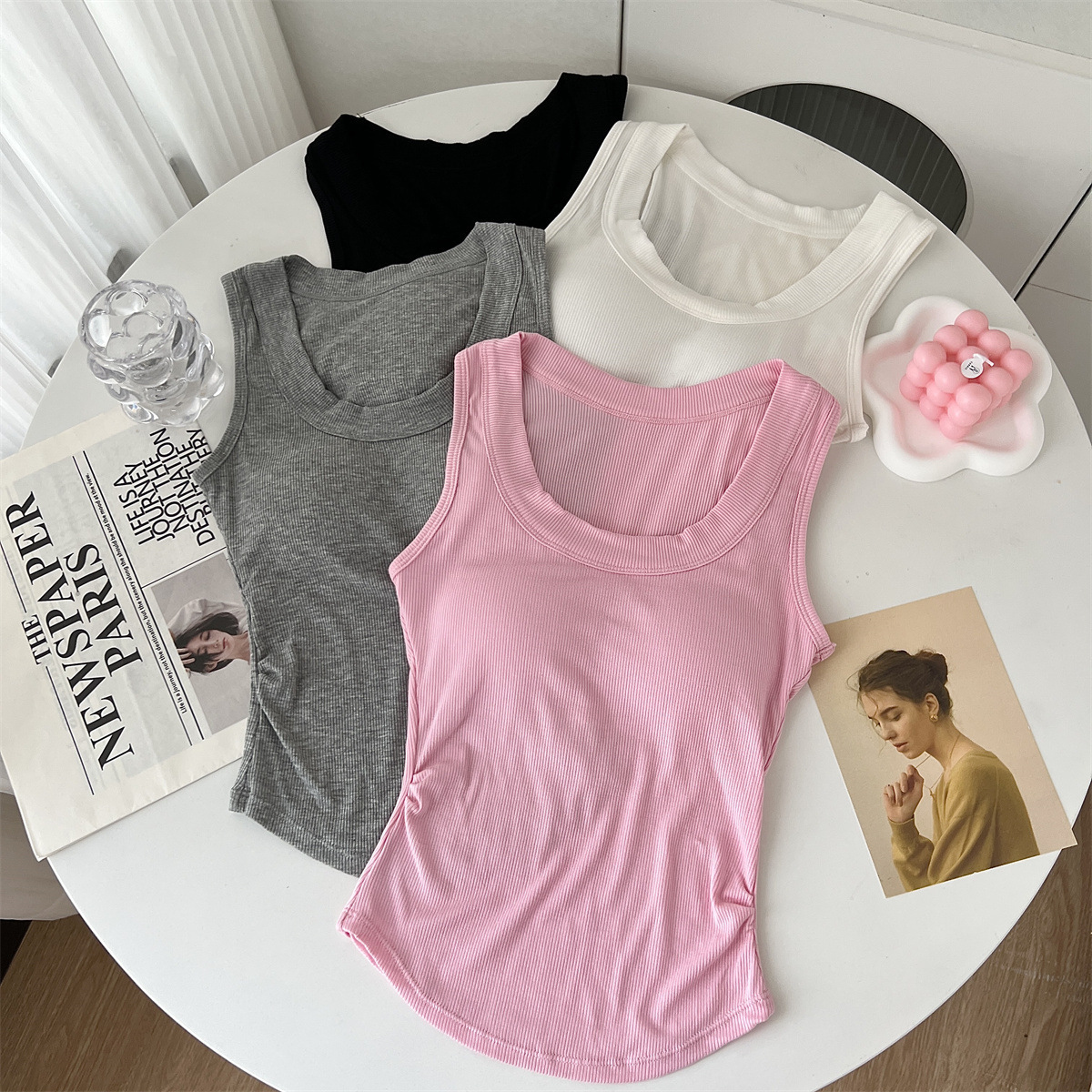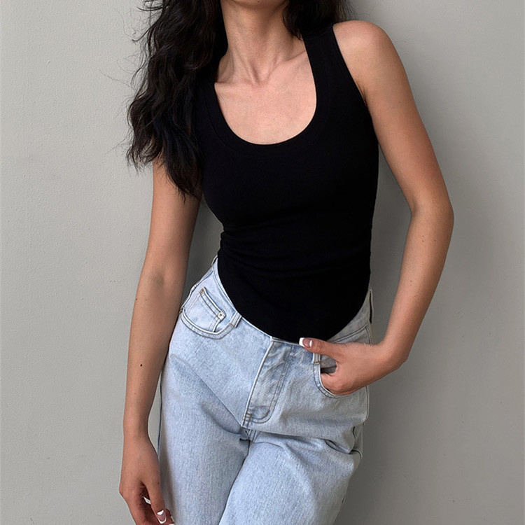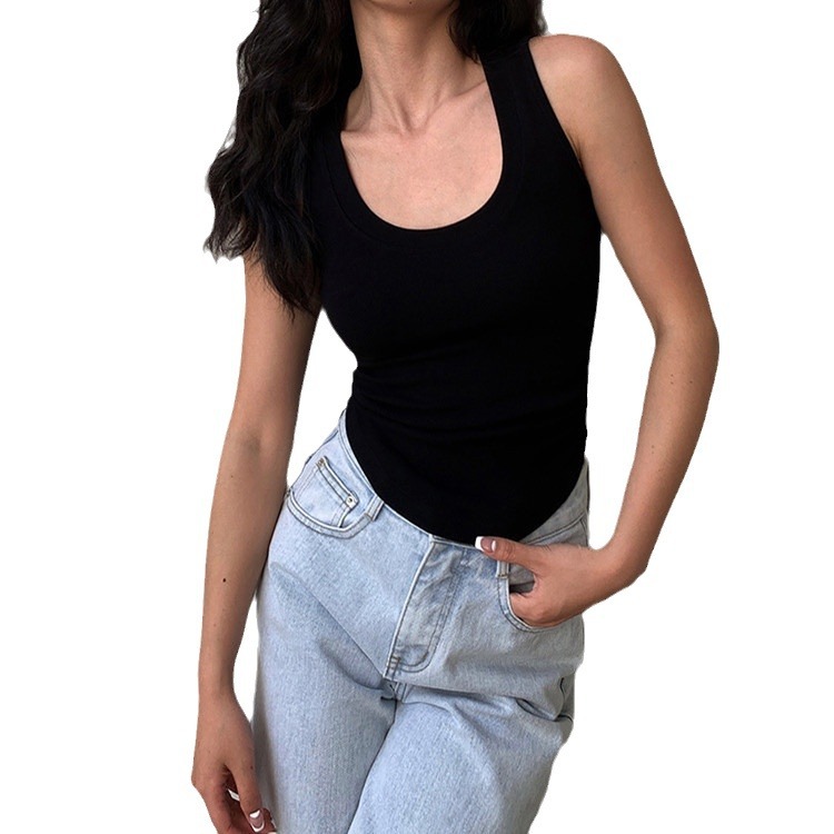 带胸垫基础款U领百搭纯色背心美式辣妹风褶皱收腰设计无袖上衣女