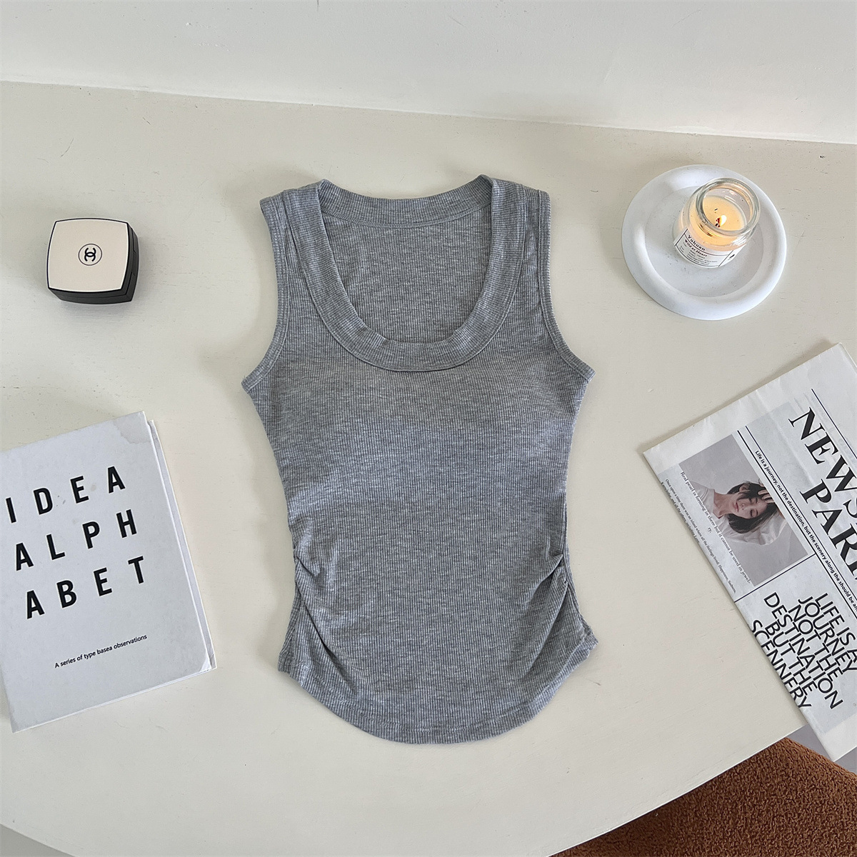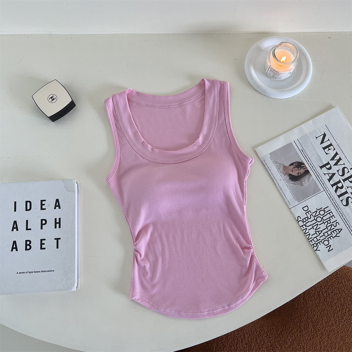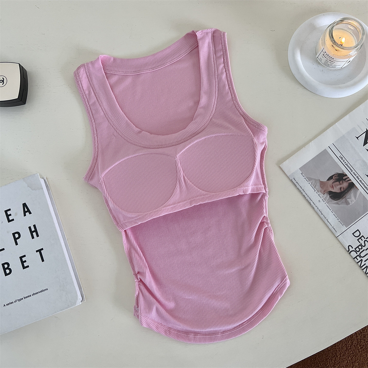 带胸垫基础款U领百搭纯色背心美式辣妹风褶皱收腰设计无袖上衣女 English | 投诉