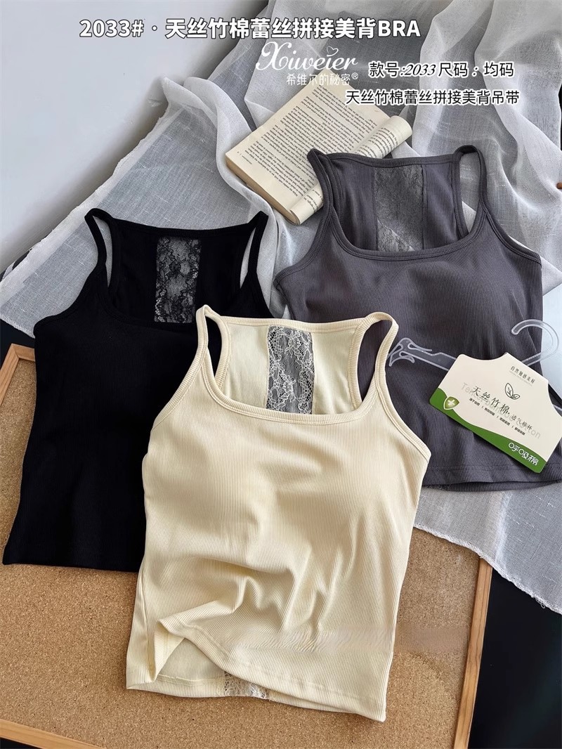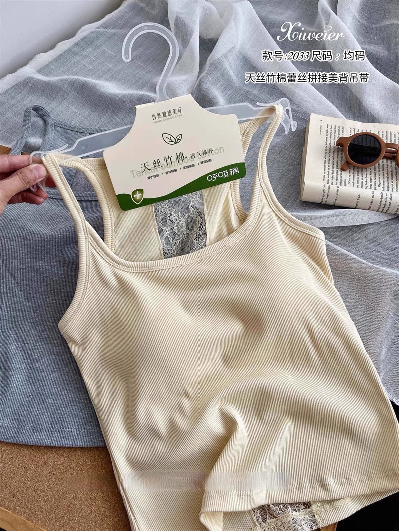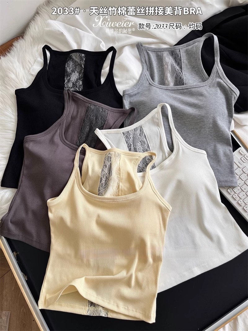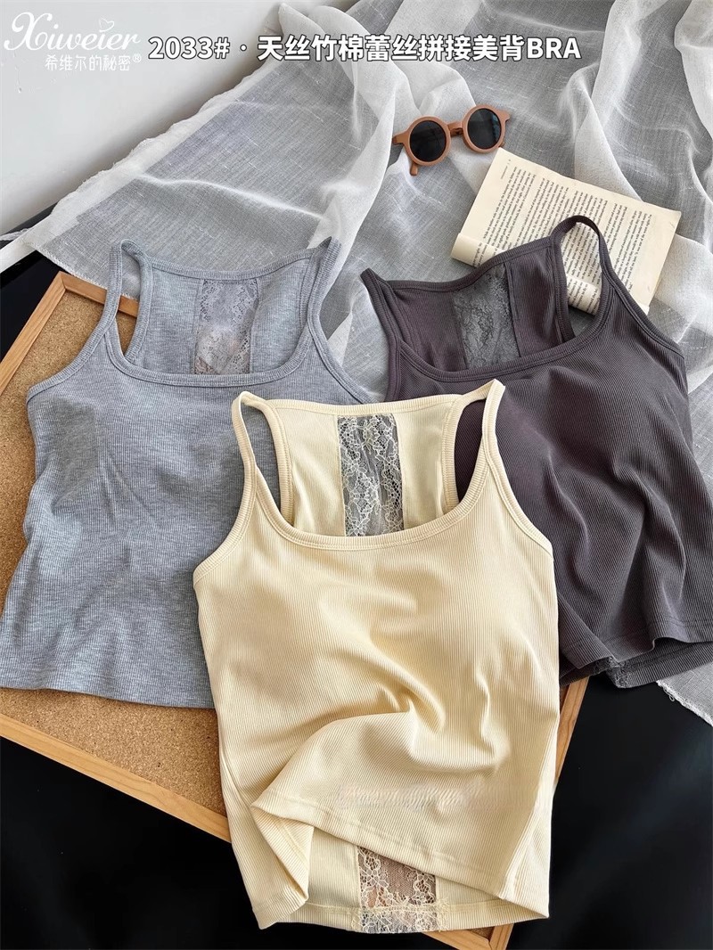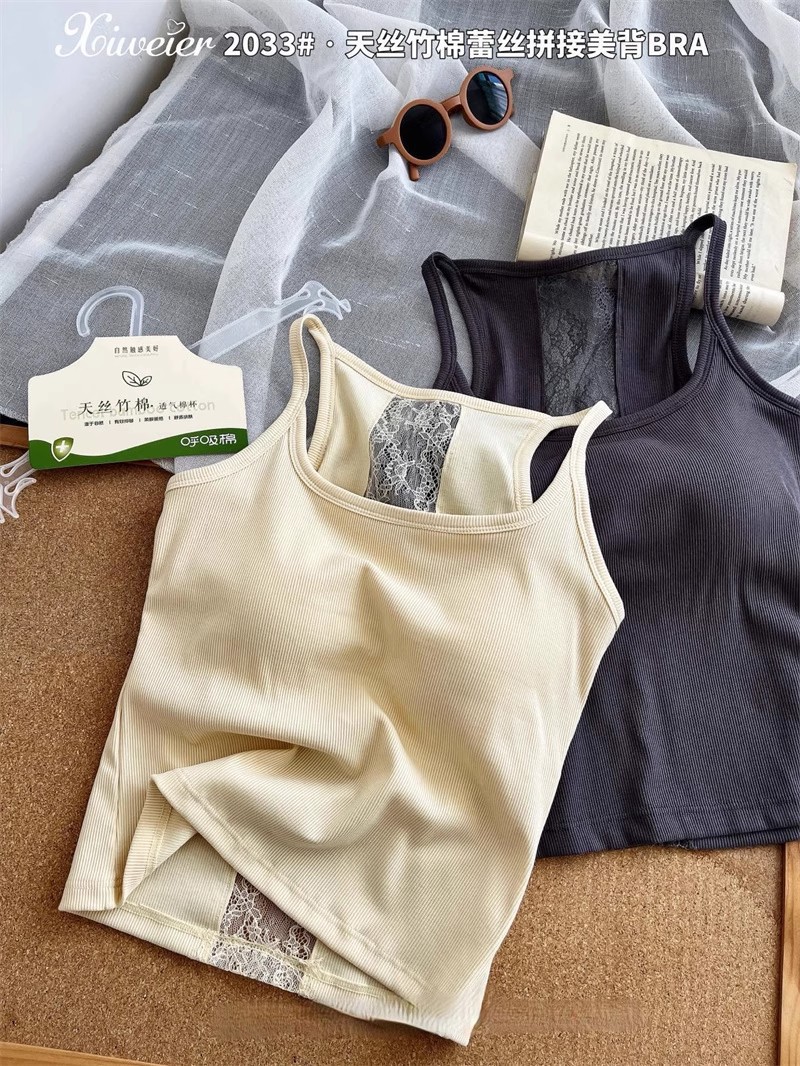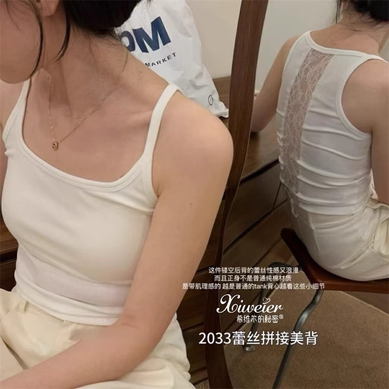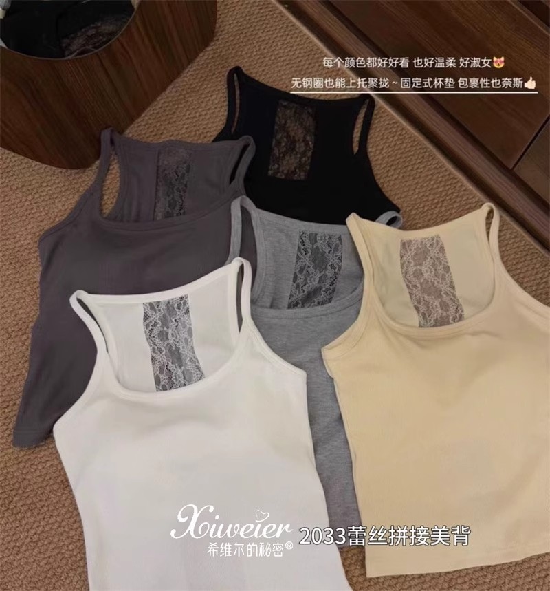 6986#性感辣妹方领后背蕾丝拼接背心带胸垫修身显瘦外穿美背上衣