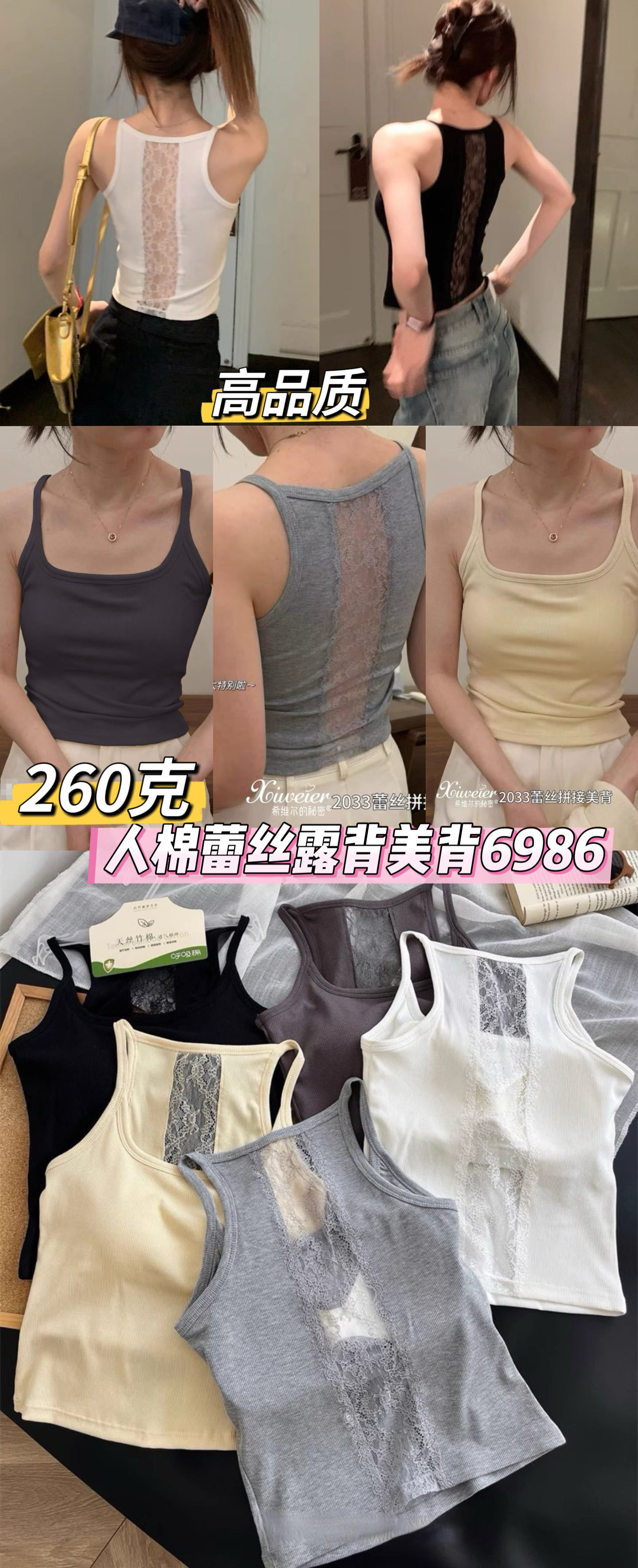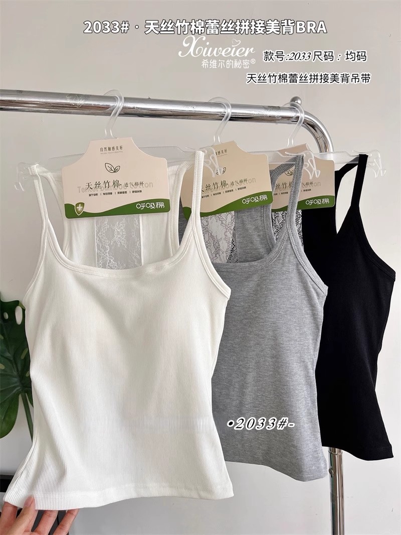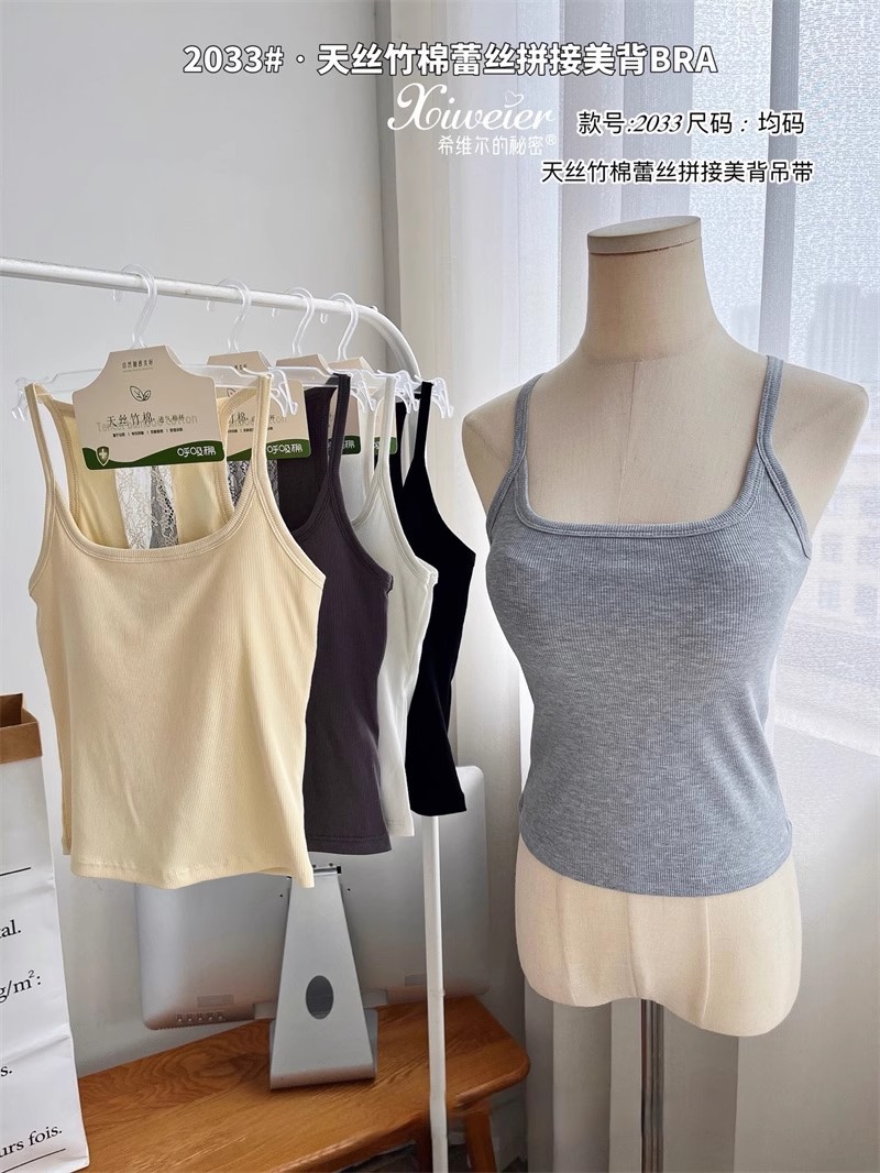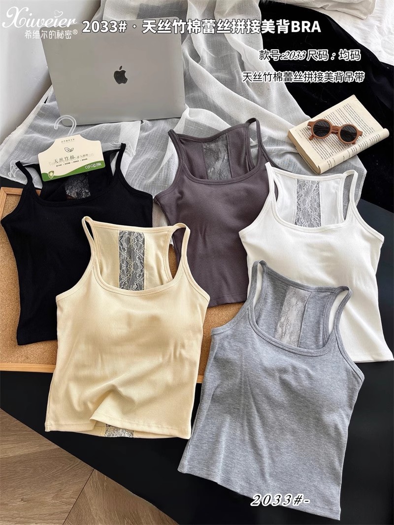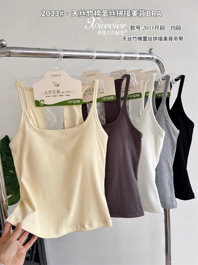 主面料成分: 人棉 产品类别: 吊带背心 产地: 汕头 货号: 6986 颜色: 白色,浅灰色,深灰色,黑色,黄色 尺码: 均码 款式细节: 棉垫,蕾丝花边 上市时间: 2025夏季 款式: 背心式 风格: 百搭 重量: 0.1 kg/件