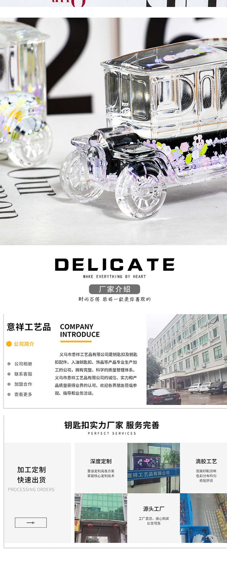 碎花黑色老爷车入油流沙瓶桌面摆件亚克力钥匙扣包包挂件礼品批发 投诉