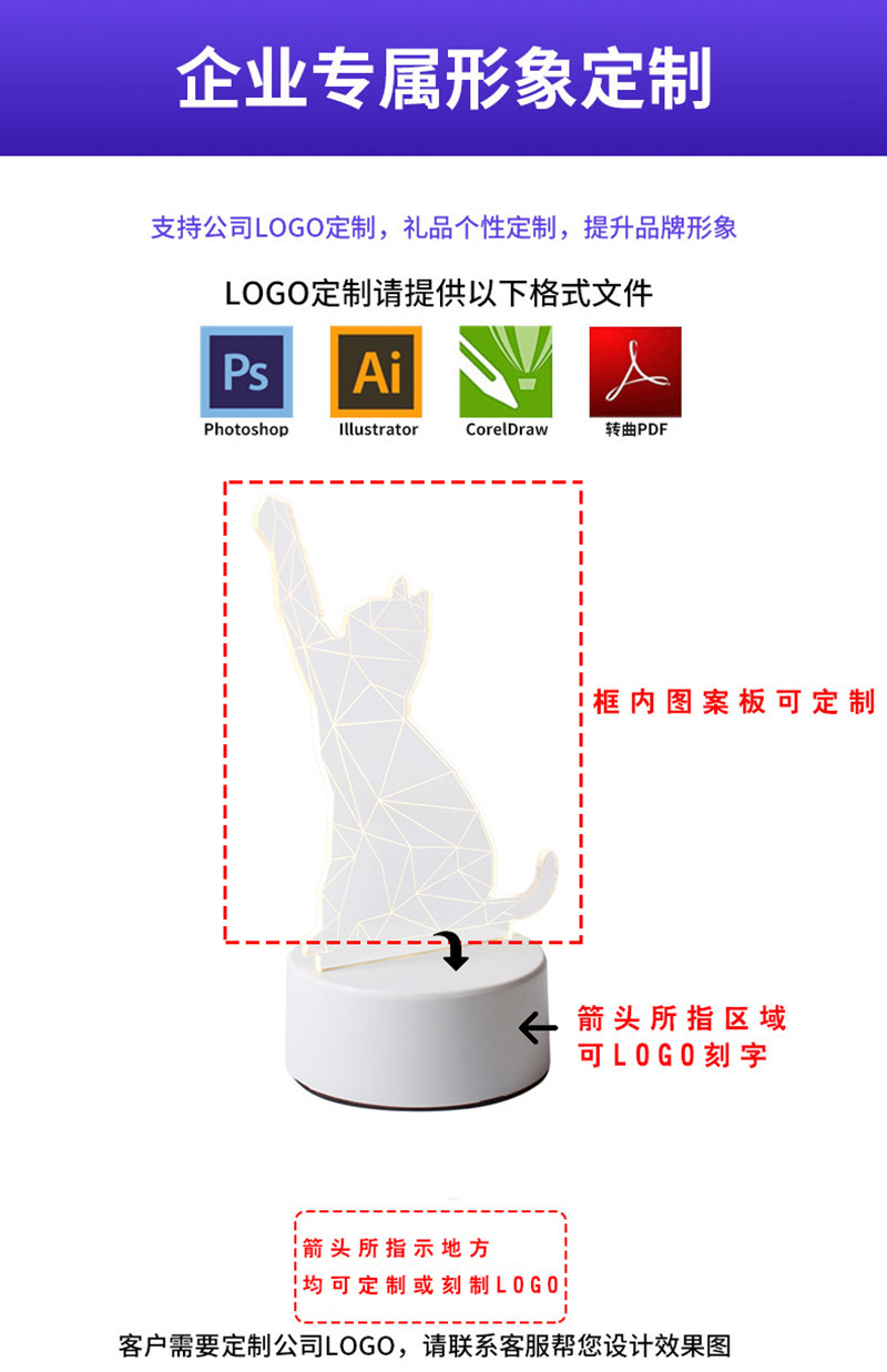 本工厂亚克力创意小台灯支持设计、DIY、来图案做定制、LOGO订做,如需要更多产品图案型号请联系客服,已经做过上万款图案,要的图案都有。