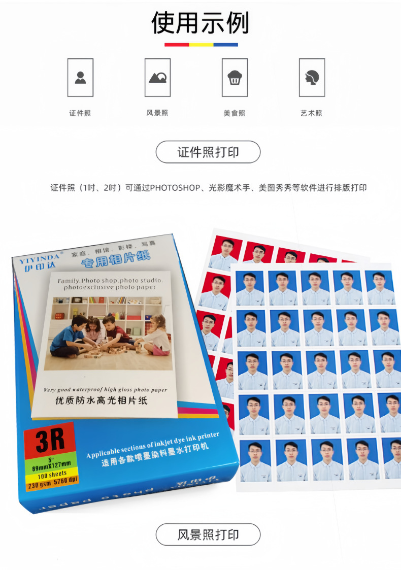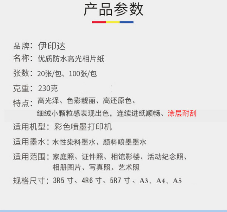 | 伊印达3R/5寸230克PC背印100张高光相片纸 | ¥840 | 50000包可售 |