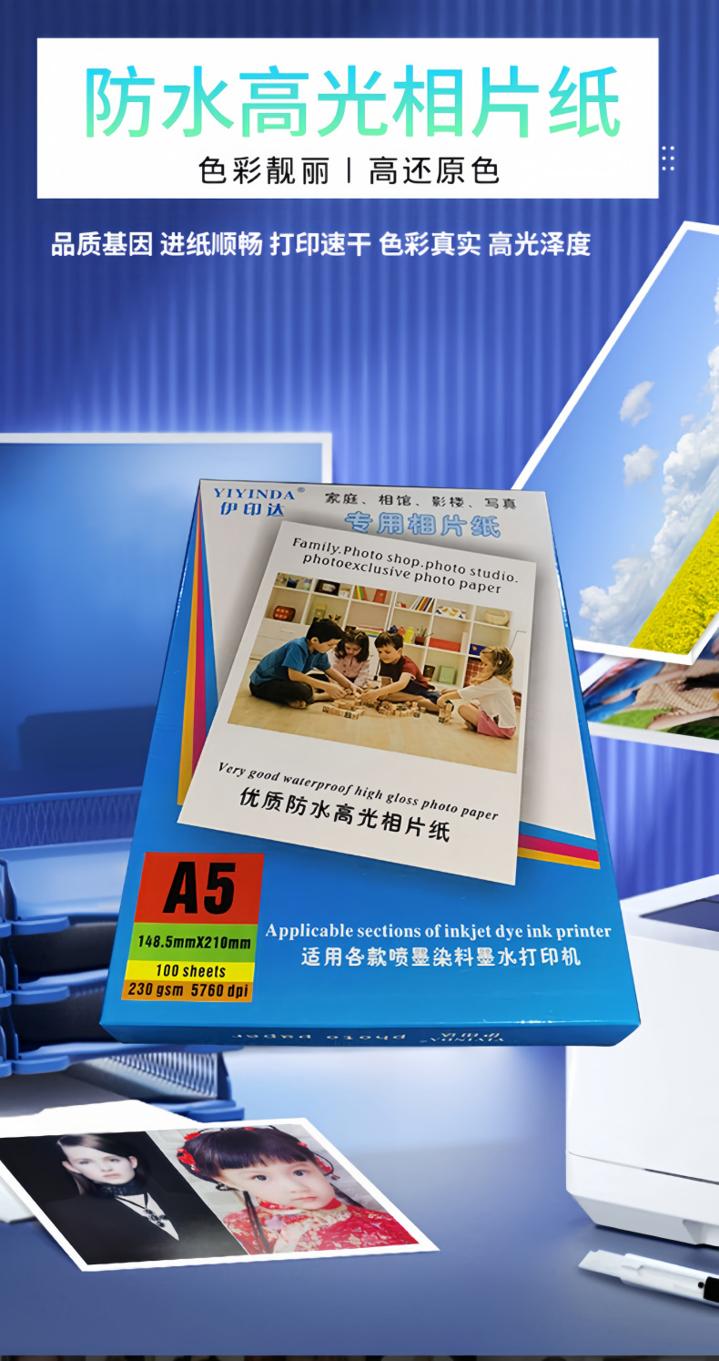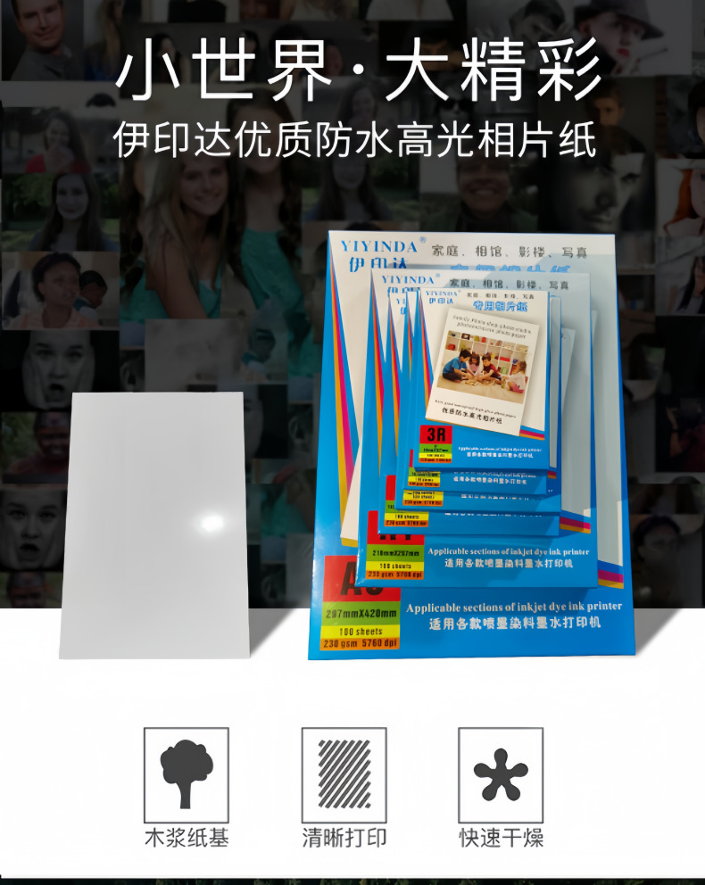 | 伊印达彩页A4/230克无背印20张高光相片纸 | ¥750 | 50000包可售 |