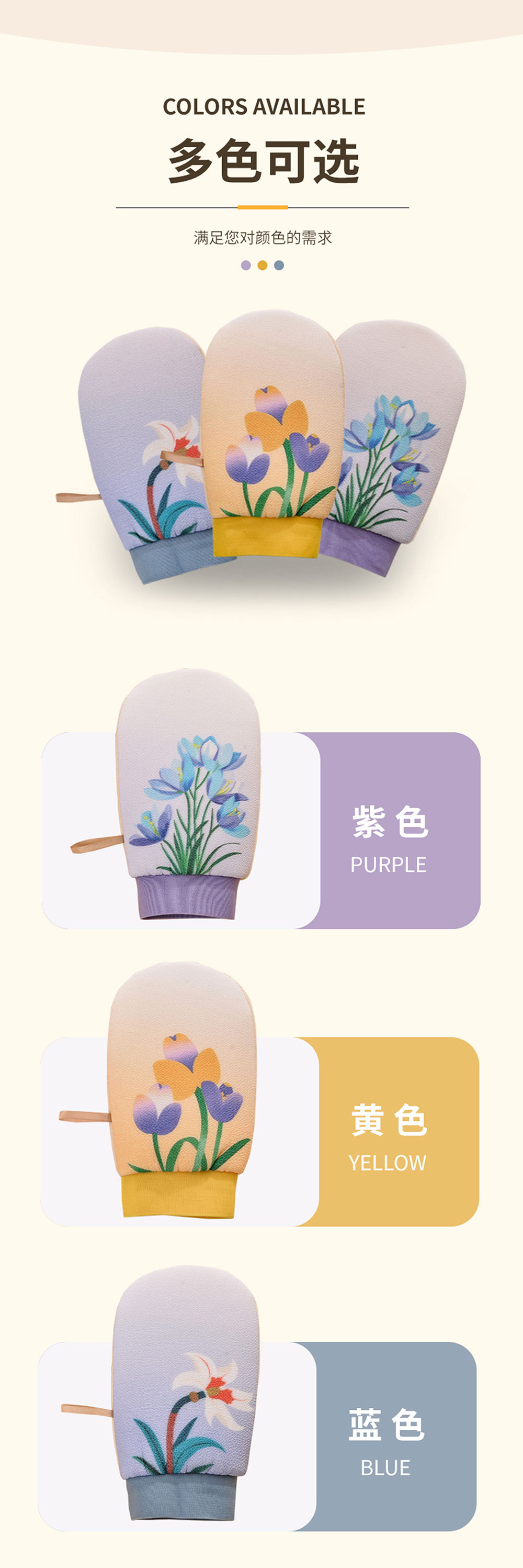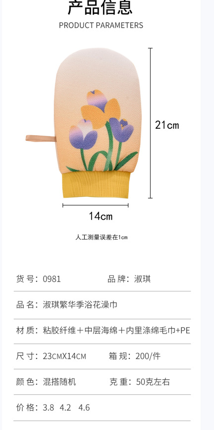 产品类别: 澡巾 品牌: 淑琪 是否进口: 否 形象: 花朵 材质: 黏胶纤维 适用对象: 通用 货号: SQ-0981 颜色: 黄色,兰色,紫色 箱装数量: 200 加工定制: 是 有可授权的自有品牌: 是 是否跨境出口专供货源: 是 是否有专利: 否 重量: 0.5 kg/件