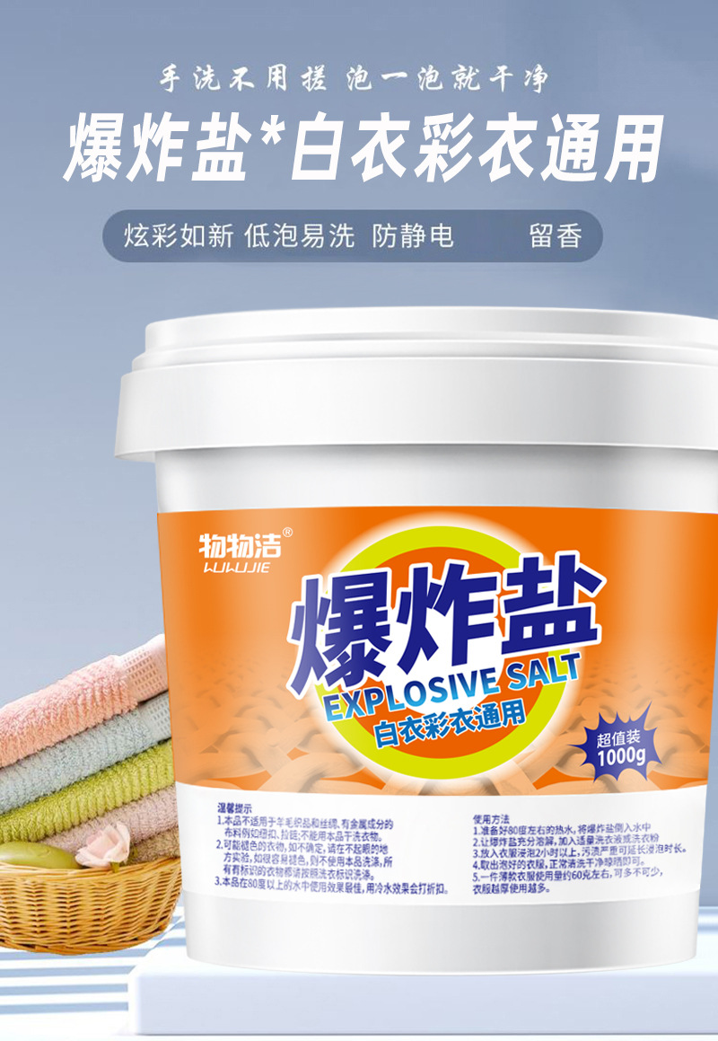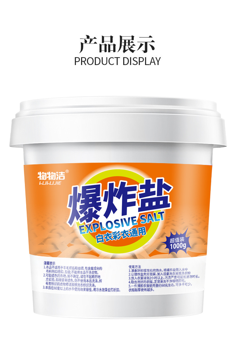 品牌: 物物洁 是否进口: 否 品牌类型: 国货品牌 产地: 浙江 产品系列: 爆炸盐系列 功效: 深层去渍 增白增艳 货号: JW-90 净含量: 1000克 原料: 普通化学成分 毛重: 1000g/1100g/200g/30g 重量: 1.2 kg/瓶