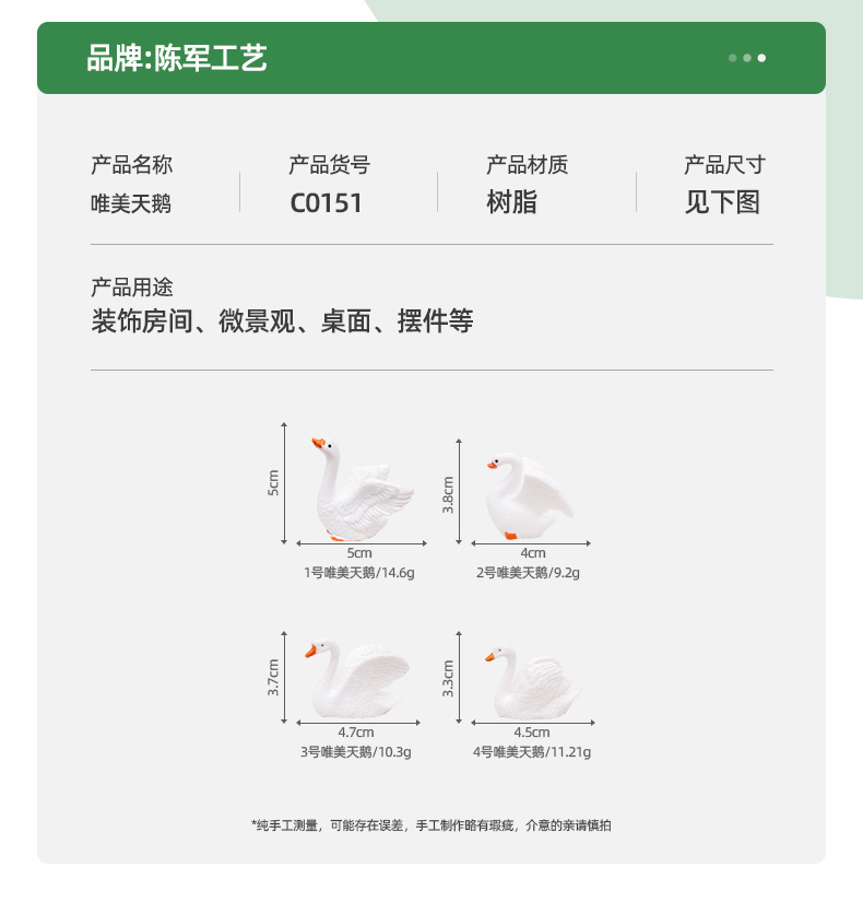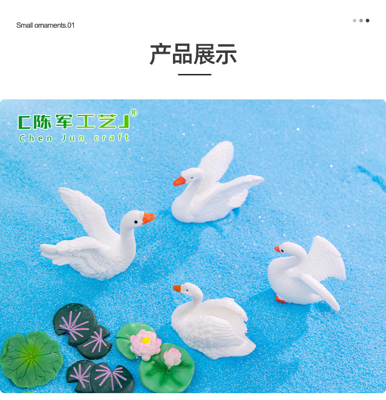 货号: C0151 品牌: 陈军工艺 类别: 树脂工艺品 包装: 普通包装 是否专利货源: 否 颜色: 唯美天鹅1号,唯美天鹅2号,唯美天鹅3号 适用送礼场合: 其他 适用送礼关系: 晚辈,情侣,夫妻,同事,朋友,长辈,孩子 送礼用途: 其他 是否属于礼品: 是,个人礼品 重量: 0.03 kg/个