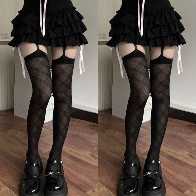 沐阮一体式吊带菱格丝袜女夏季薄款长筒辣妹性感黑丝过膝大腿袜
