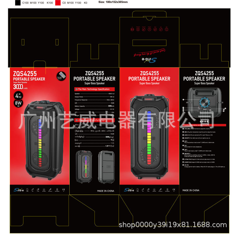 带蓝牙/带收音/带遥控(接收头装主板)/电位器音量+带USB/TF卡/MIC、DC-5充电/带AUX(带3.5音频座)/带锂电保护+带显示屏/USB带5V升压对箱功能+带幻彩灯、幻彩灯.