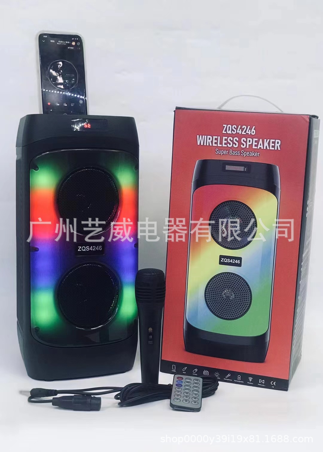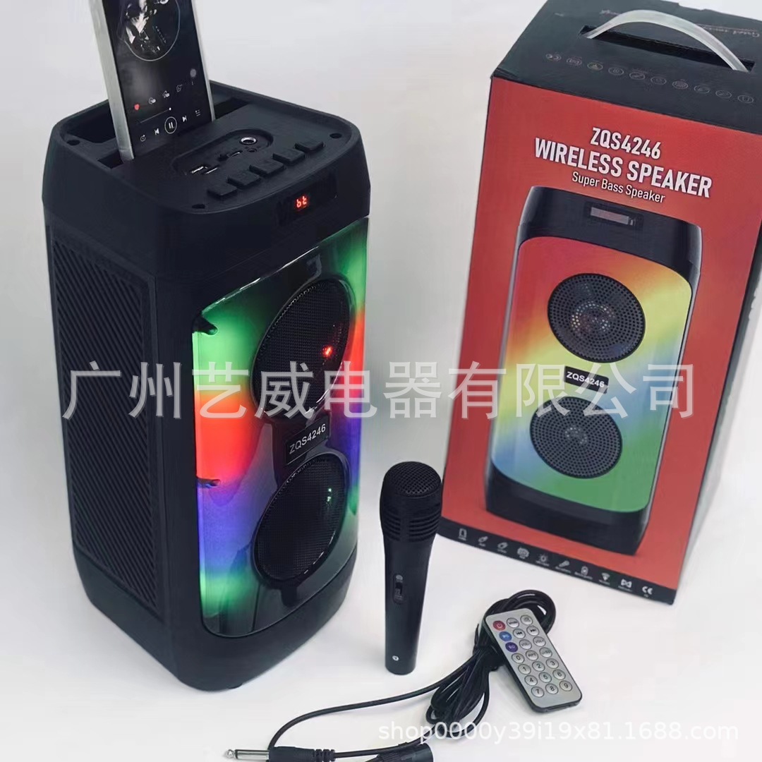 With Bluetooth/radio/remote control + TF card/AUX/MIC, box function +USB with 5V boost, DC-5V charging (Type-C charging base), with lithium protection, key volume + with magic light.