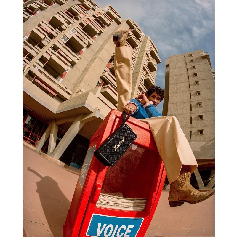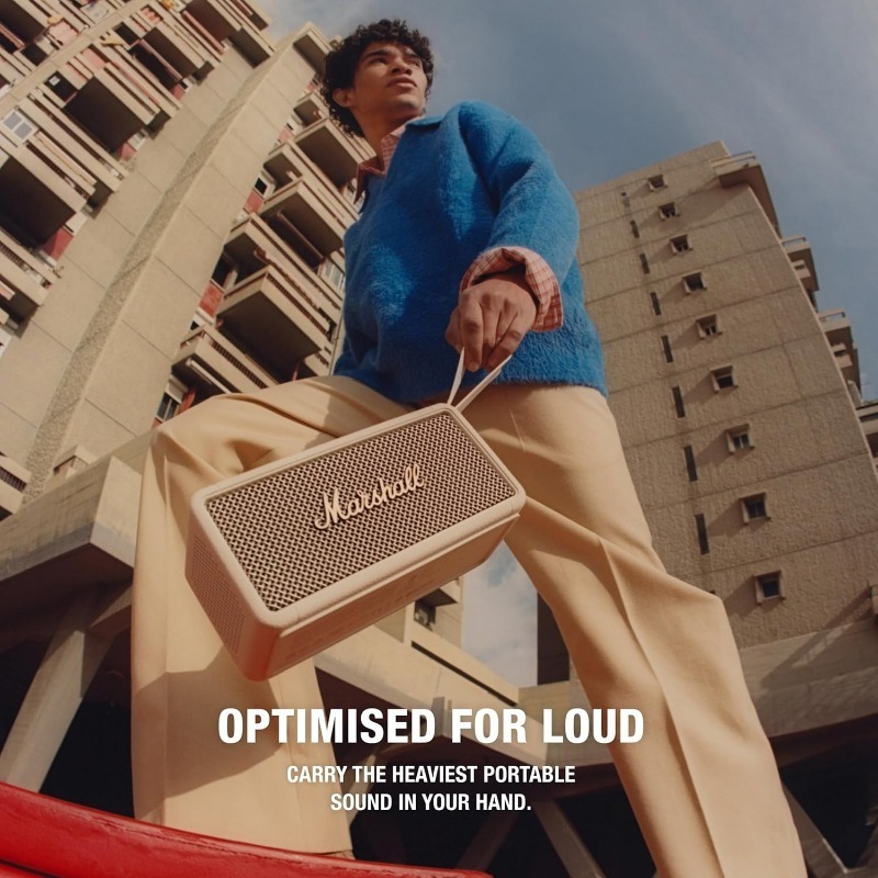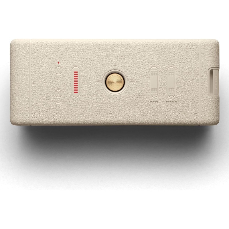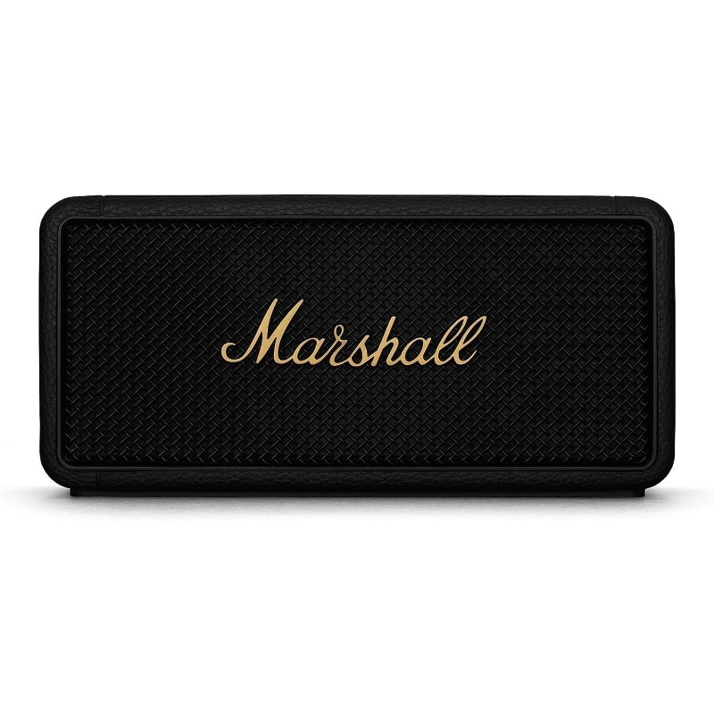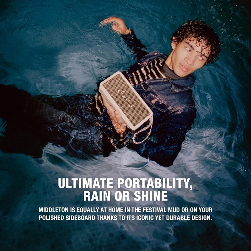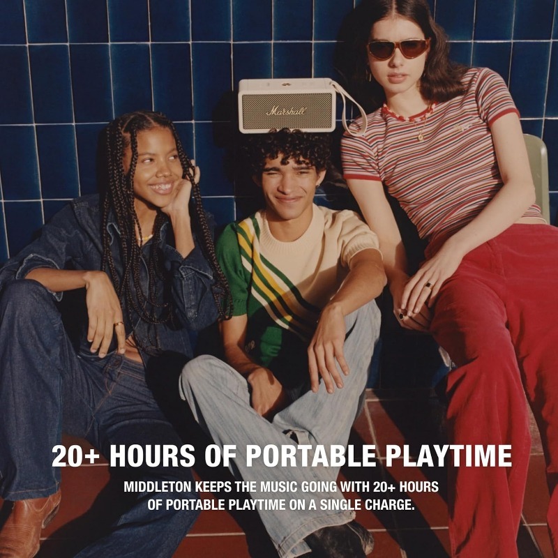 Carry the heaviest portable sound in your hand. Middleton has a quad-speaker set-up to ensure the ultimate immersive experience wherever you roam. Control playback and adjust the bass and treble using the top-mounted controls or the dedicated app. Built-in Dynamic Loudness adjusts the tonal balance of the sound to ensure your music sounds brilliant at every volume. Middleton utilises True Stereophonic, a unique form of multi-directional stereo sound from Marshall. Experience superior spatial and binaural sound that flows around you and fills any space. This is absolute 360° sound – where every spot is a sweet spot.Middleton is equally at home in the festival mud or on your polished sideboard thanks to its iconic yet durable design. With a rugged IP67 dust and water-resistant build, a bit of rain and dirt won’t get under its skin. Middleton’s sturdy build comprises 55% post-consumer recycled plastic and is completely PVC-free. This speaker drops you straight into your music with no trouble or fuss – just pair, play and enjoy 20+ hours of portable playtime on a single charge. When the power is drained, plug Middleton in for 4.5 hours to return to full battery. Keep the music going when your phone battery is low, charge your device on the move with Middleton’s trusty power bank feature. Middleton also connects to other Middleton speakers, amplify the sound with Stack Mode and discover a sound as big as your imagination. Stacked or solo, Middleton fills whatever space you’re in with colossal sound.