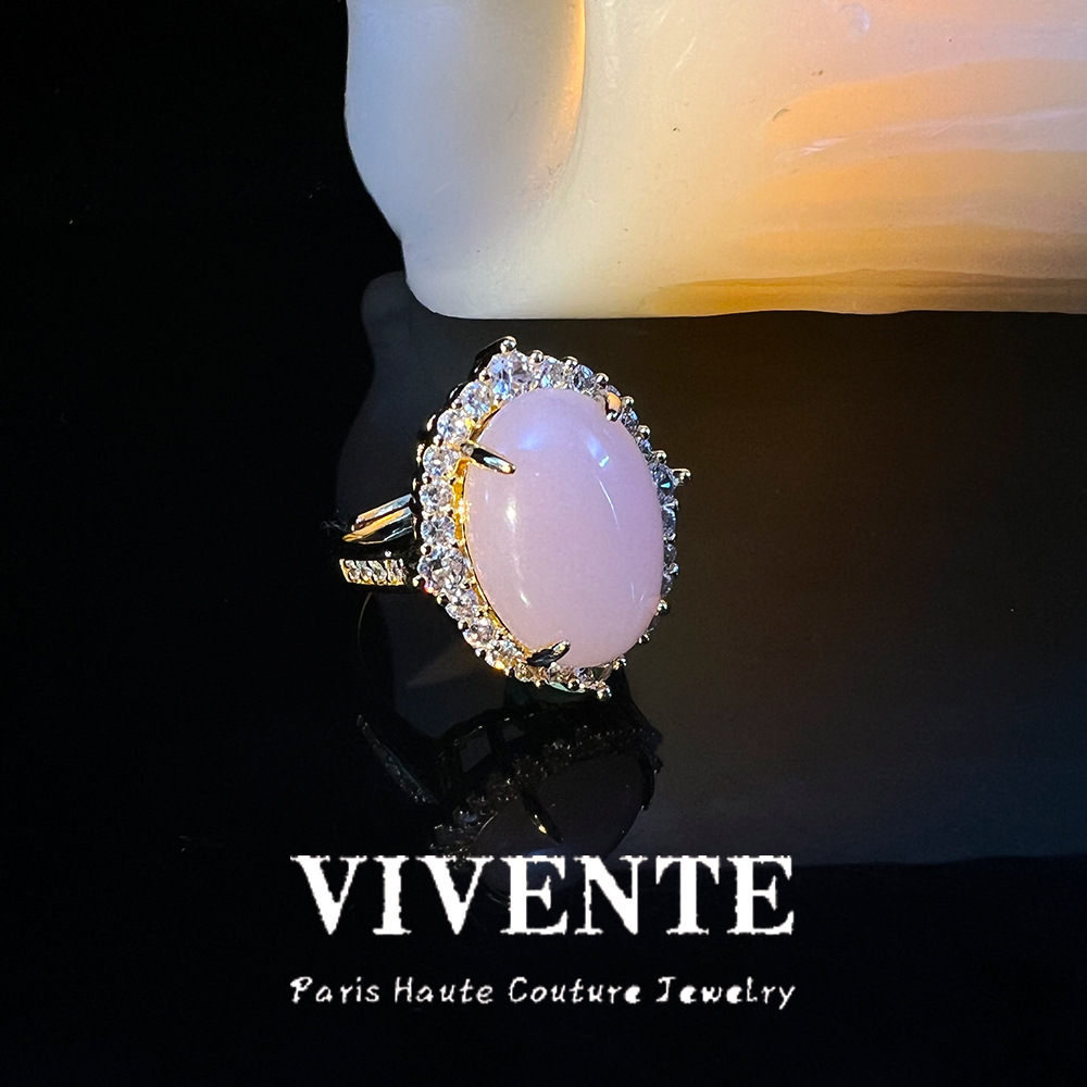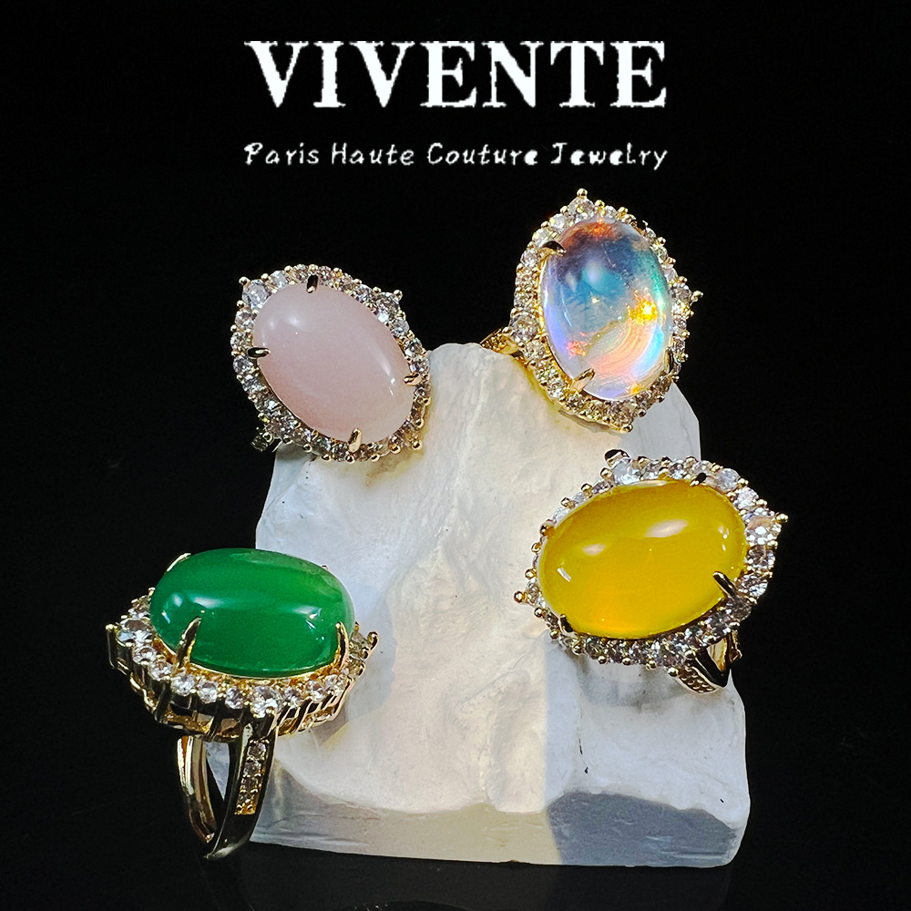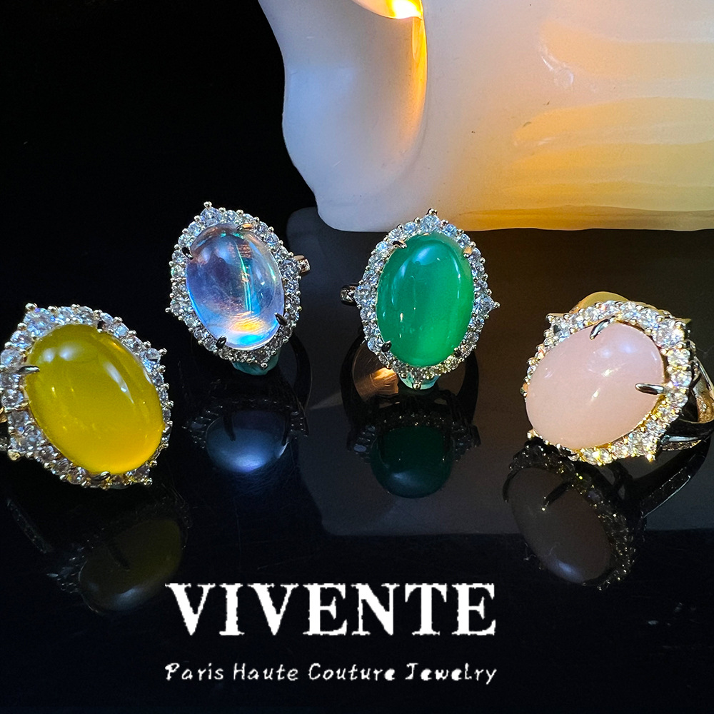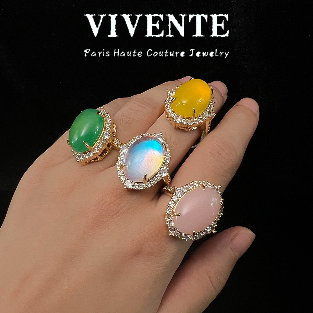新中式铜镀真金玉髓戒指 轻奢高级复古月光石天然宝石开口圈戒指