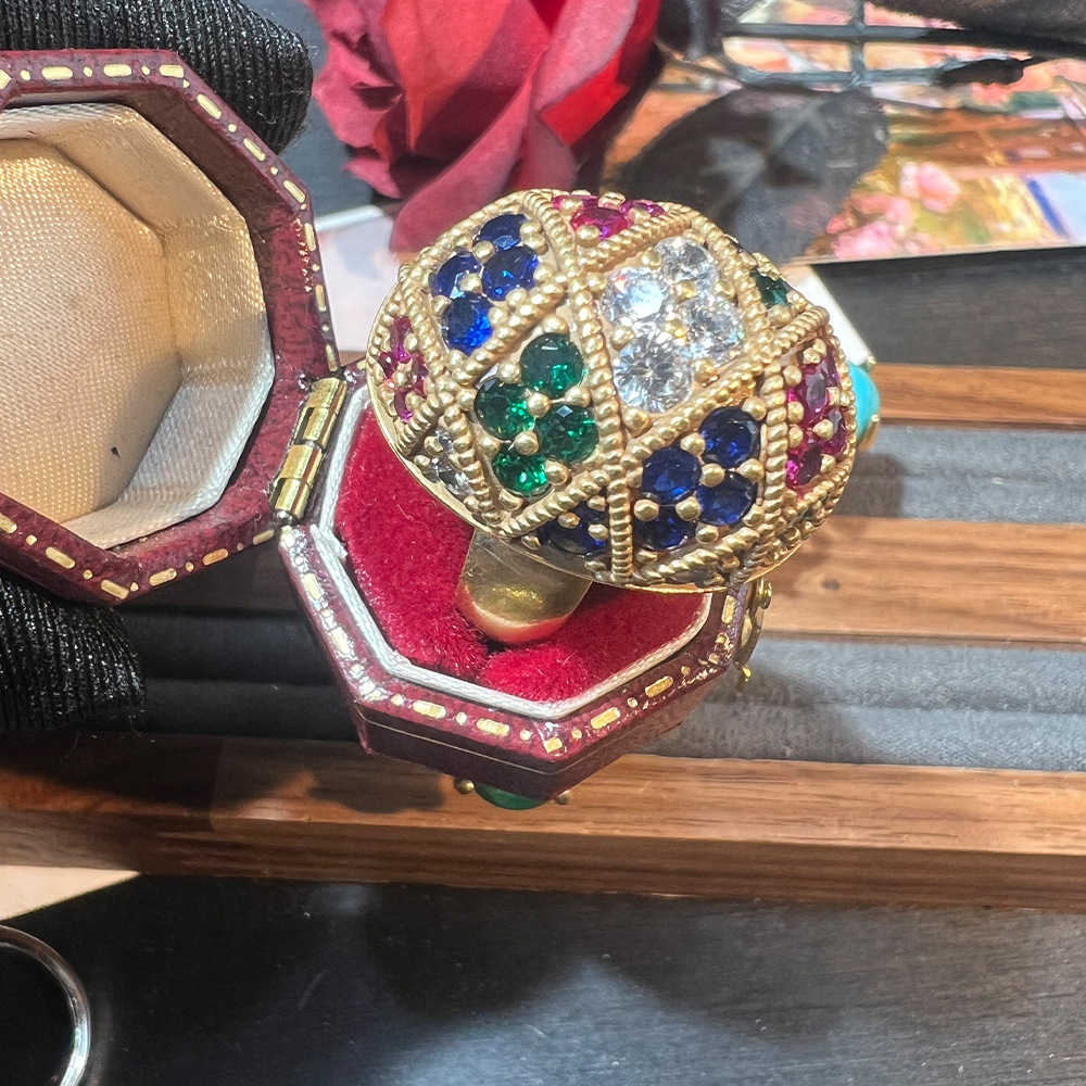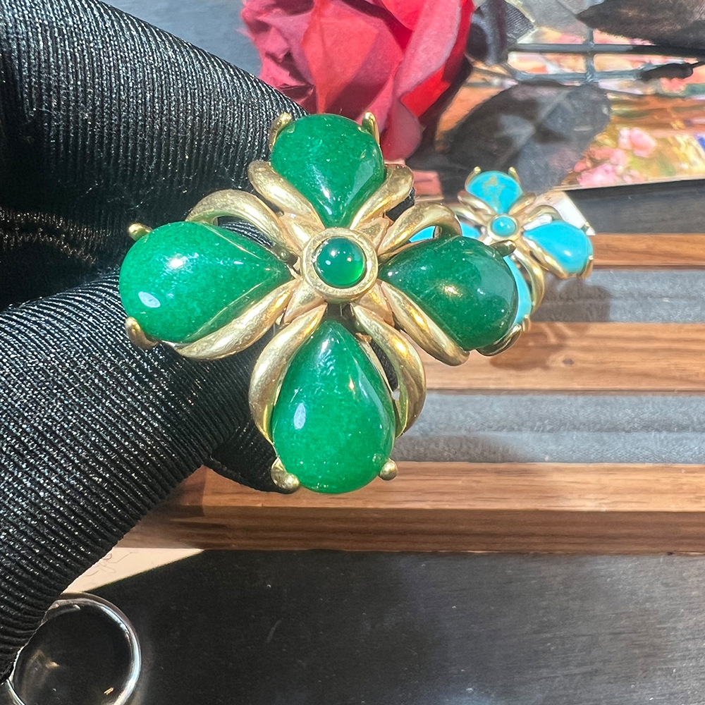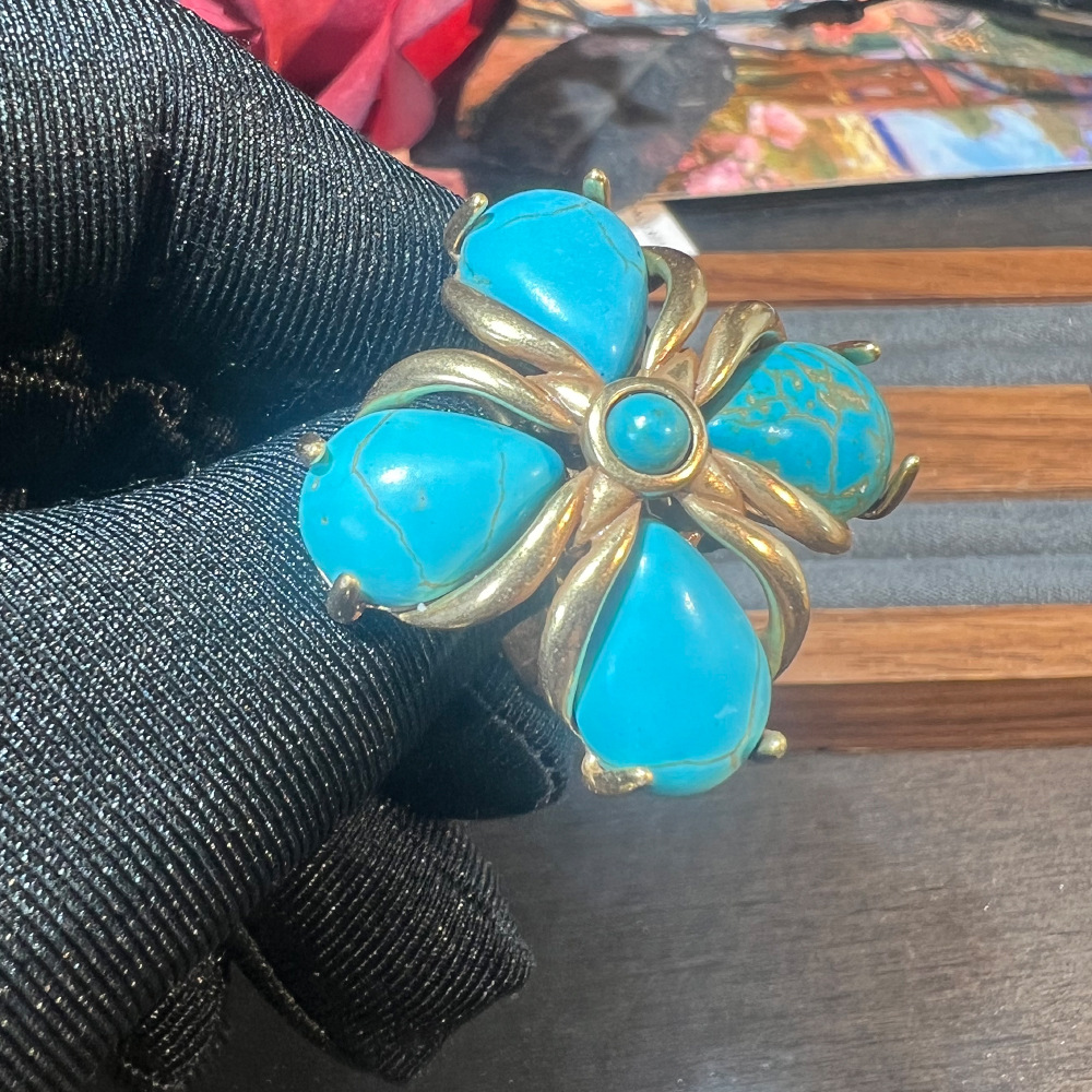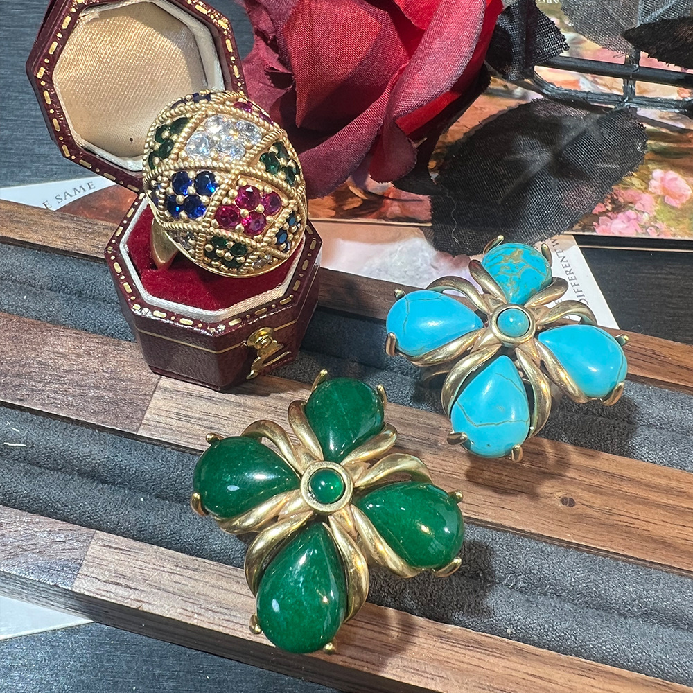 复古立体立体大花朵戒指 vintage宫廷风绿松石浮雕中古风开口戒女