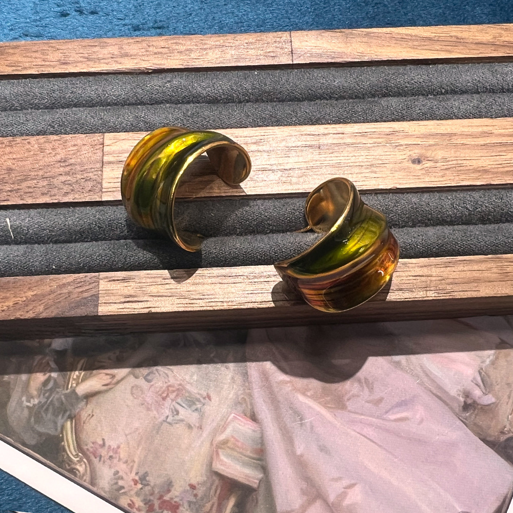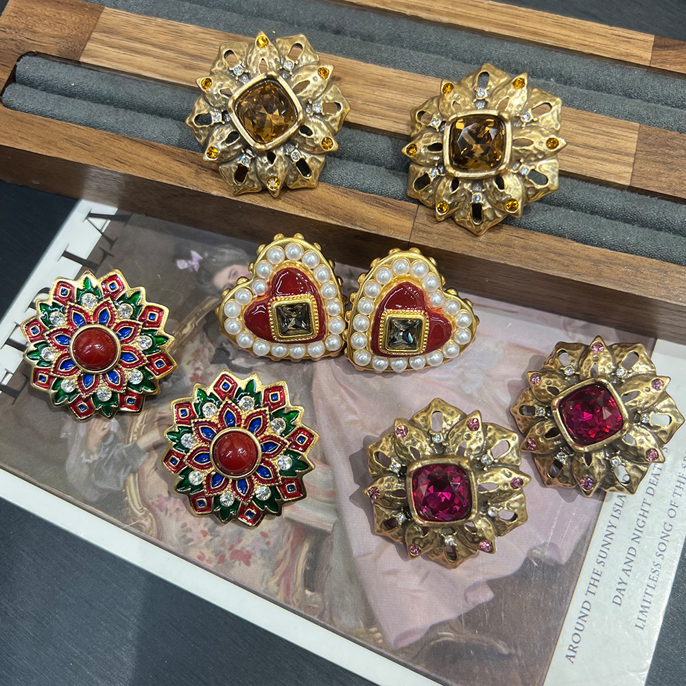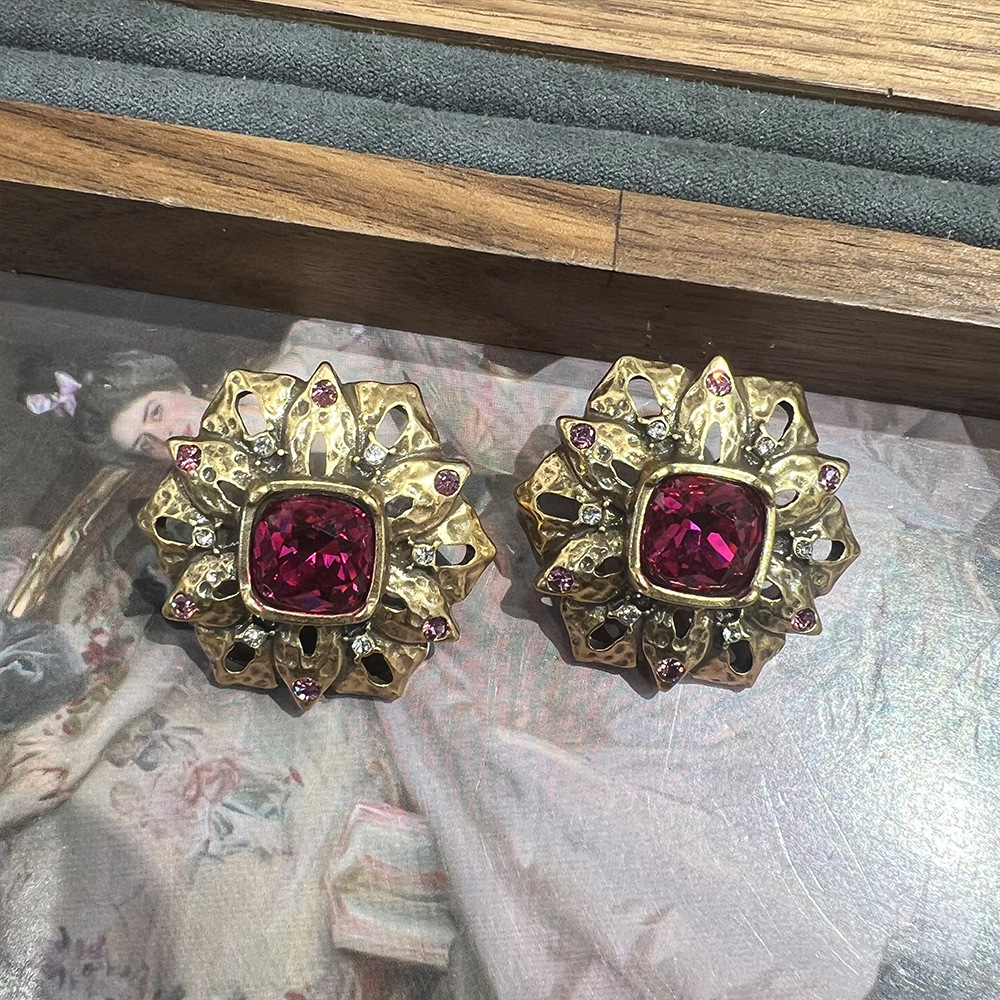 俄罗斯金法式复古紫红色绿色琉璃宝石珐琅雕刻银针耳钉S925耳饰 投诉