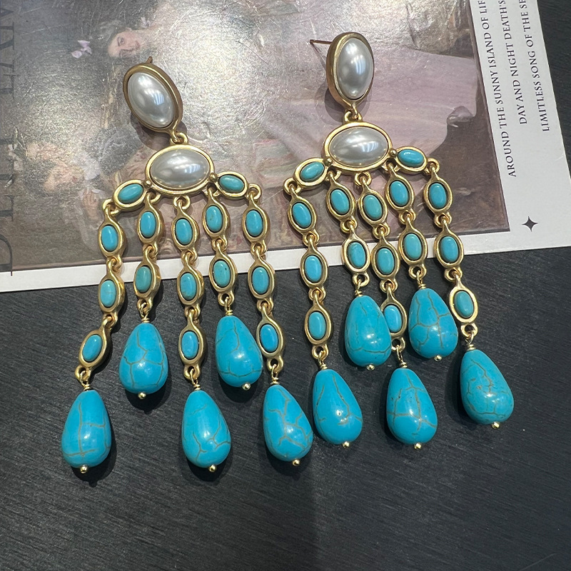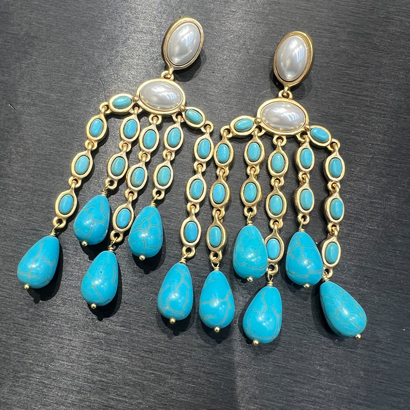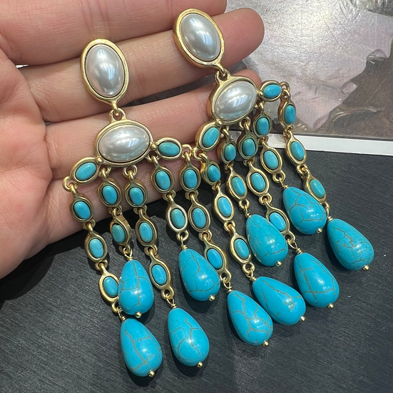 绿松石流苏耳环 民族风古法铜镀素金保色珍珠复古高级感S925耳坠
