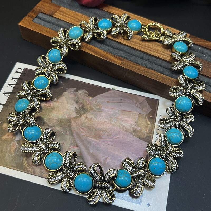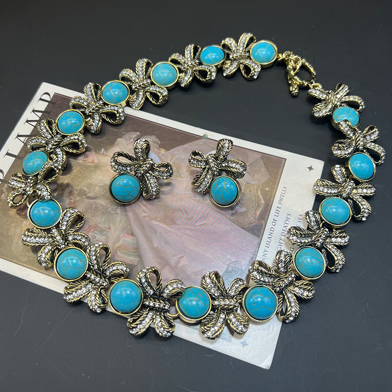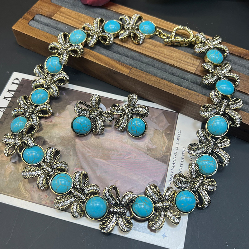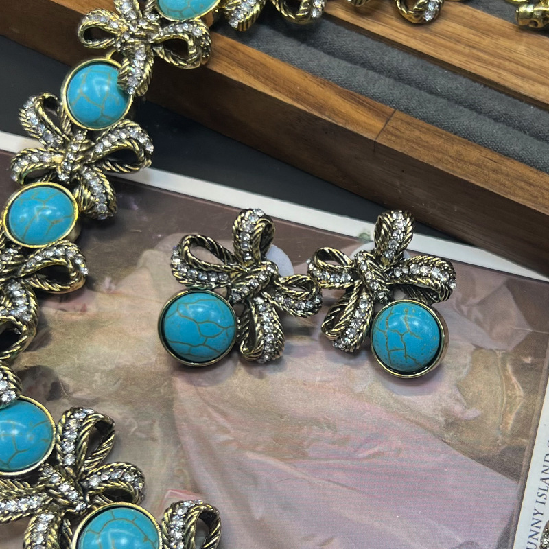 Vintage蓝松石锆石蝴蝶结项链中古金属做旧锁骨链镶钻松石耳环女