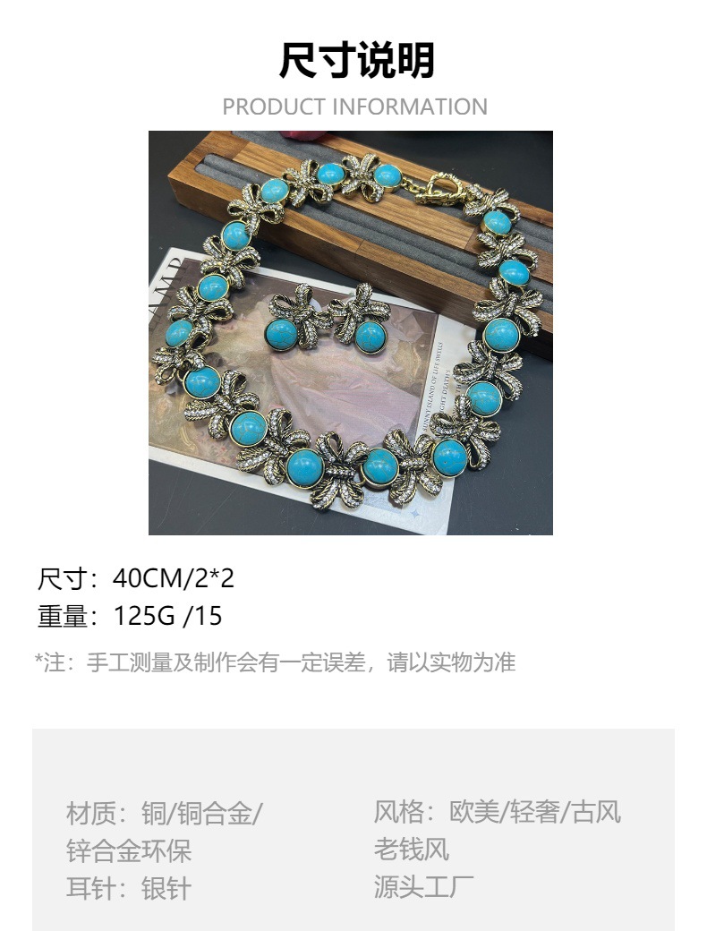 Vintage蓝松石锆石蝴蝶结项链中古金属做旧锁骨链镶钻松石耳环女 投诉