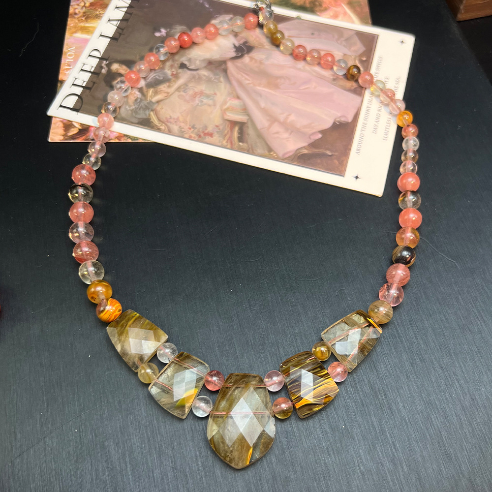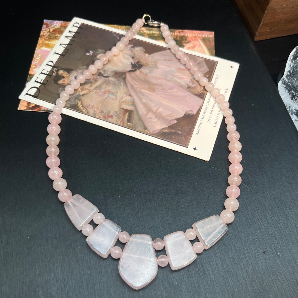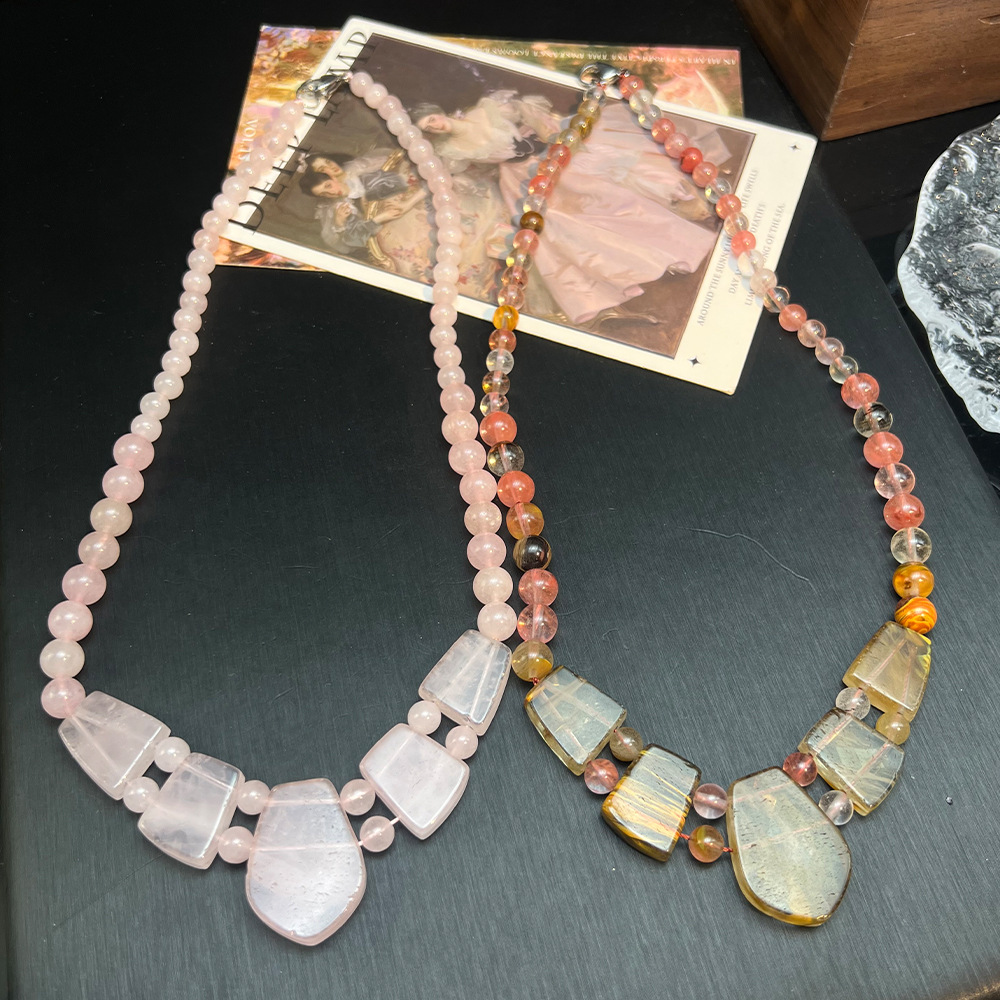 欧美跨境粉水晶西瓜晶切面串珠项链 vintage天然石复古串珠项链女 投诉