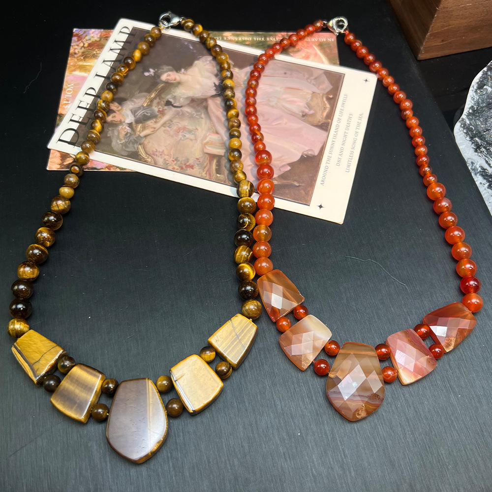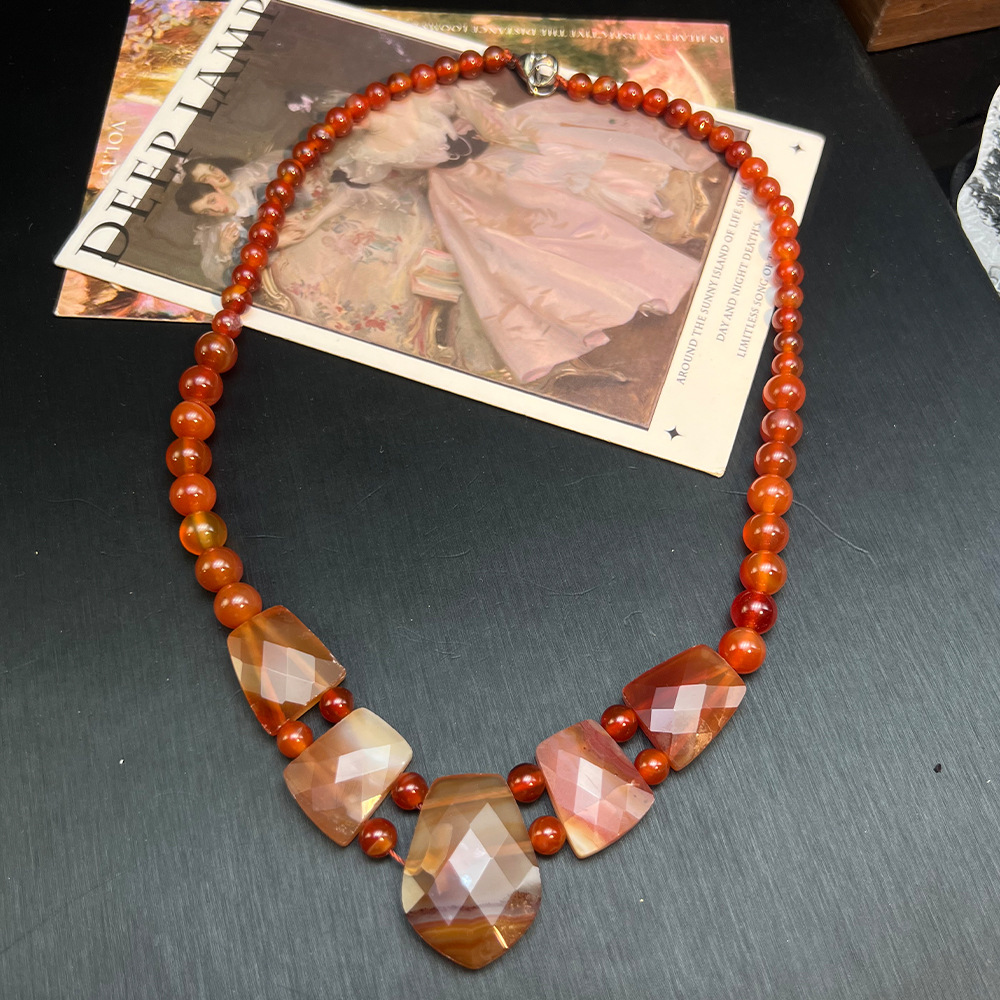 欧美跨境粉水晶西瓜晶切面串珠项链 vintage天然石复古串珠项链女