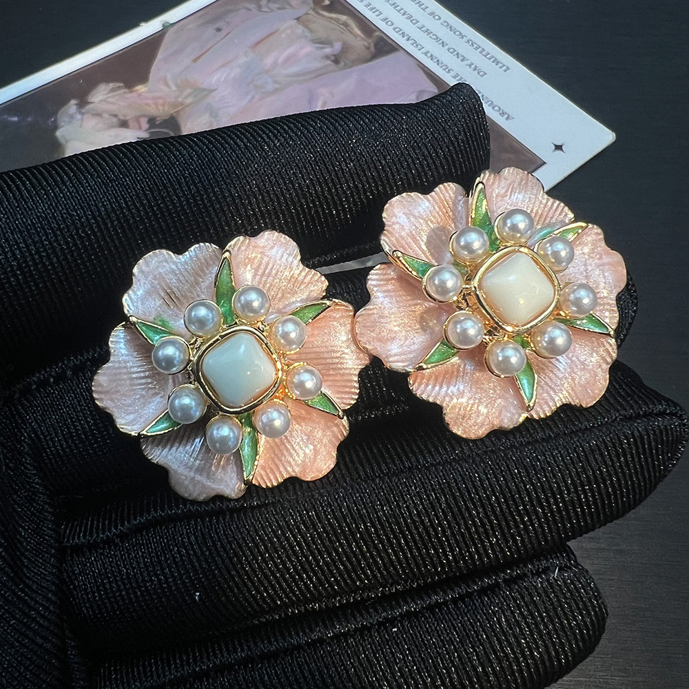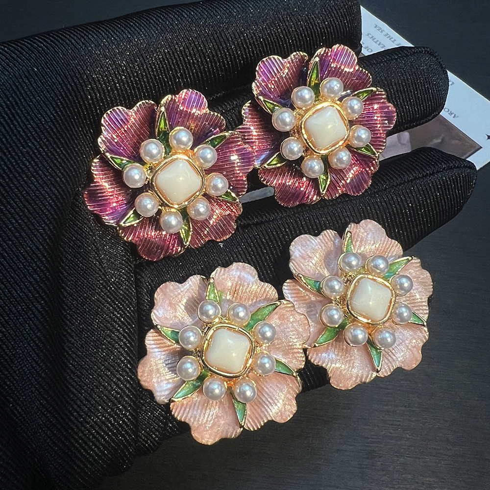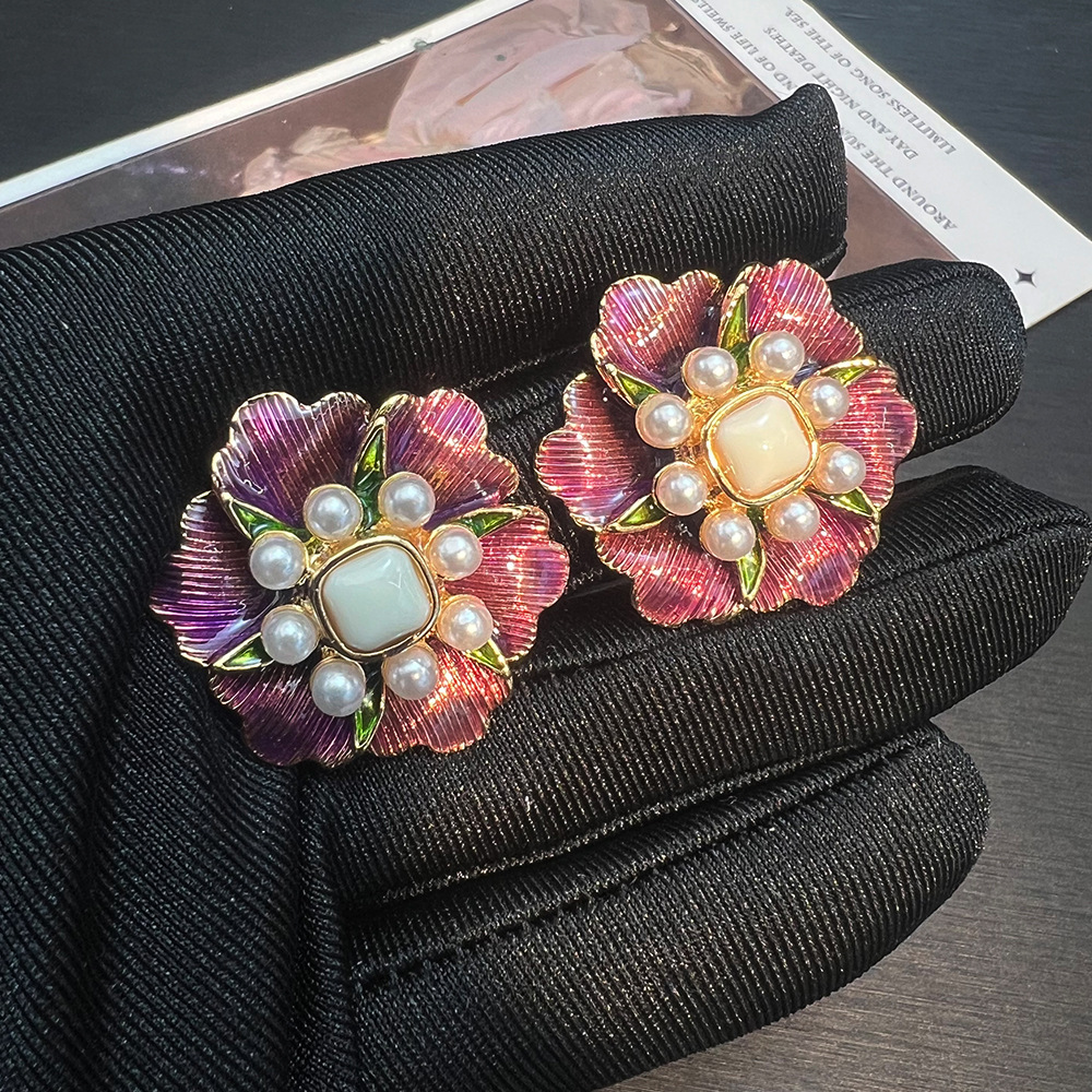 春夏新款拉丝花朵珐琅彩耳钉vintage复古小众精致优雅S925耳饰女