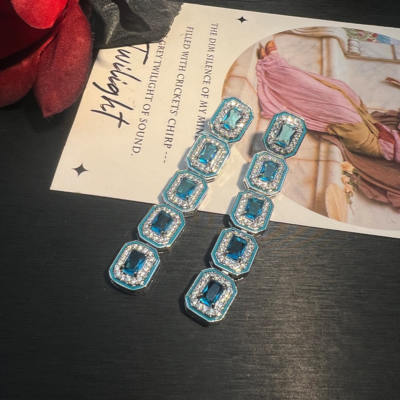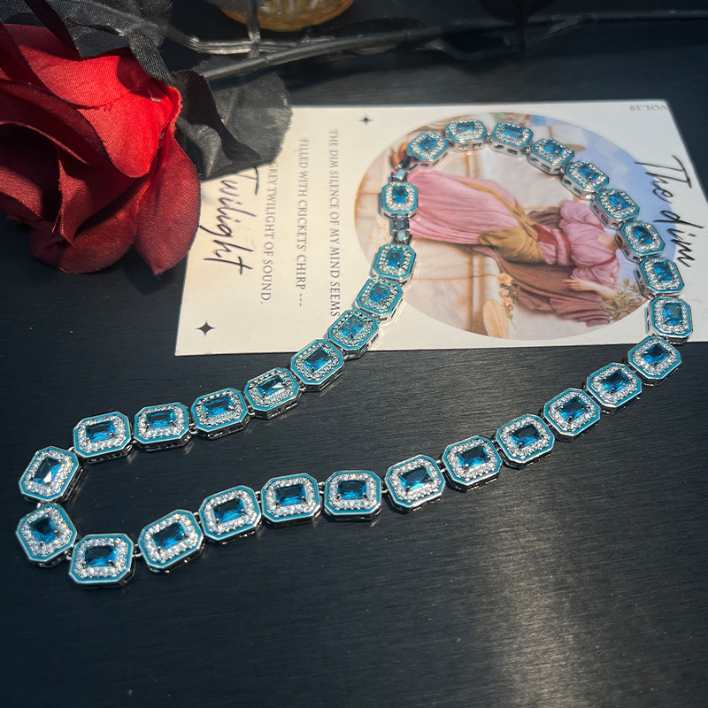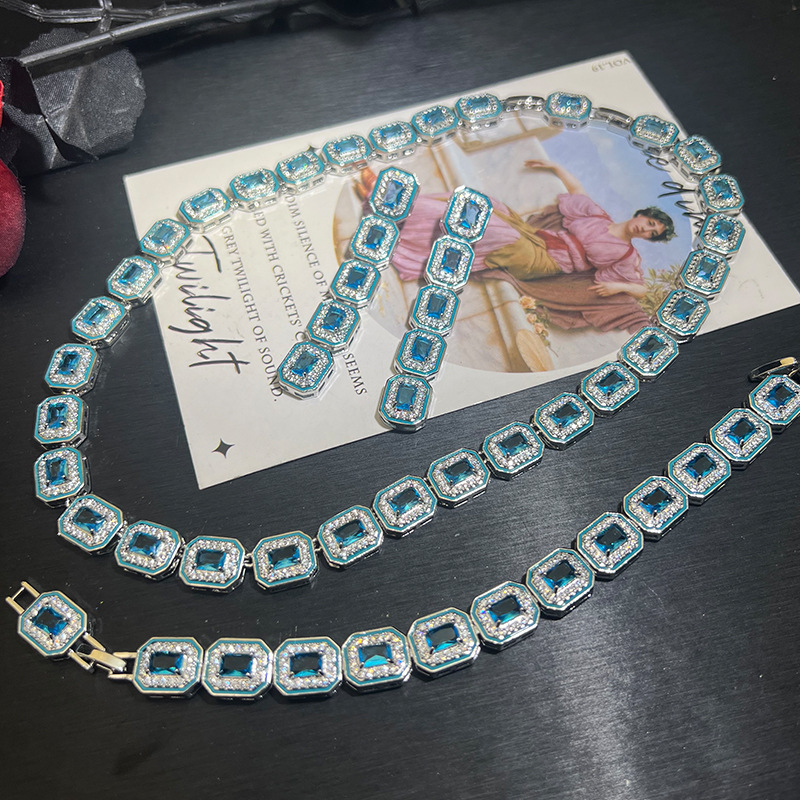 高定海宝蓝5A锆精工方形跨境热销时尚百搭重工时尚高级感项链耳饰