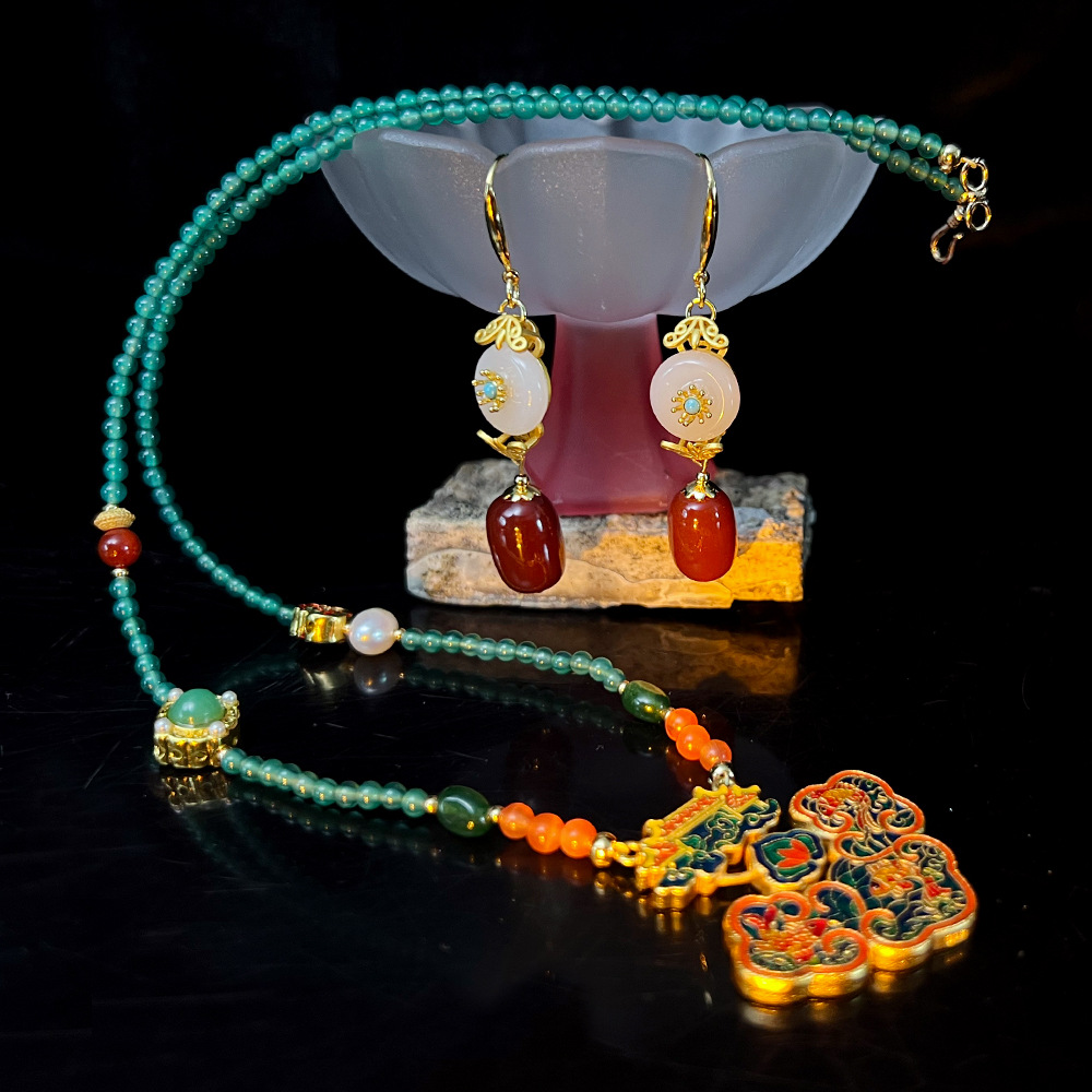 原创高端天然玛瑙猫眼石淡水珍珠沙金滴油项链 国风琉璃玛瑙耳环