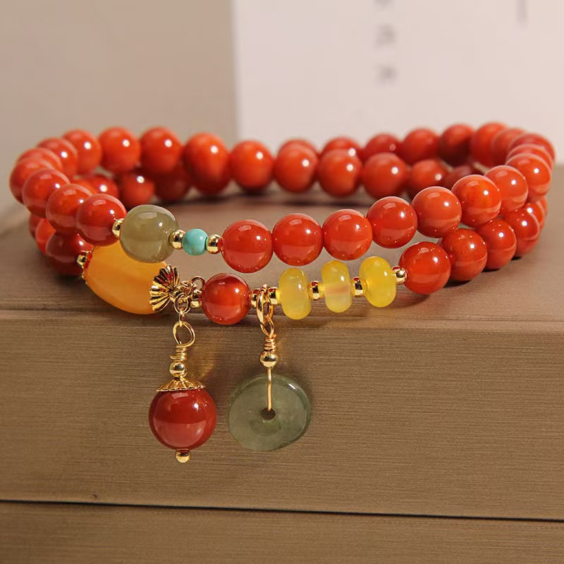 新款南红玛瑙多层手链女ins小众轻奢复古蜜蜡平安扣双圈手串闺蜜