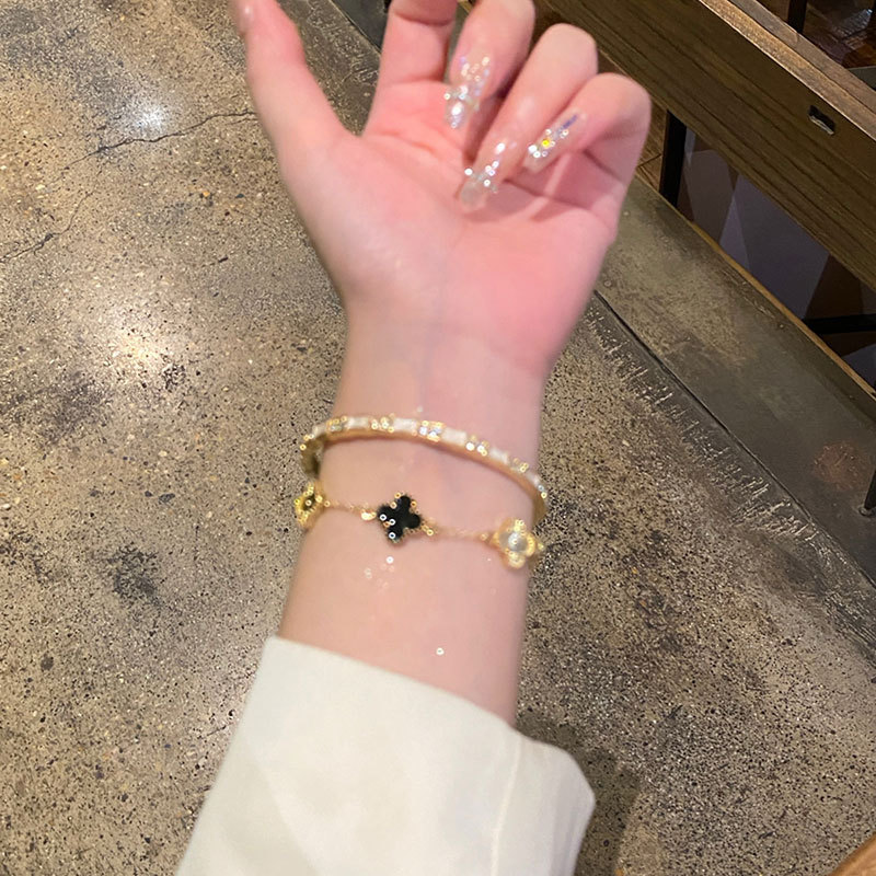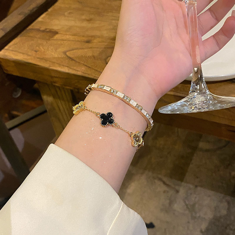 叠戴Bi入!显贵竹节猫眼石开口手镯女轻奢镭射四叶花高级气质手链