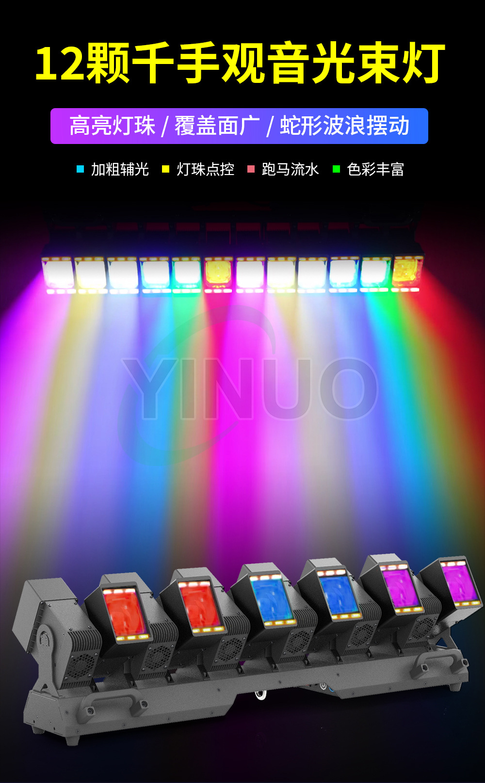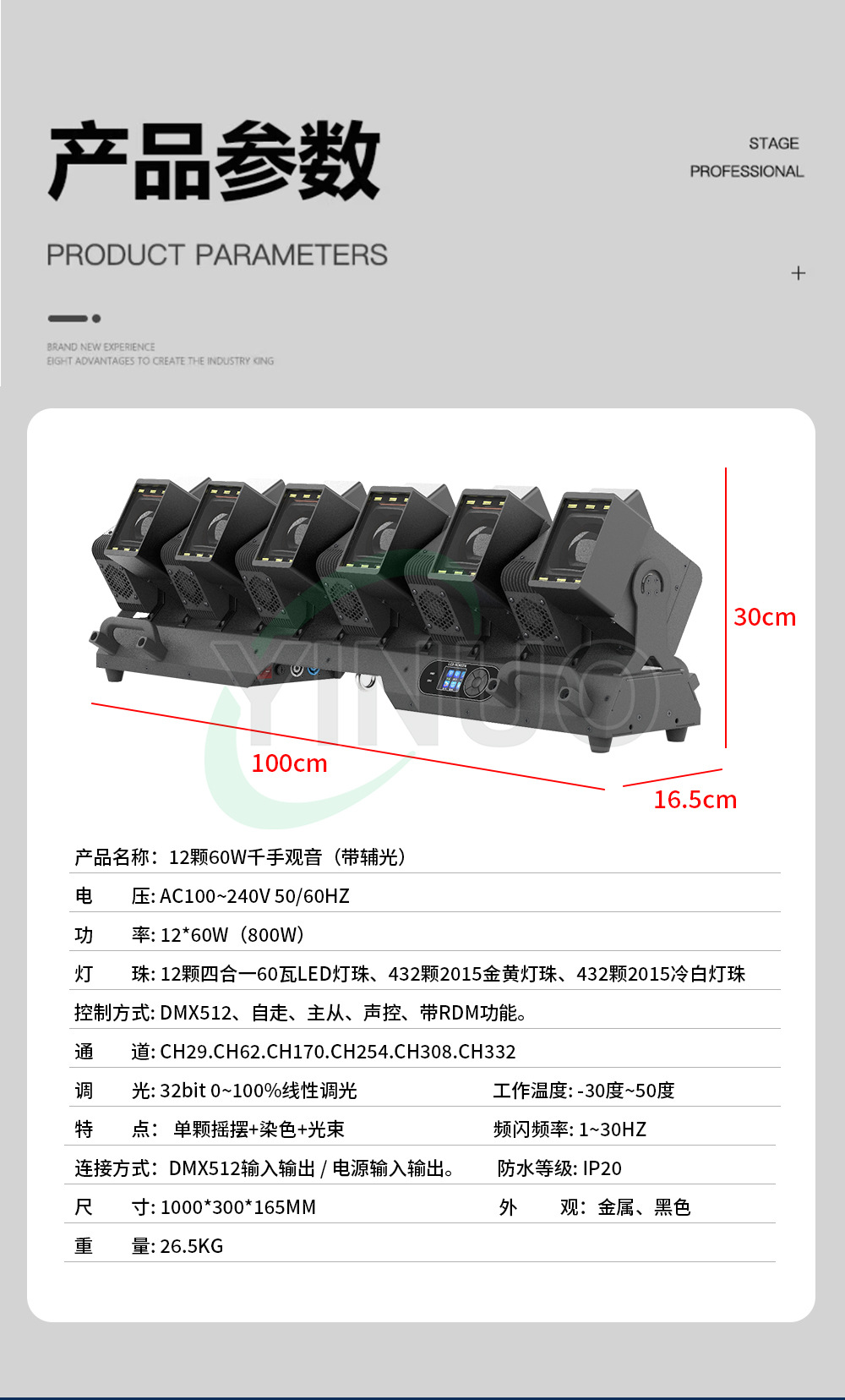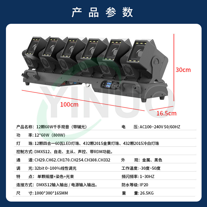 是否进口: 否 订货号: 12颗60W千手观音带辅光 加工定制: 否 货号: QSGY1260 品牌: 其他 产品类型: 矩阵灯 型号: YN-QSGY1260 防护等级: IP20 光源类型: 32bit 0~100%线性调光 光源功率: 12颗60W LED摇摆光束灯带辅光