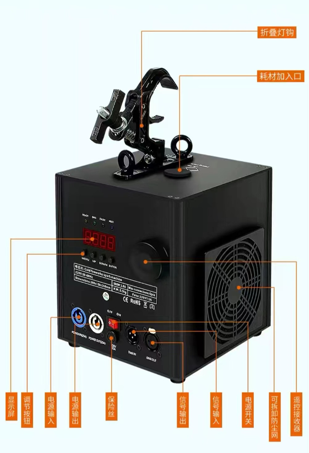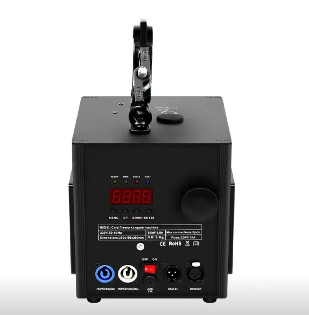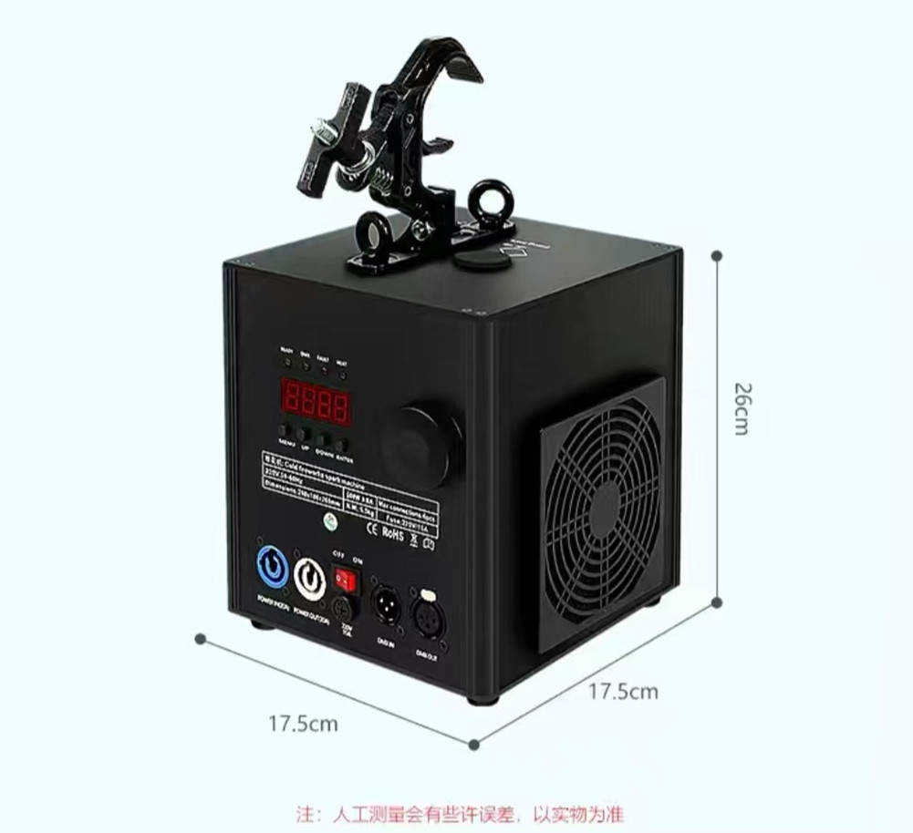 控制模式:遥控/DMX512 DMX通道:两个通道 。1通道是预热。 2通道是喷。 喷射方向:倒挂向下