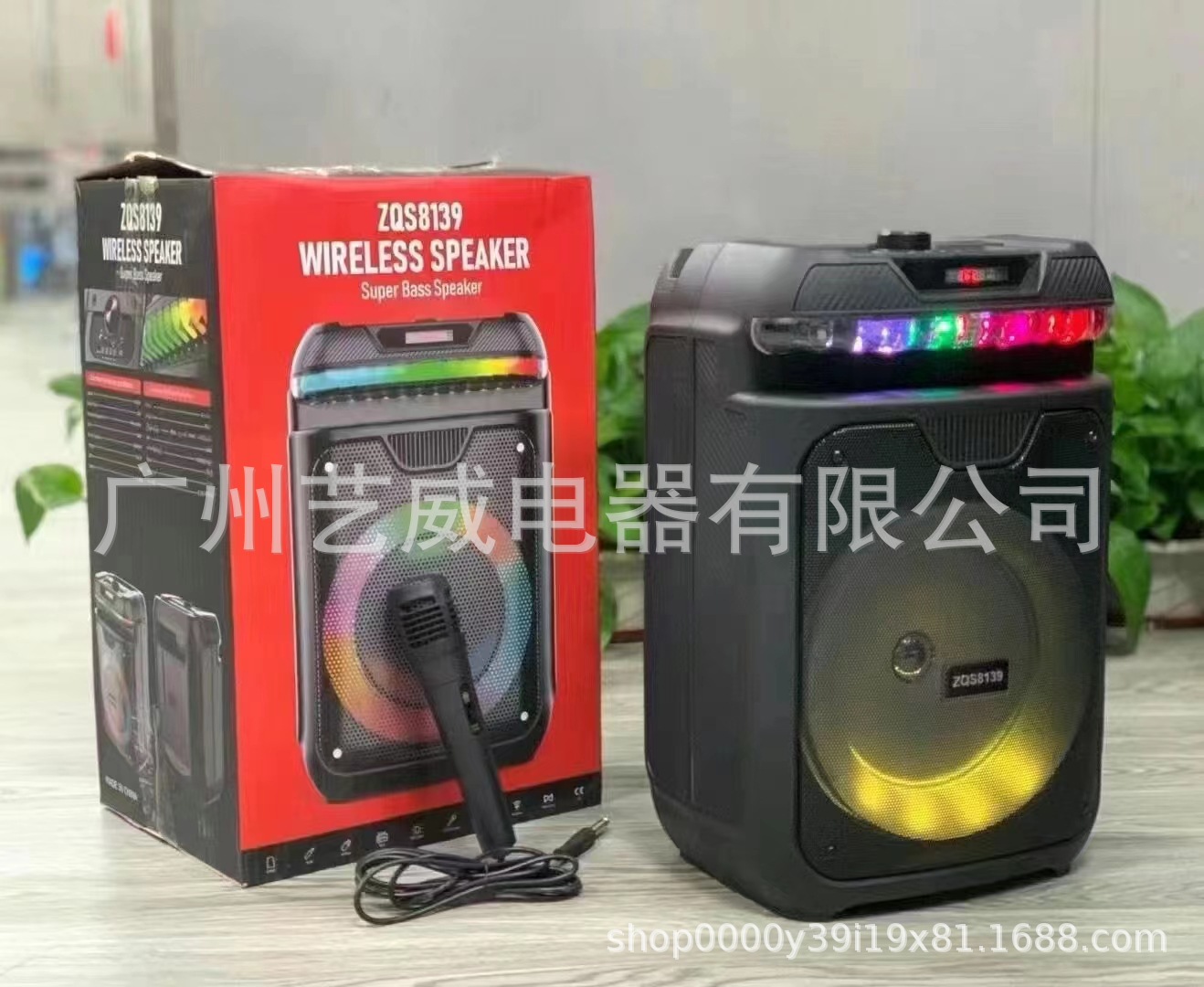 带蓝牙/带收音/带遥控功能+带USB/TF卡/MIC、DC-5V充电/带AUX(带3.5音频座)+高音、带锂电保护/电位器音量、对箱功能+USB带5V升压、带声控幻彩灯喇叭规格:8寸