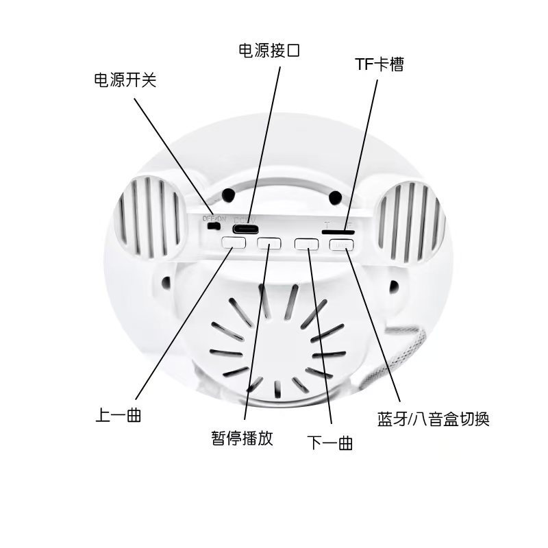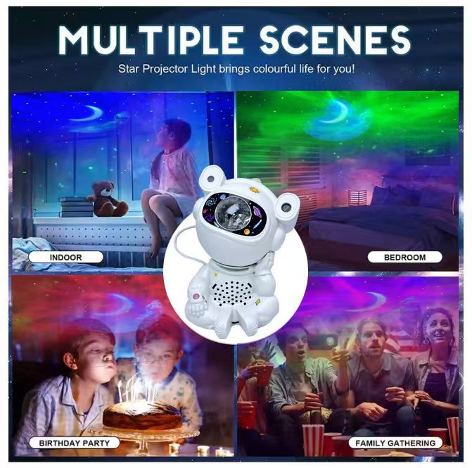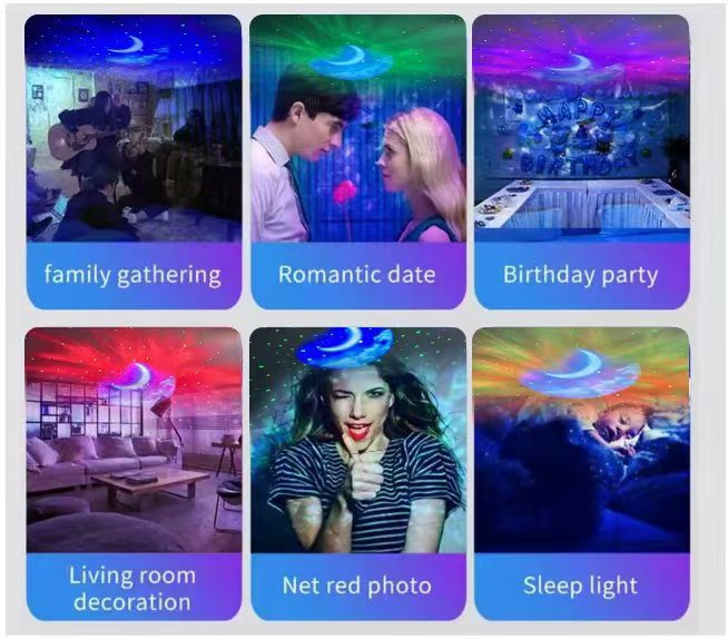 功能:可随意调整投影角度,内置3首白噪音音乐,可连接蓝牙播放音乐,可插TF卡,可遥控控制开关定时,可调整灯光效果颜色变换,可调节灯光速度快慢,切换歌曲,声音放大减弱