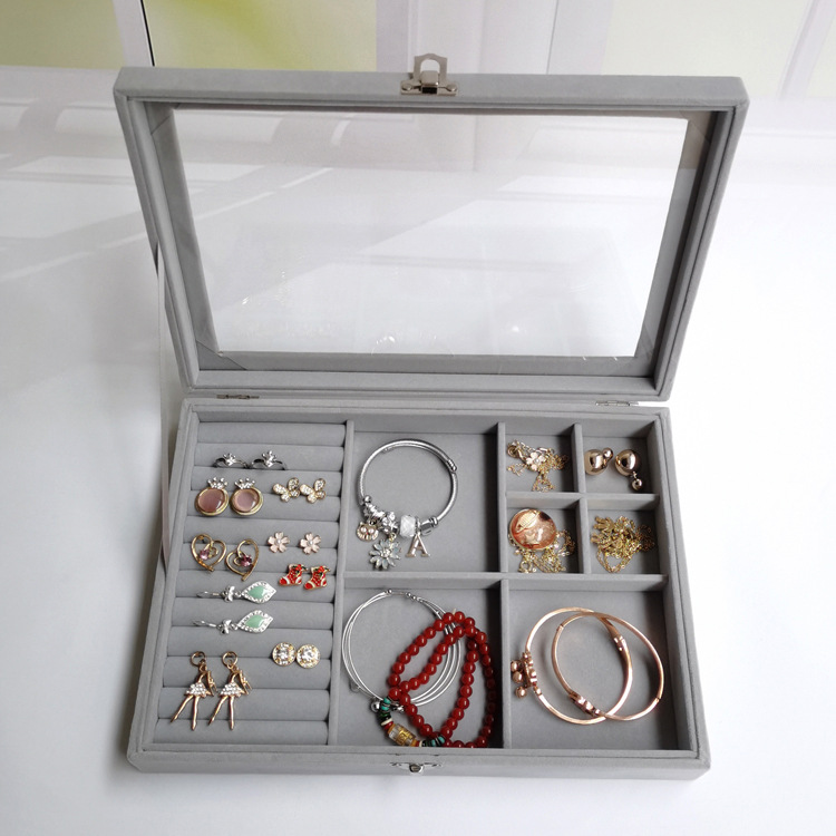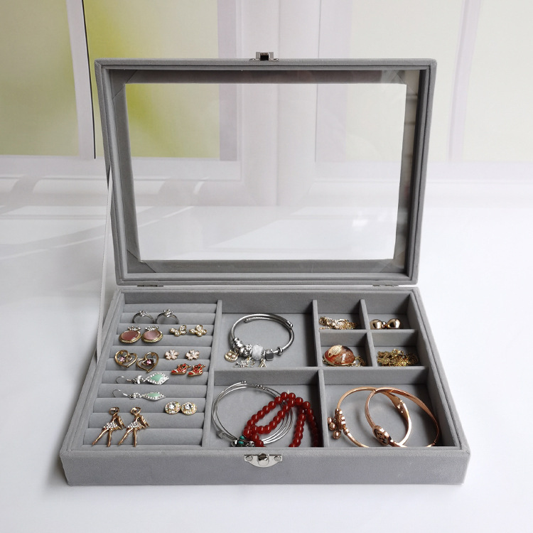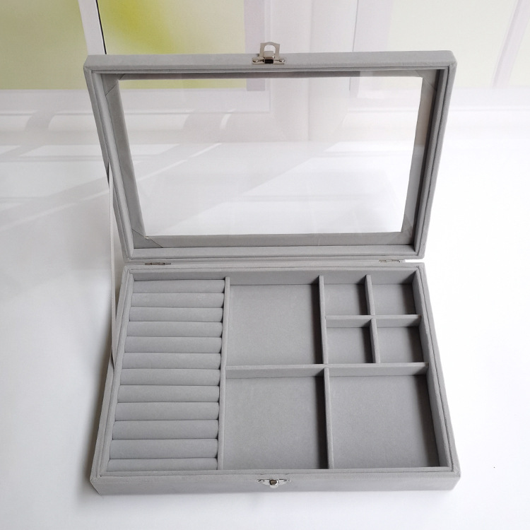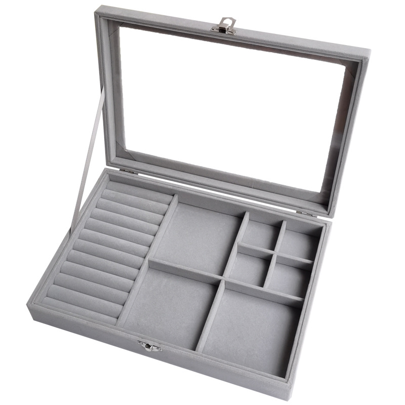 首饰盒大号翻盖多用五合一绒布防尘戒指耳环耳钉手链胸针收纳盒 English | 投诉