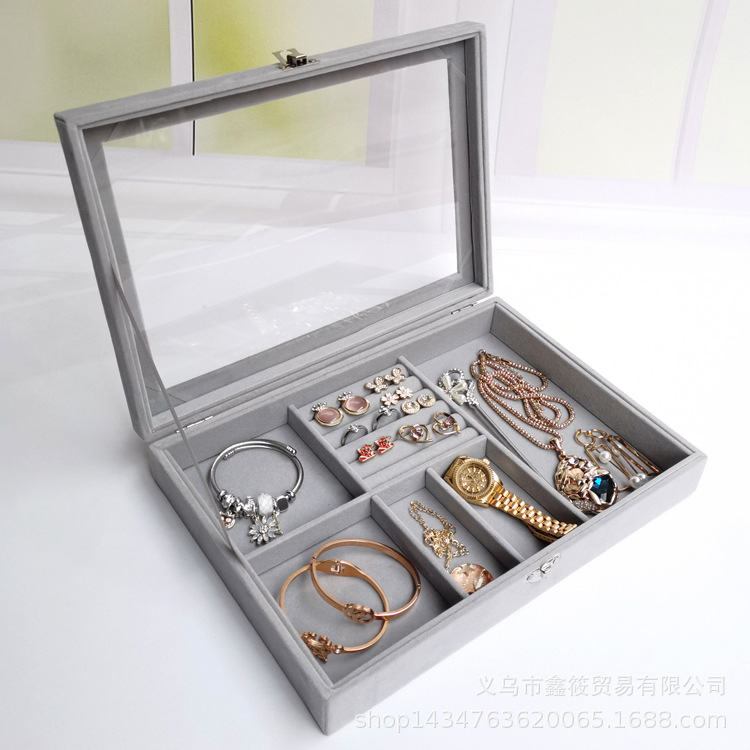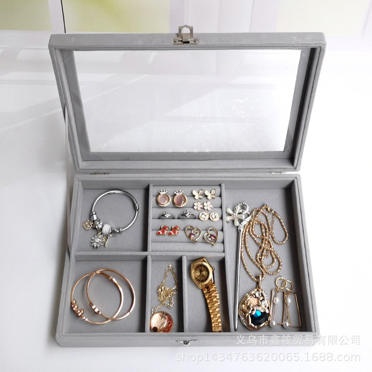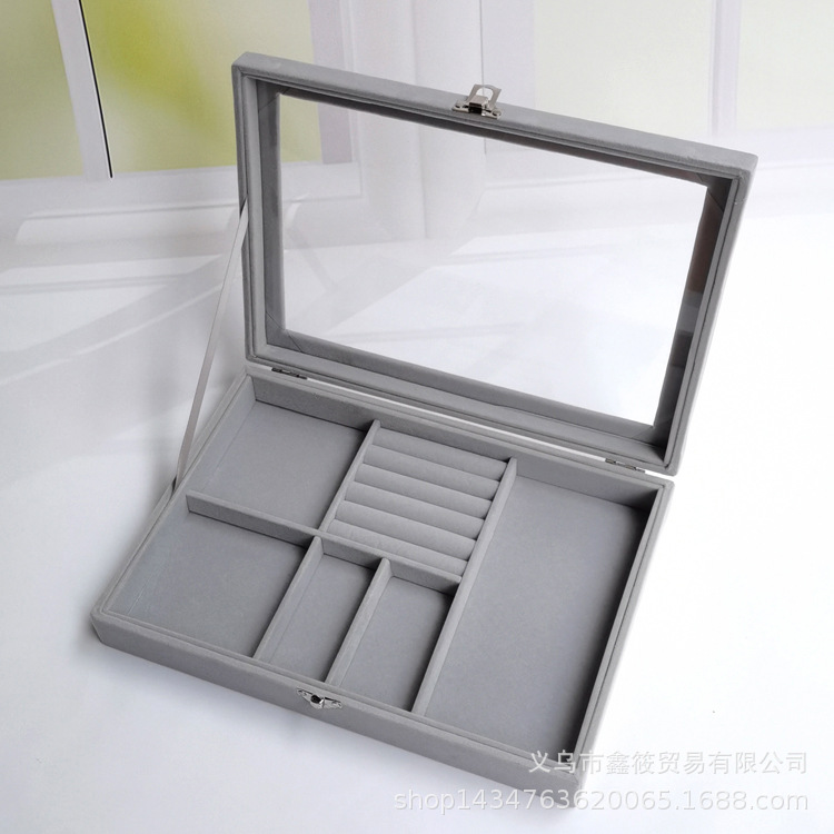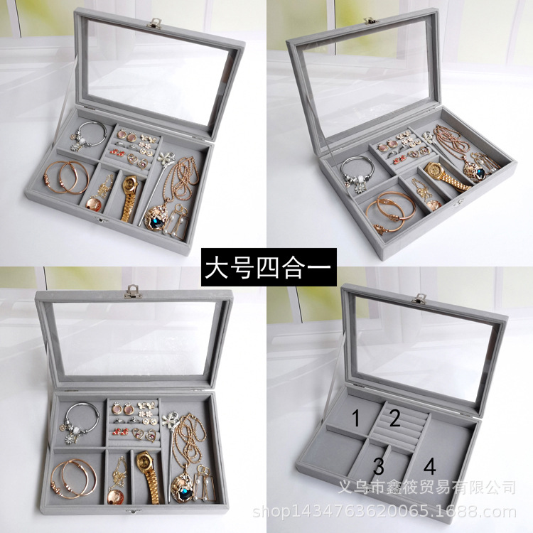 首饰盒大号翻盖多用四合一绒布防尘戒指耳环耳钉手链手表收纳盒 English | 投诉