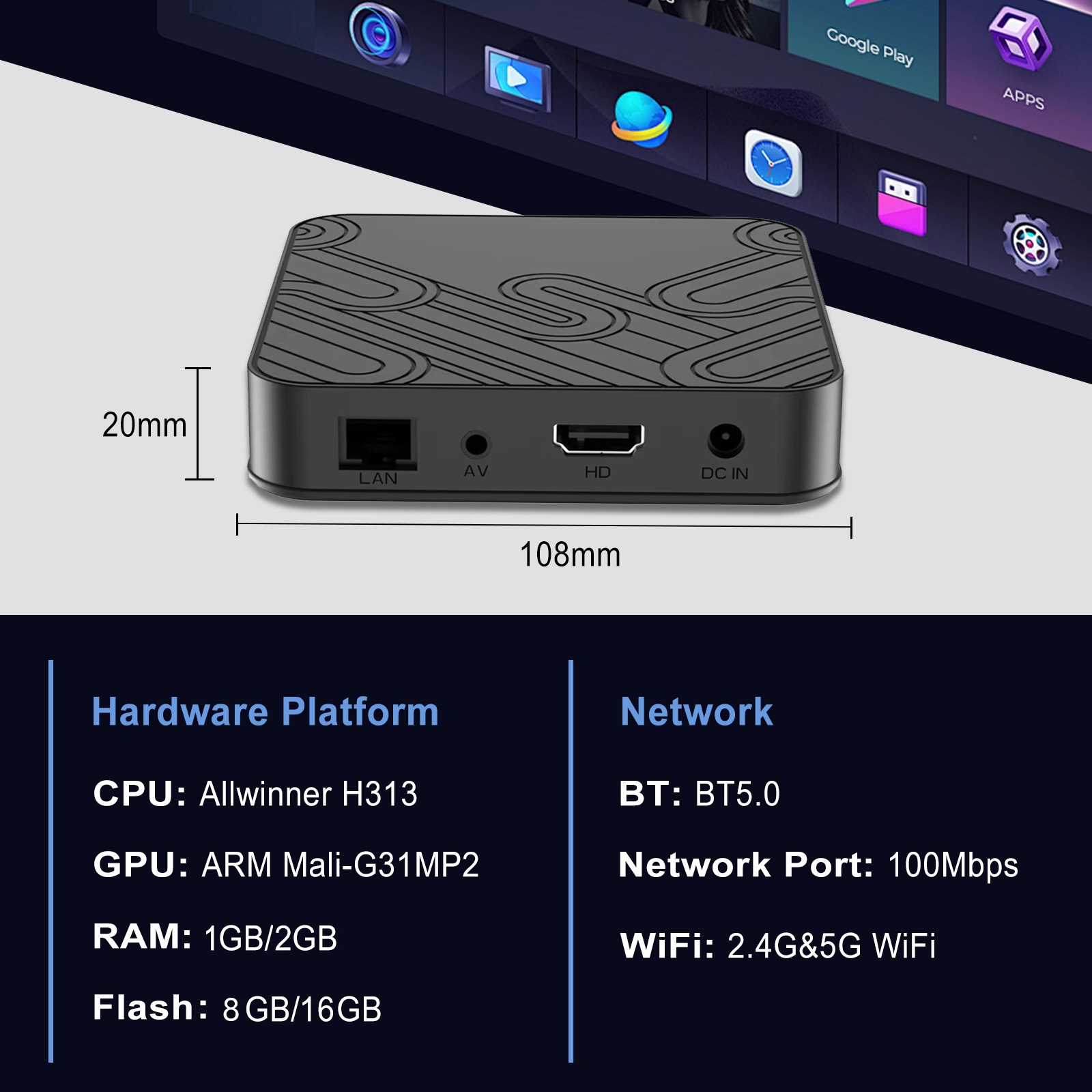 | CPU | Allwinner H313 Quad Core ARM Cor tex A53 | |||||||