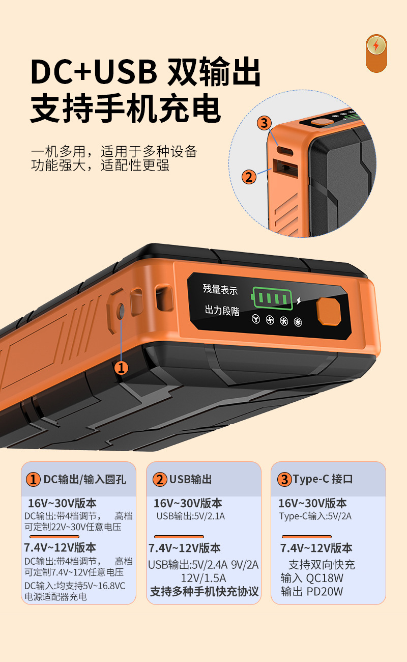 ★DC输出 7.4V~12V之间的,为2片10000mAh并联,可以保留USB快充和TYPEC快充QC18W输入+PD20W快充输出。