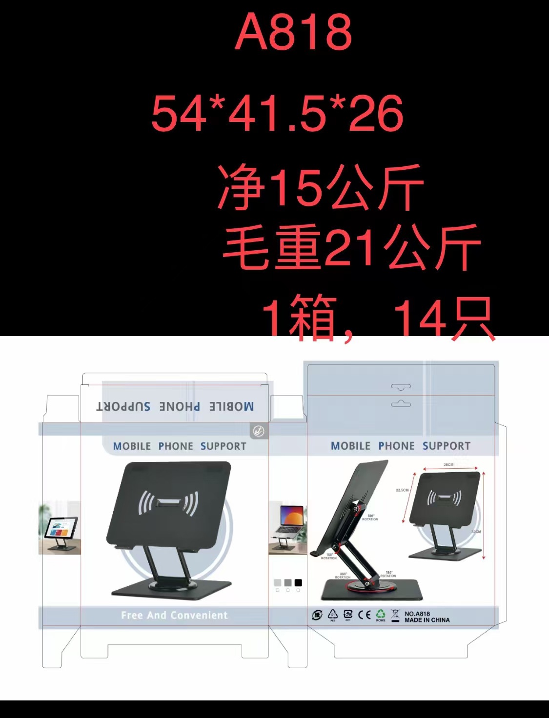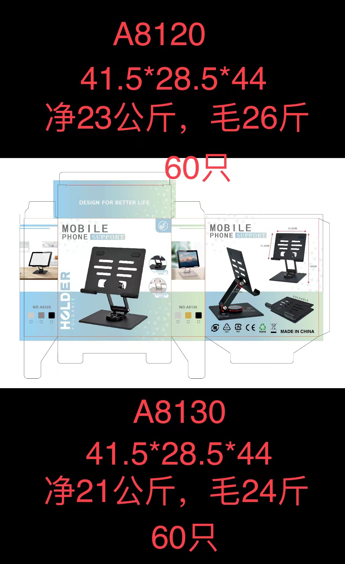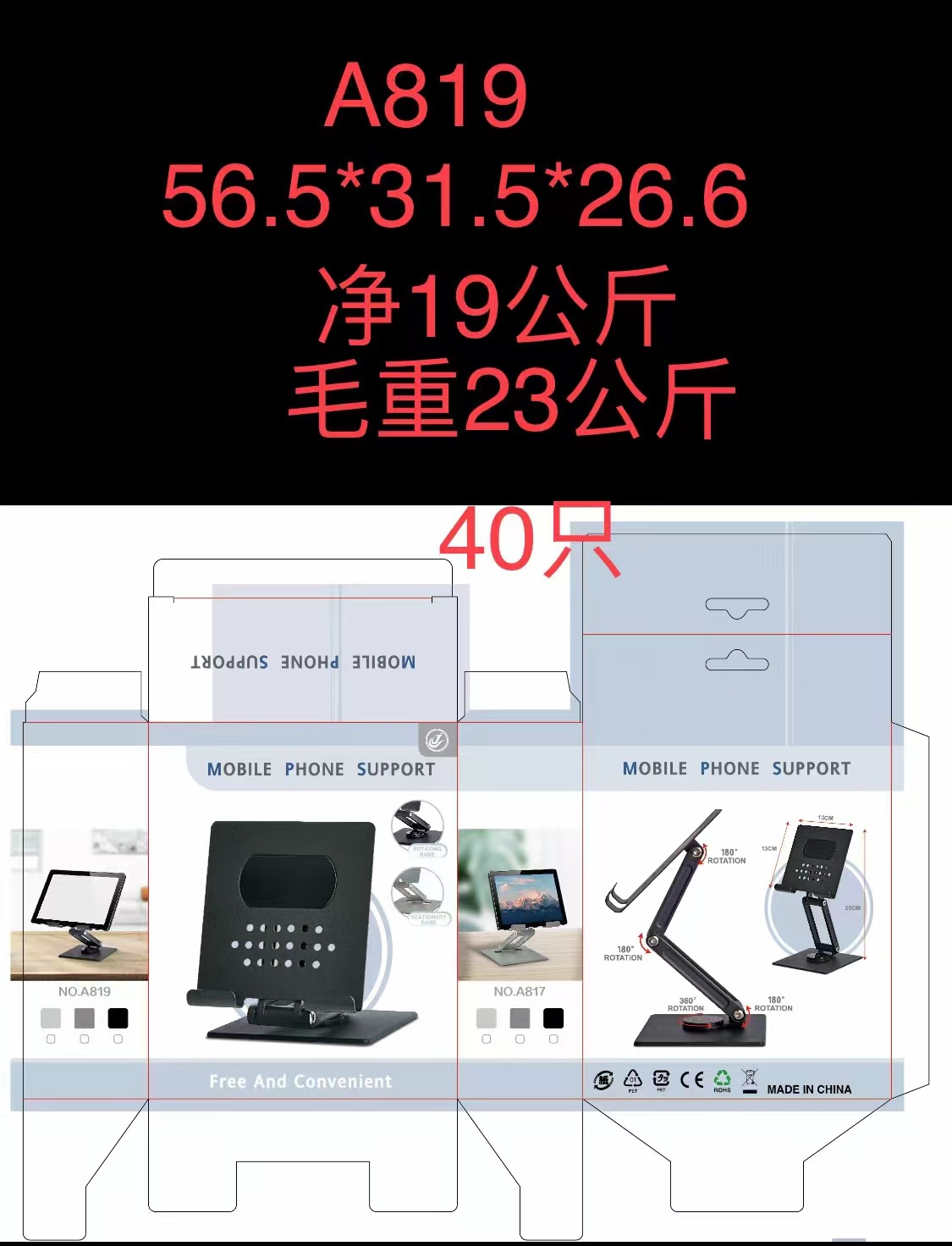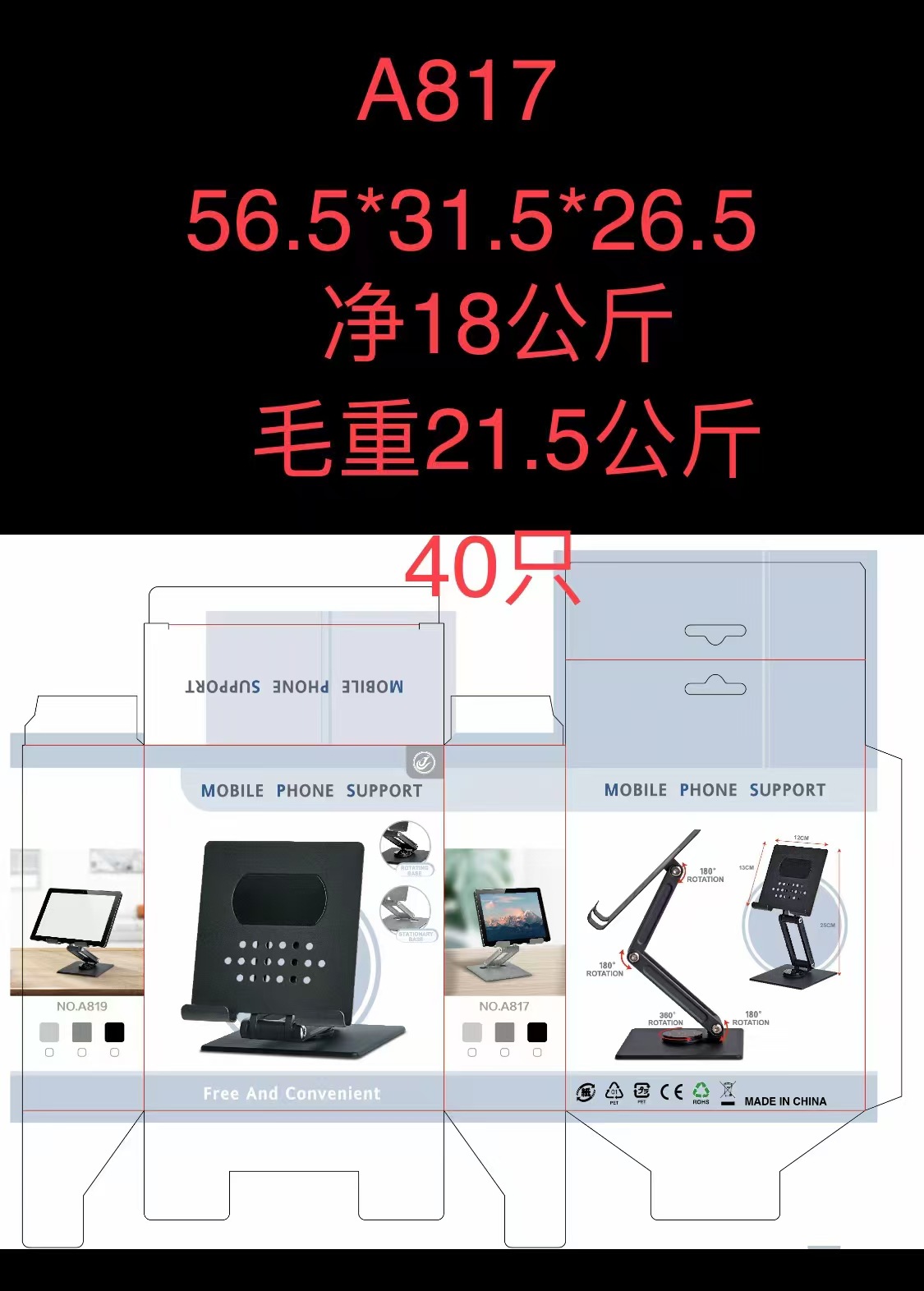 装箱资料:型号:A816 装箱数:100只,重量:21.5KG,箱规:47.5*27*42.5