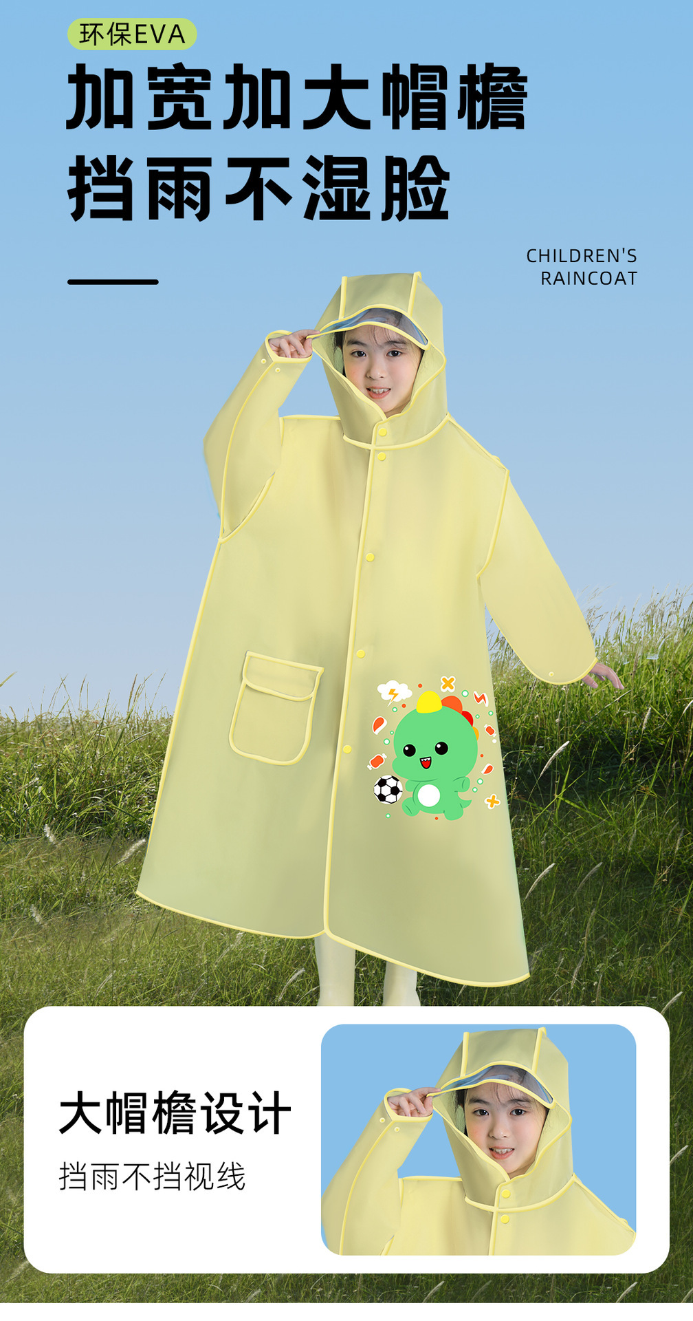 儿童雨衣 带书包位设计 环保EVA材质 男女童学生款 可爱卡通图案 English | 投诉