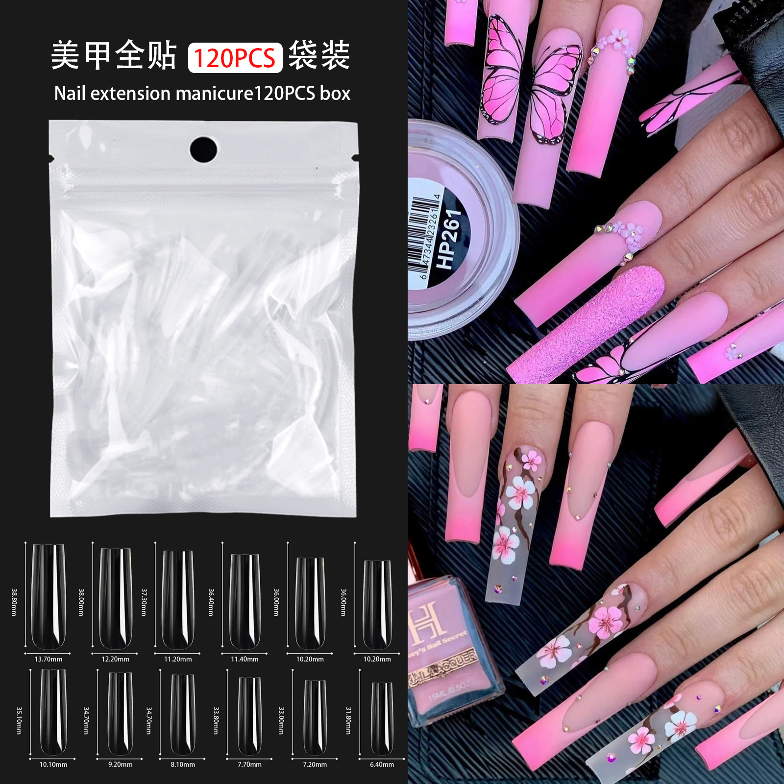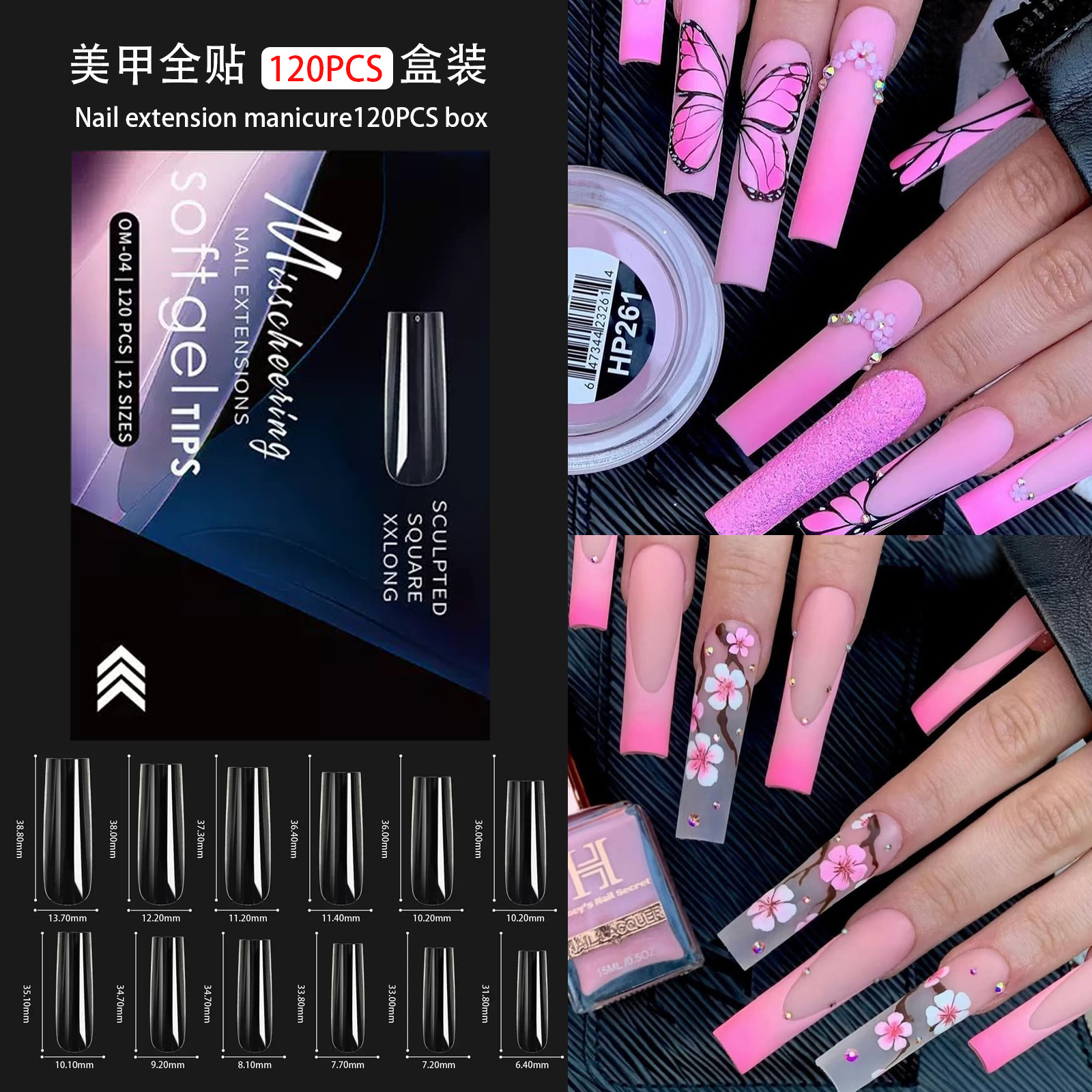 外贸款120pcs盒装穿戴甲装组合美甲片欧美ins风长款方头甲片批发