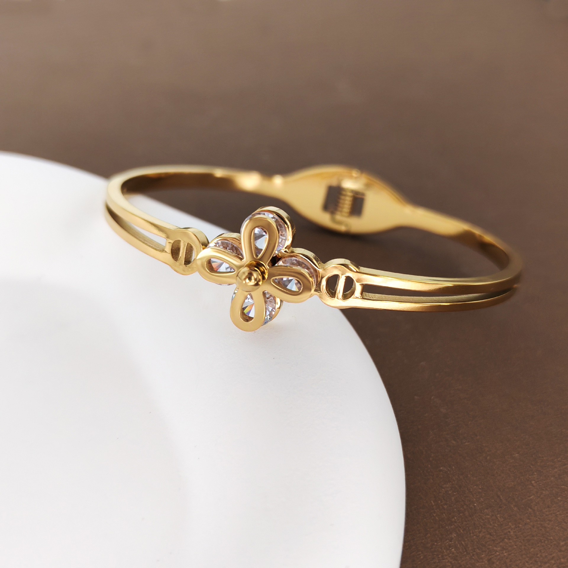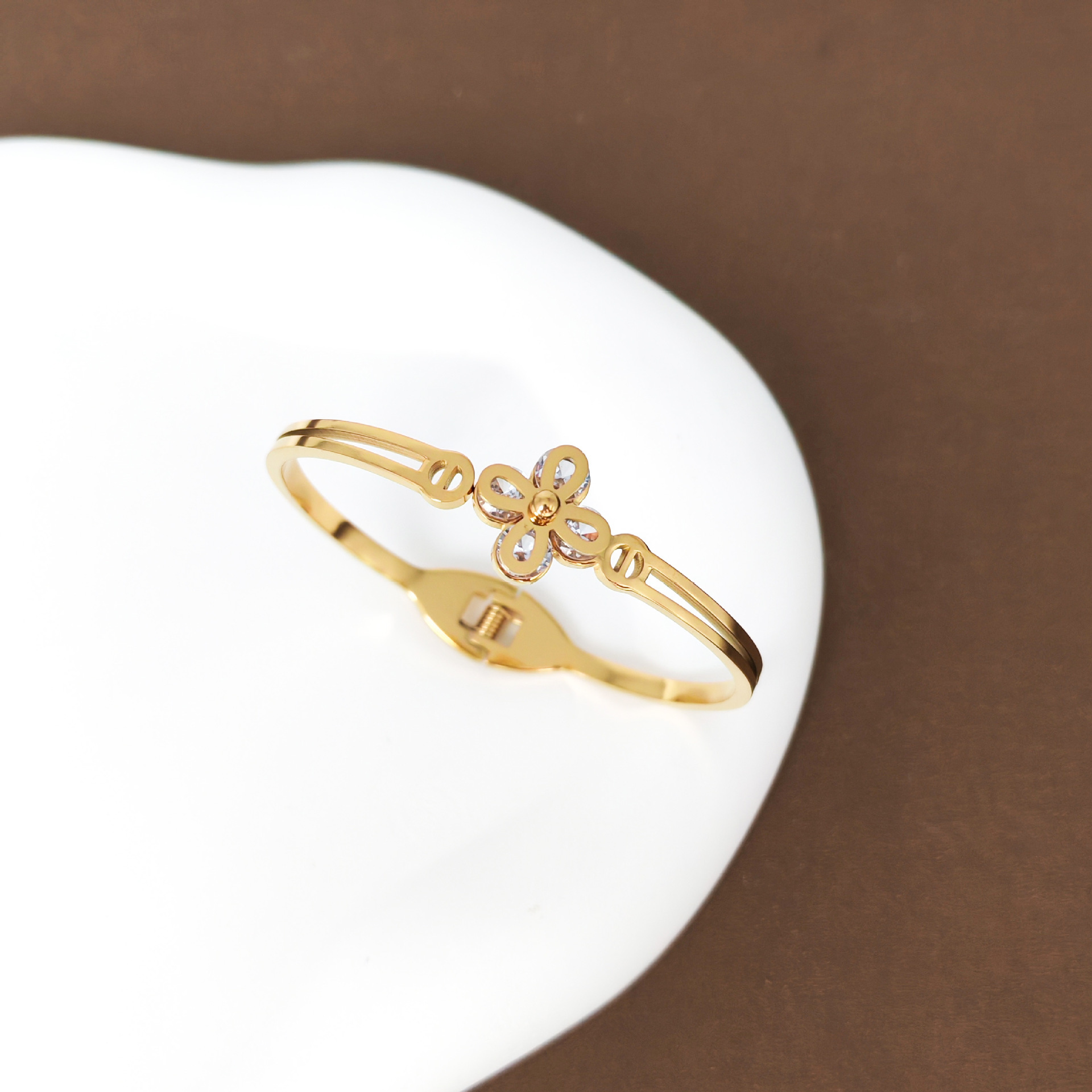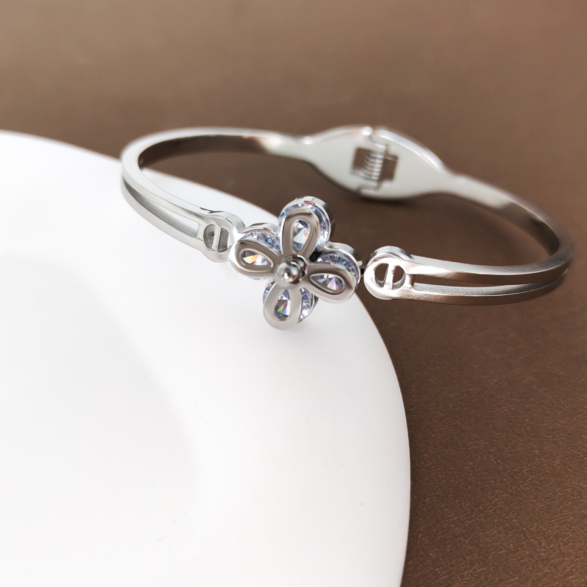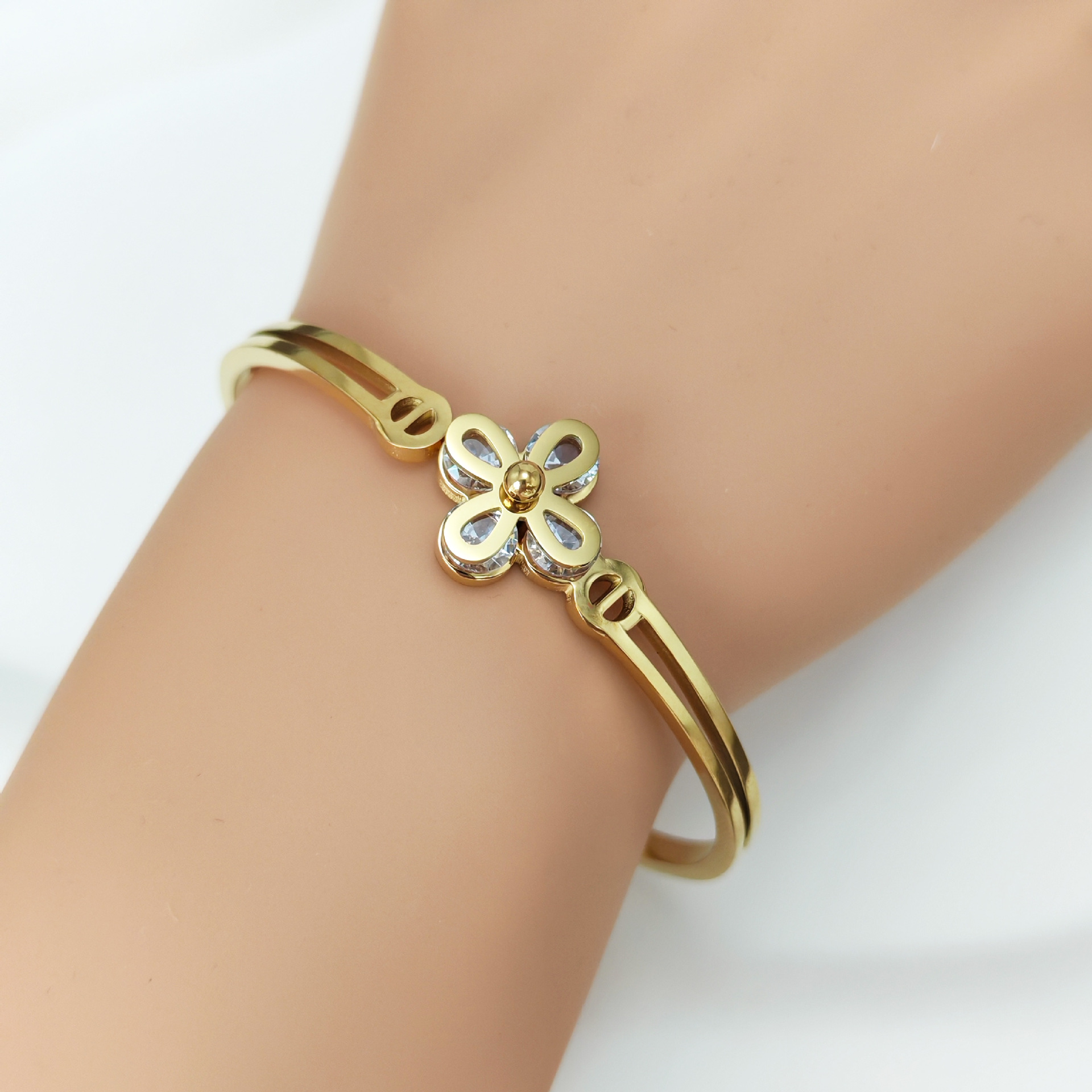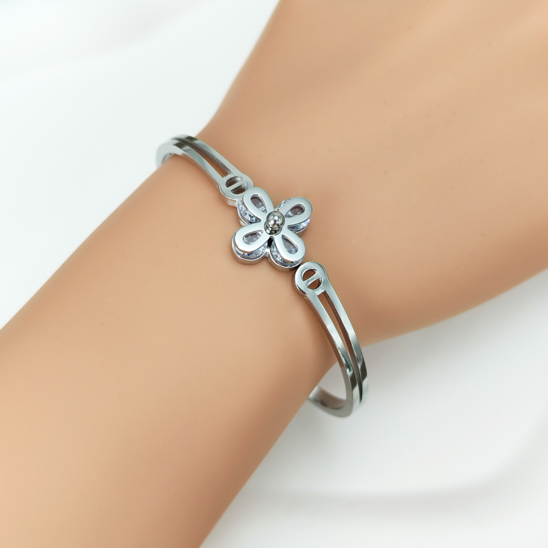 四叶花锆石手镯时尚百搭弹簧开口钛钢手环经典热卖款厂家供应 English | 投诉