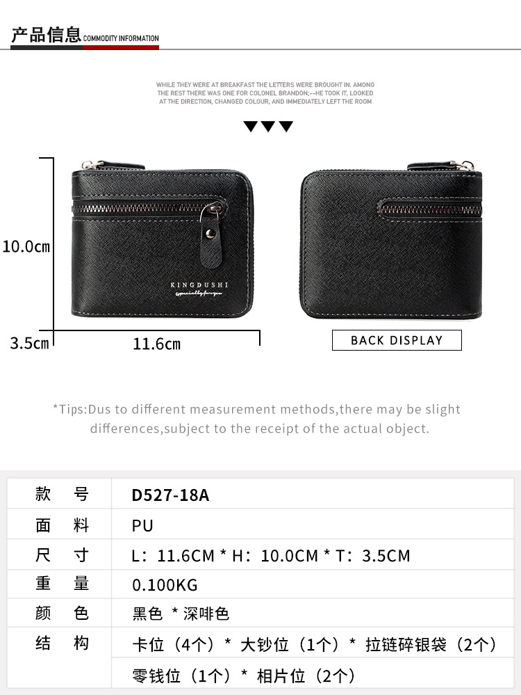 货号: D527-18A 加盟分销门槛: 无 材质: PU皮 钱夹折数: 3折 风格: 商务精英 流行元素: 字母 图案: 纯色 品牌: Kingdushi/金斗士 里料质地: 涤纶 产地: 广东新兴