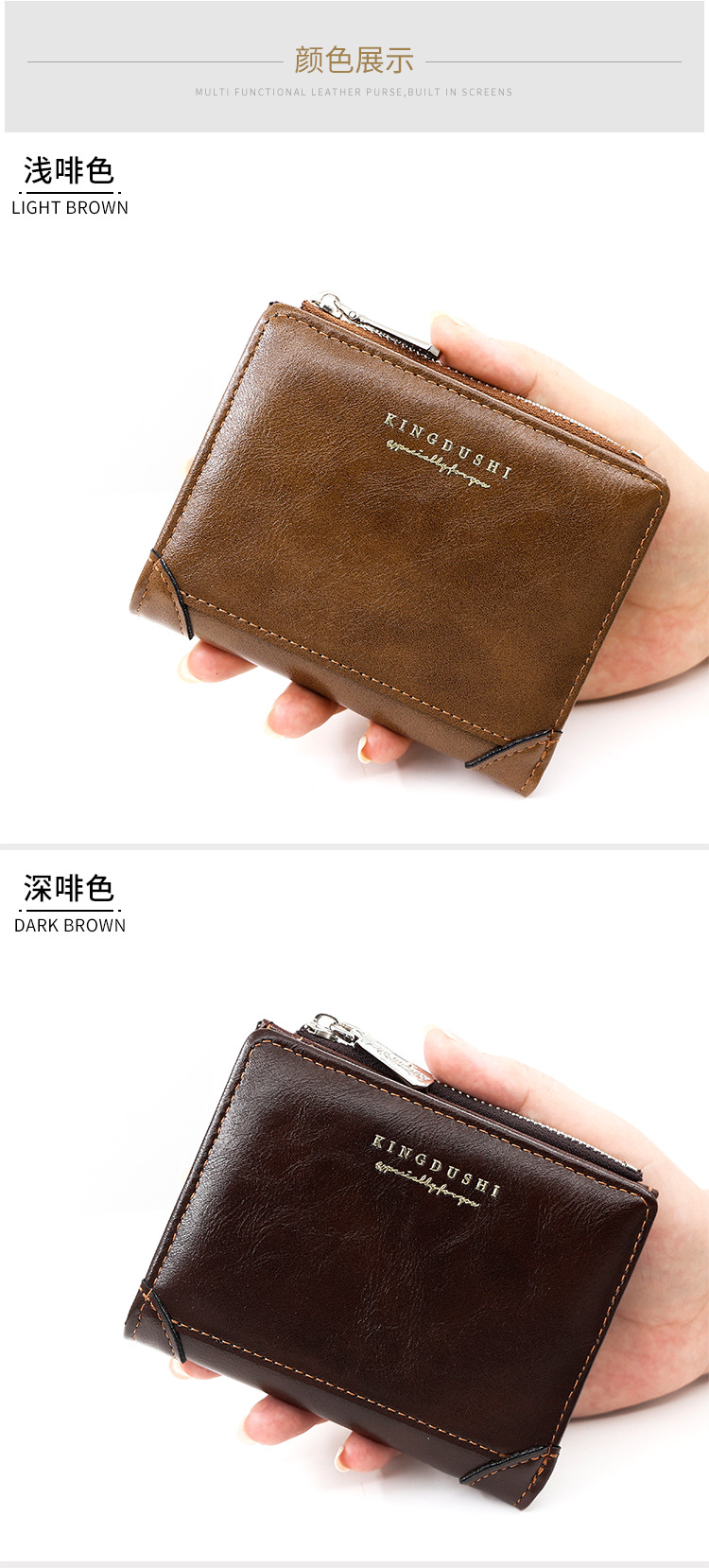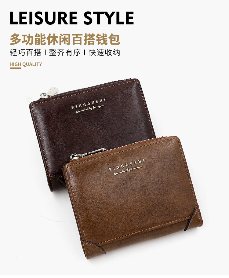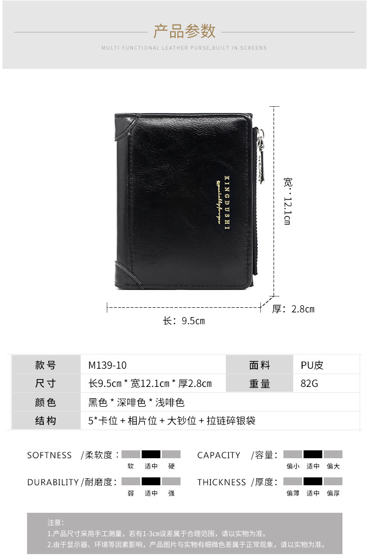 货号: M139-10 材质: pu 钱夹折数: 3折 风格: 极简静奢 流行元素: 字母 图案: 纯色 品牌: kingdushi 里料质地: 涤纶 颜色: M139-10深啡色,M139-10黑色 有可授权的自有品牌: 是