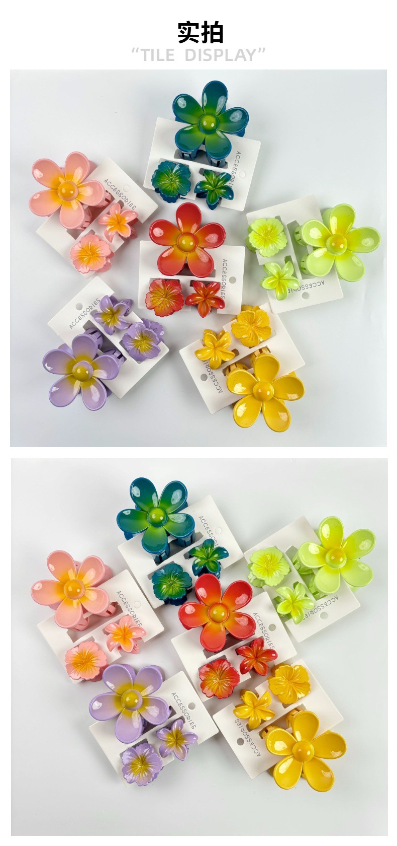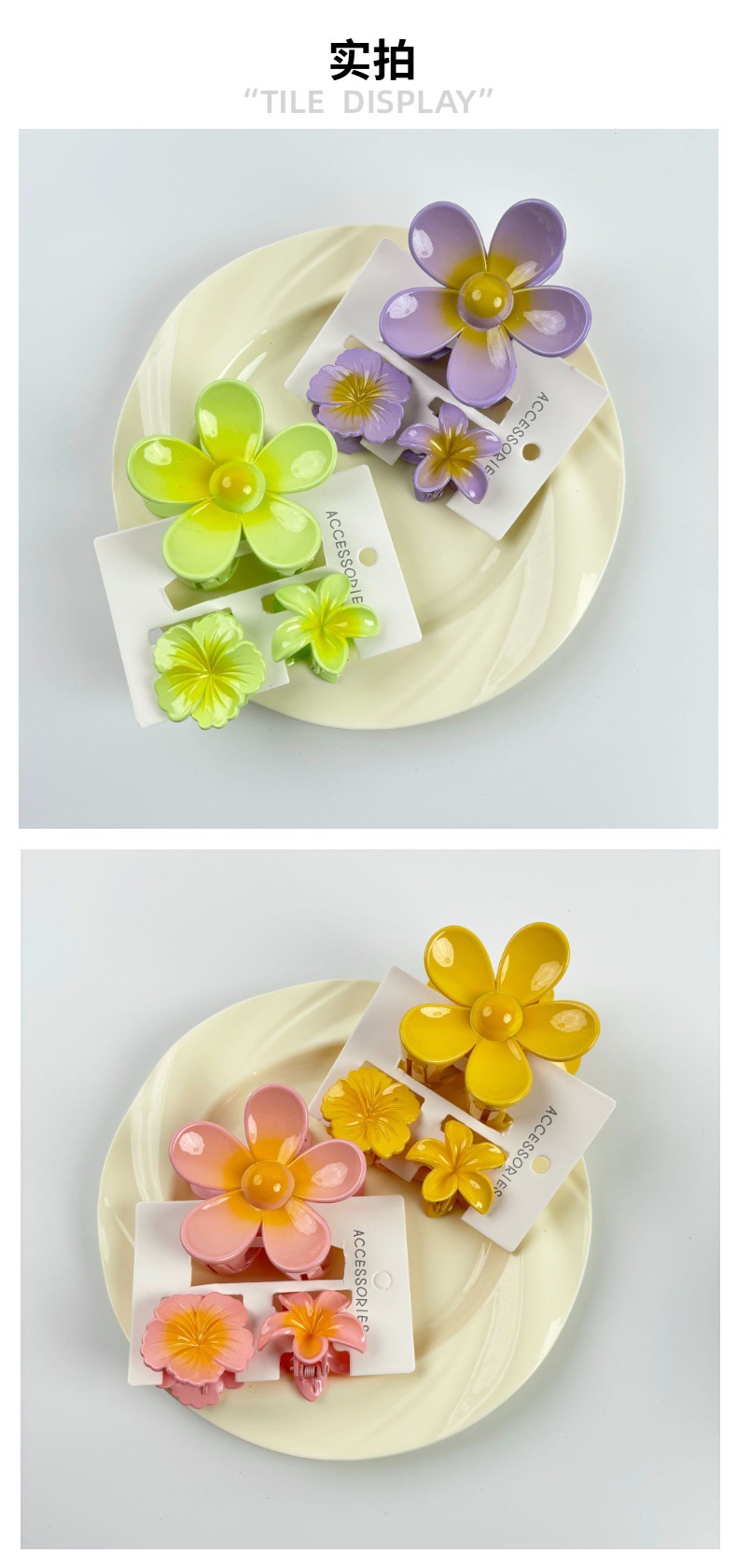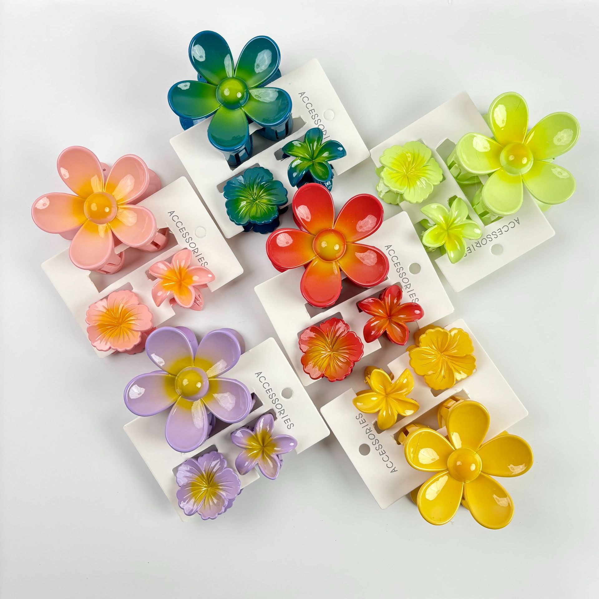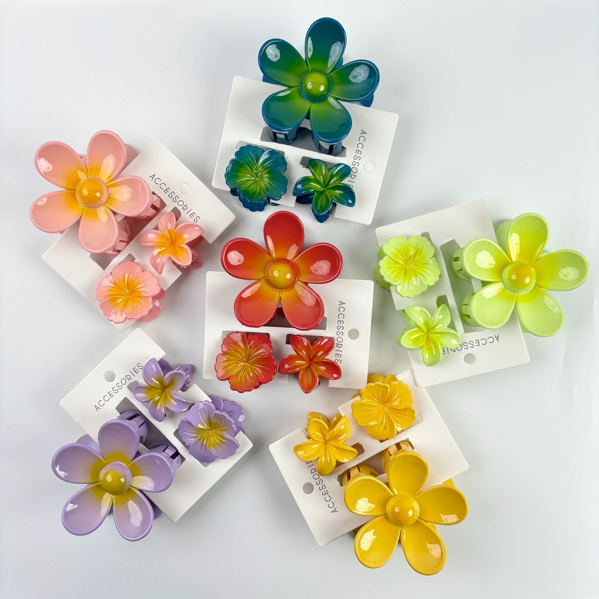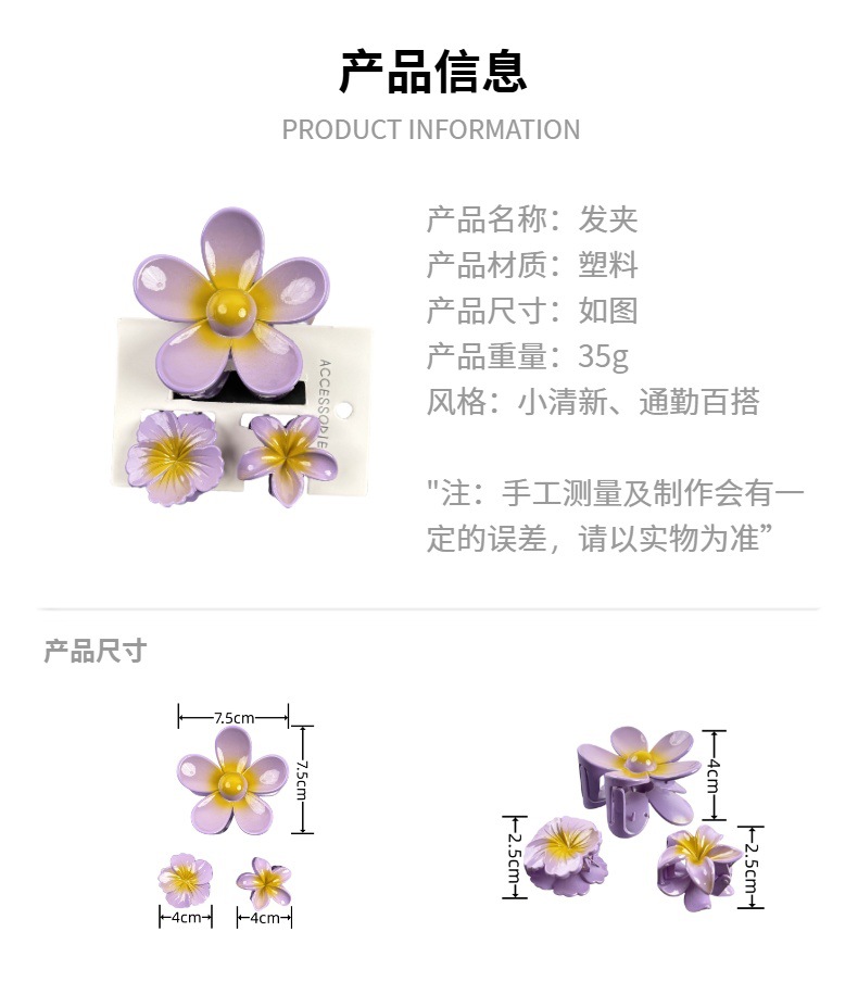 材质: 塑料/树脂 货号: 173 品牌: 无 样式: 简约,甜美,可爱,小清新 处理工艺: 烤漆 发夹分类: 抓夹 产地: 义乌 颜色: 紫色,黄色,绿色,粉色,蓝色,红色 有可授权的自有品牌: 否 是否跨境出口专供货源: 是 流行元素: 花瓣 上市年份/季节: 2024年春季 风格: 百搭 风格分类: 时尚通勤 适用人群: 女式 流行元素分类: 植物花卉 重量: 0.5 kg/个