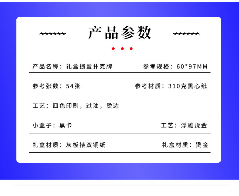 产品类别: 桌游牌 细分: 其他 品牌: 其他 材质: 塑料 规格: 6.3*8.8 货号: 001 产地: 龙港 加印LOGO: 可以 加工定制: 是 适用场景: 棋牌娱乐 颜色: 金 银 黑 彩 颜色 是否跨境出口专供货源: 否 专利类型: 无 箱装数量: 现货,200 重量: 0.5 kg/副