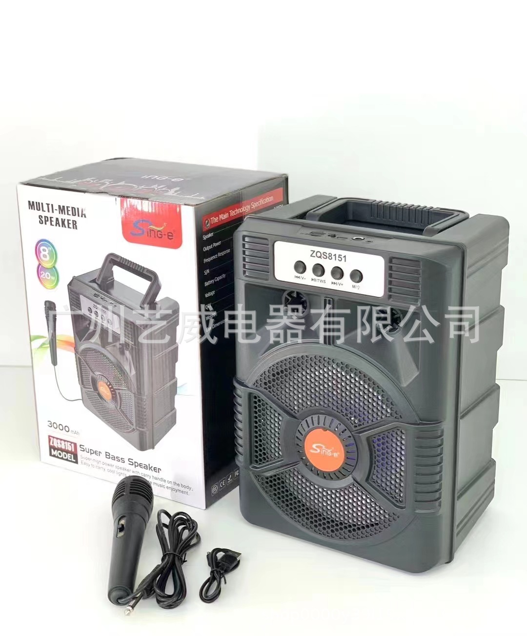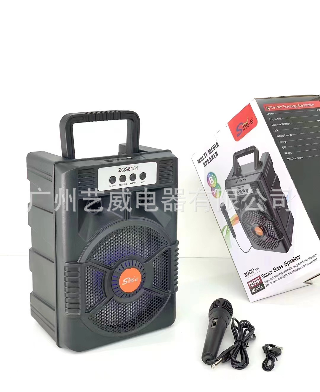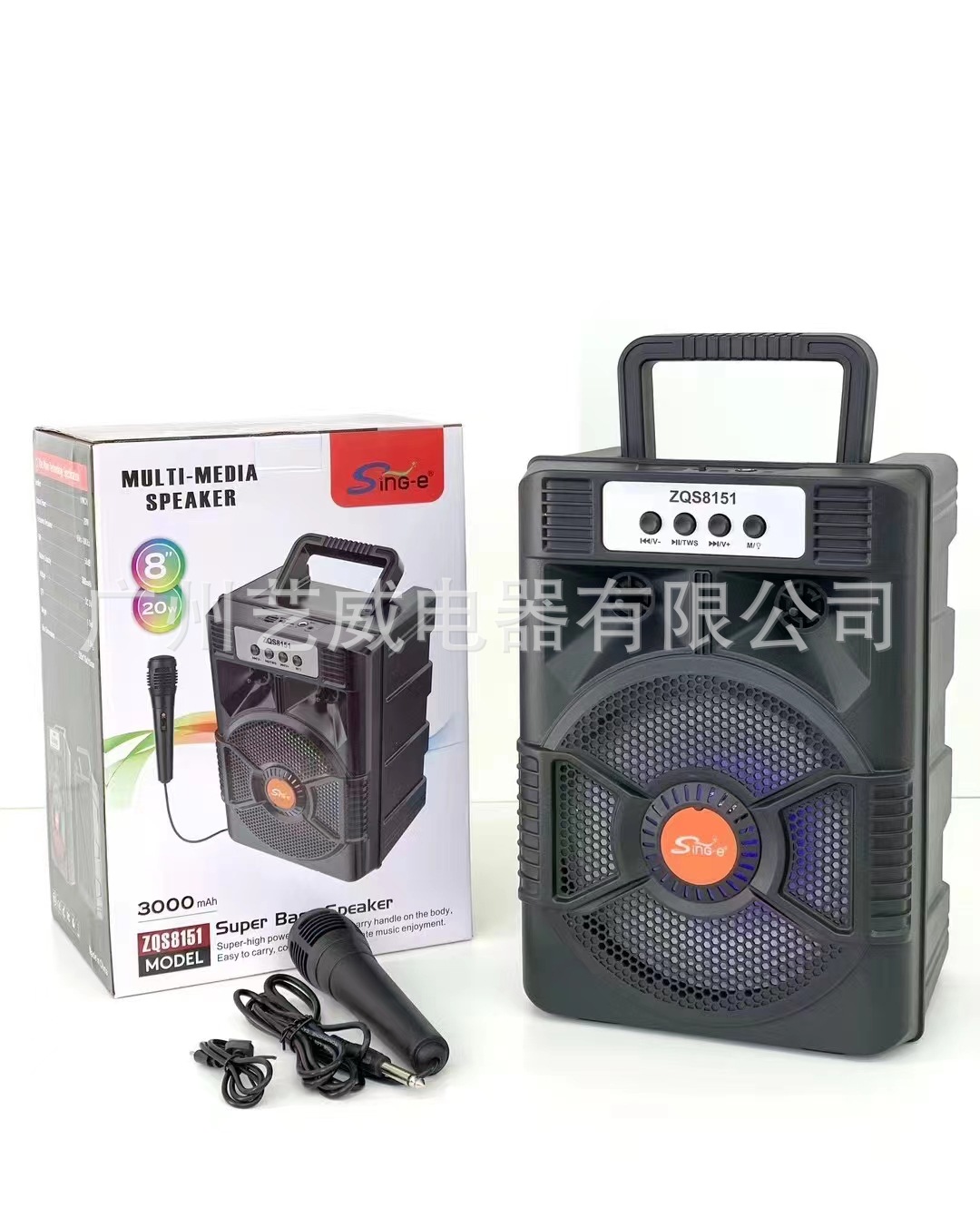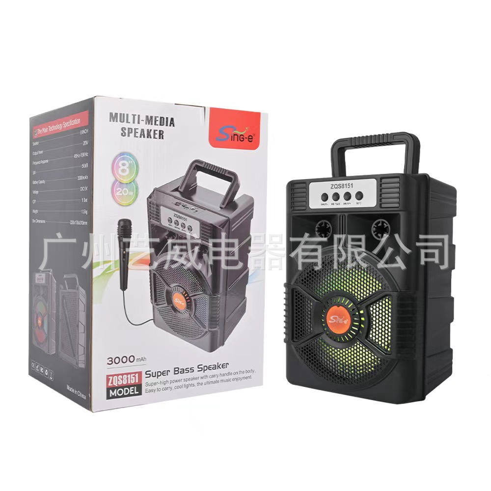 With BT/FM/USB/TF card /MIC, DC-5V charging (Type-c), USB with 5V boost+ With lithium battery protection, microphone base external installation, potentiometer volume, box function + with seven colors, seven colors are controlled by MODE