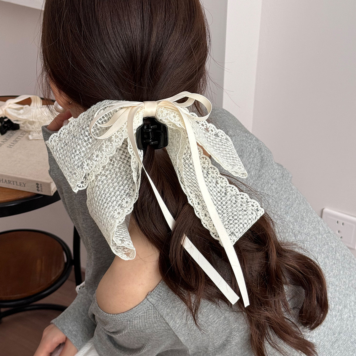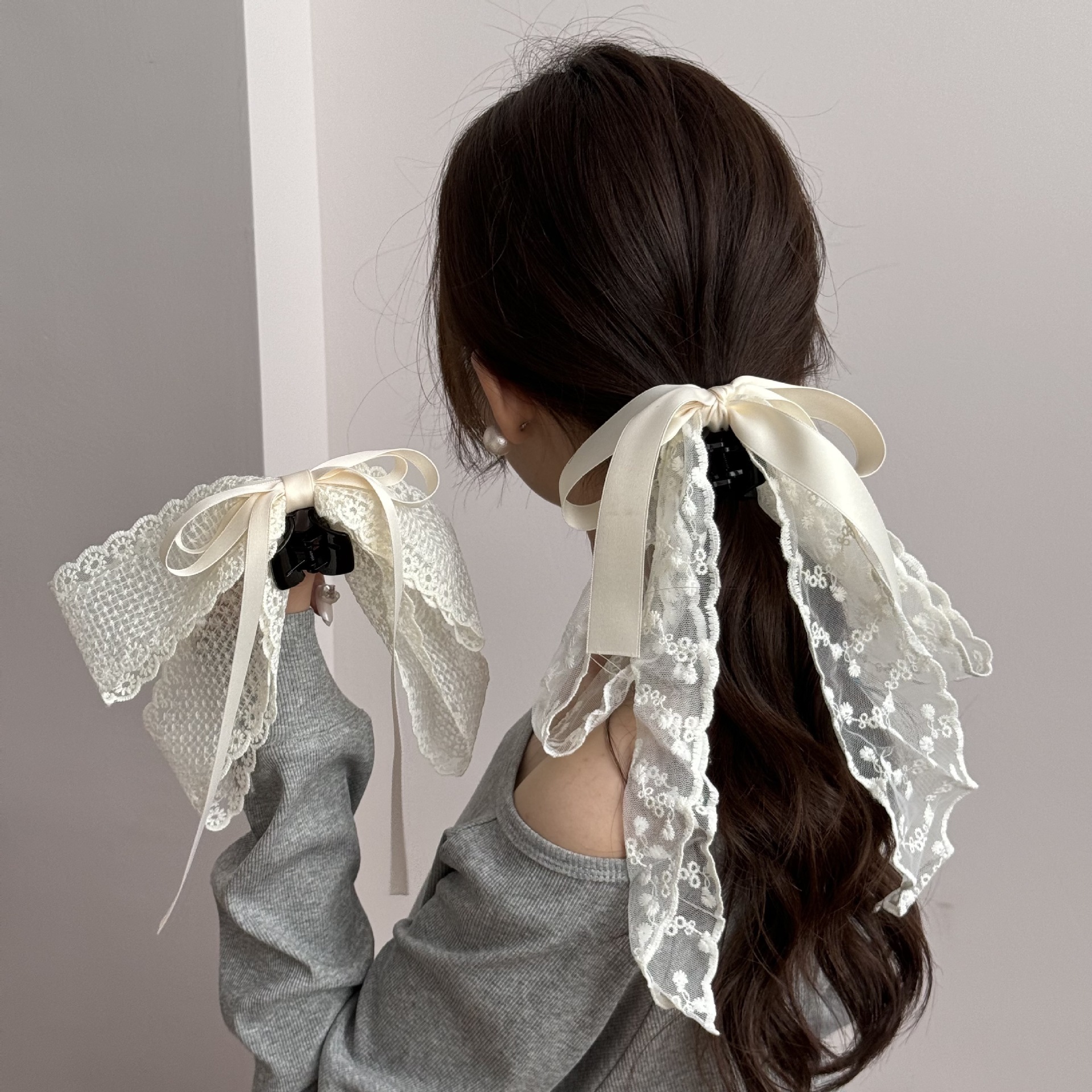 法式蕾丝蝴蝶结飘带抓夹女夏季半扎发后脑勺盘发发夹气质马尾夹子